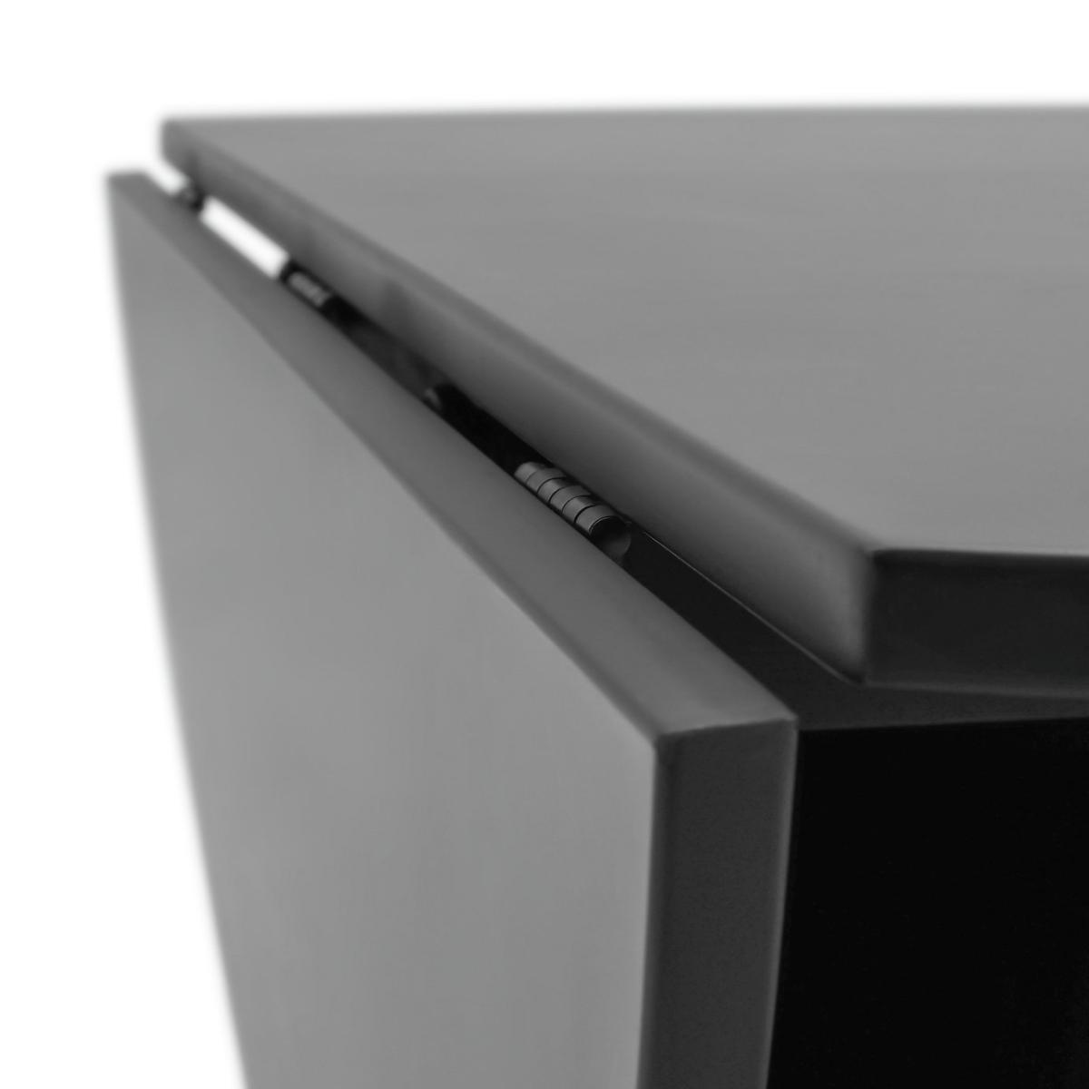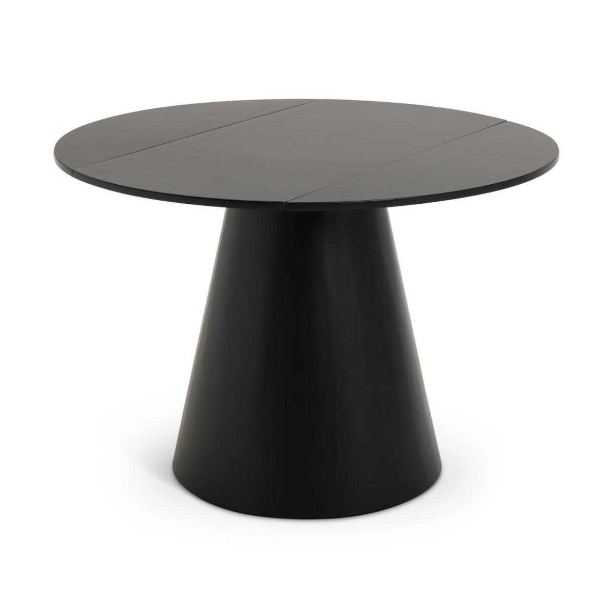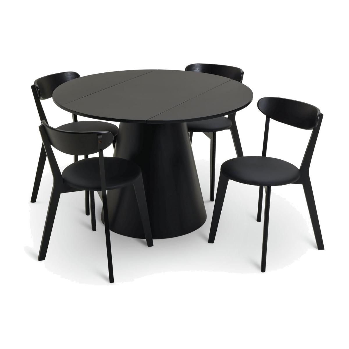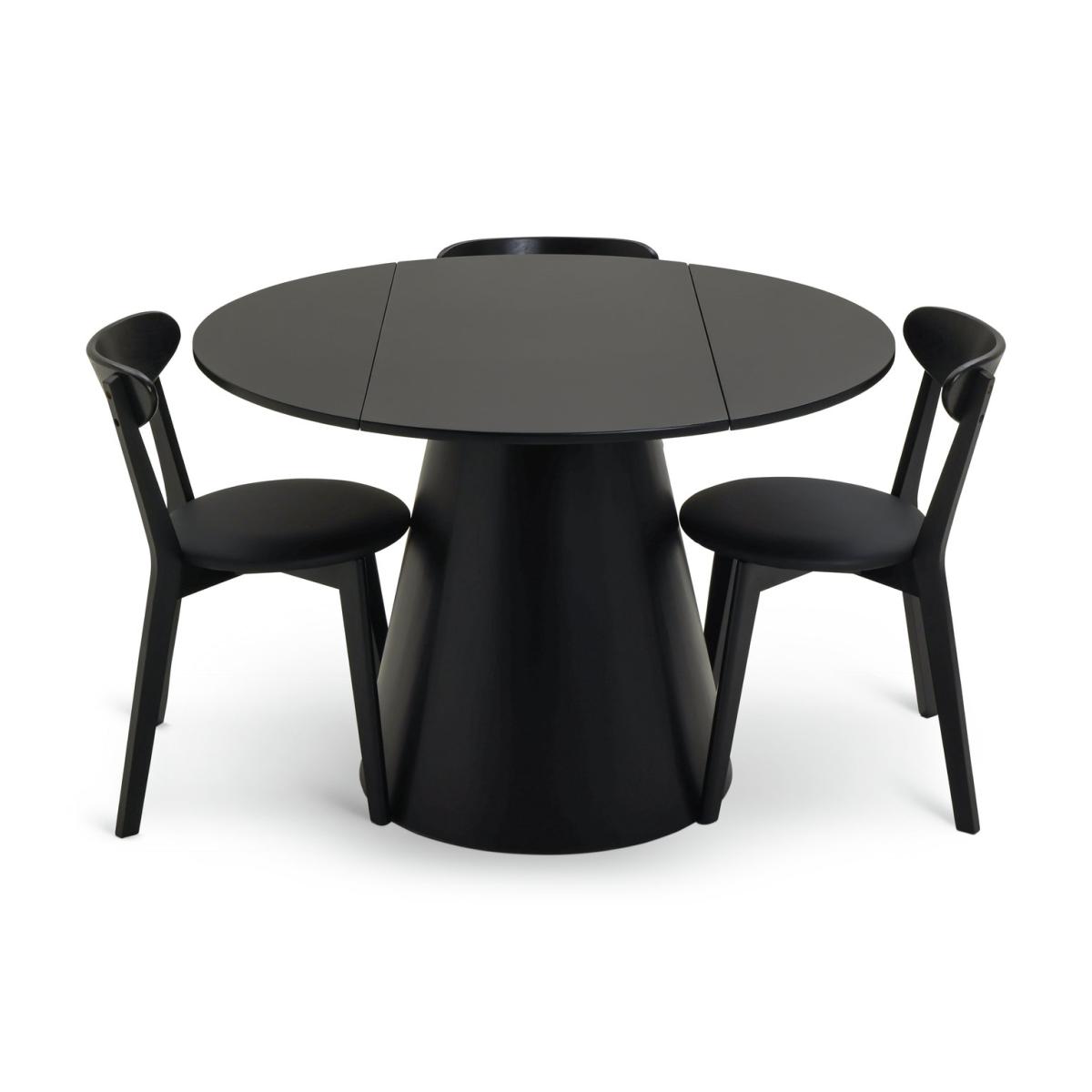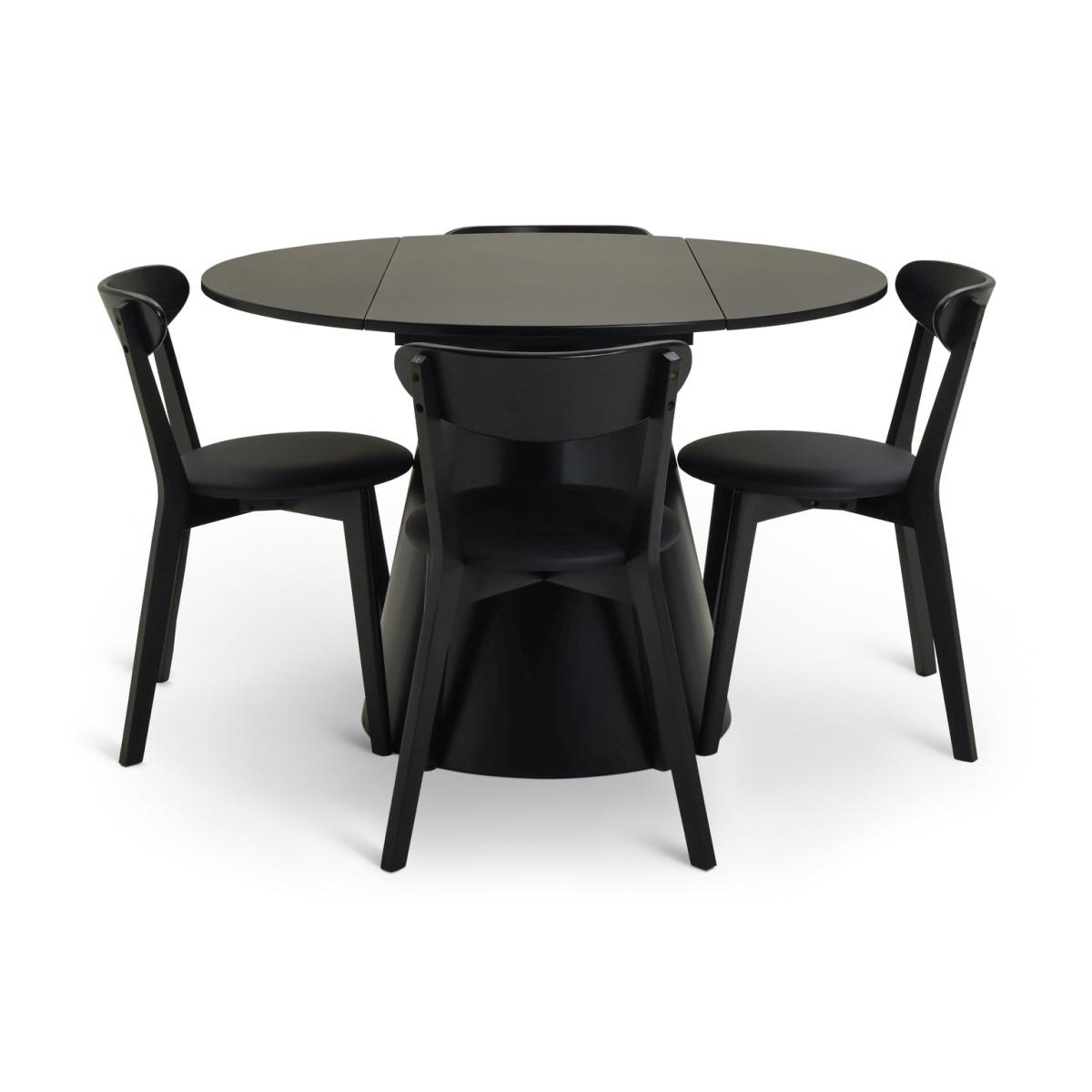 Designer loving foodies, feast your eyes on this. Take a look at our drop leaf black painted dining table with its distinctive conical base. And how about those 4 matching chairs? The ox back feature gives a nod to mid-century style. Comfy too. The black leather seat pads add an extra layer of cushioned oomph. Fine dining? You bet. If space is a little tight, drop one leaf and back the table against a wall, or drop both leaves and you've still got dining room for 2.