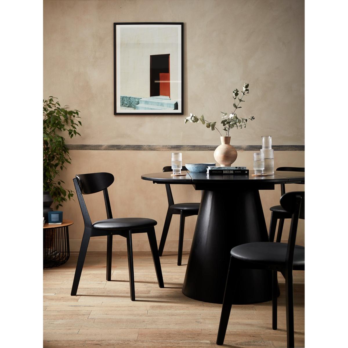 I love this black dining set for its sleek, contemporary look that effortlessly elevates a variety of interiors-from minimalist modern spaces to more eclectic schemes. The rounded shape of the table encourages a sense of intimacy and easy conversation, while the matte black finish adds sophistication without feeling heavy. It works particularly well in neutral or monochrome settings, but can also be a stylish anchor in rooms with bold or colourful accents. Practical styling tips include adding textured placemats or colourful tableware to soften the monochrome palette, and pairing it with a statement light fitting overhead to create a focal point. This set balances style and functionality, making it versatile for everyday dining or more formal occasions.