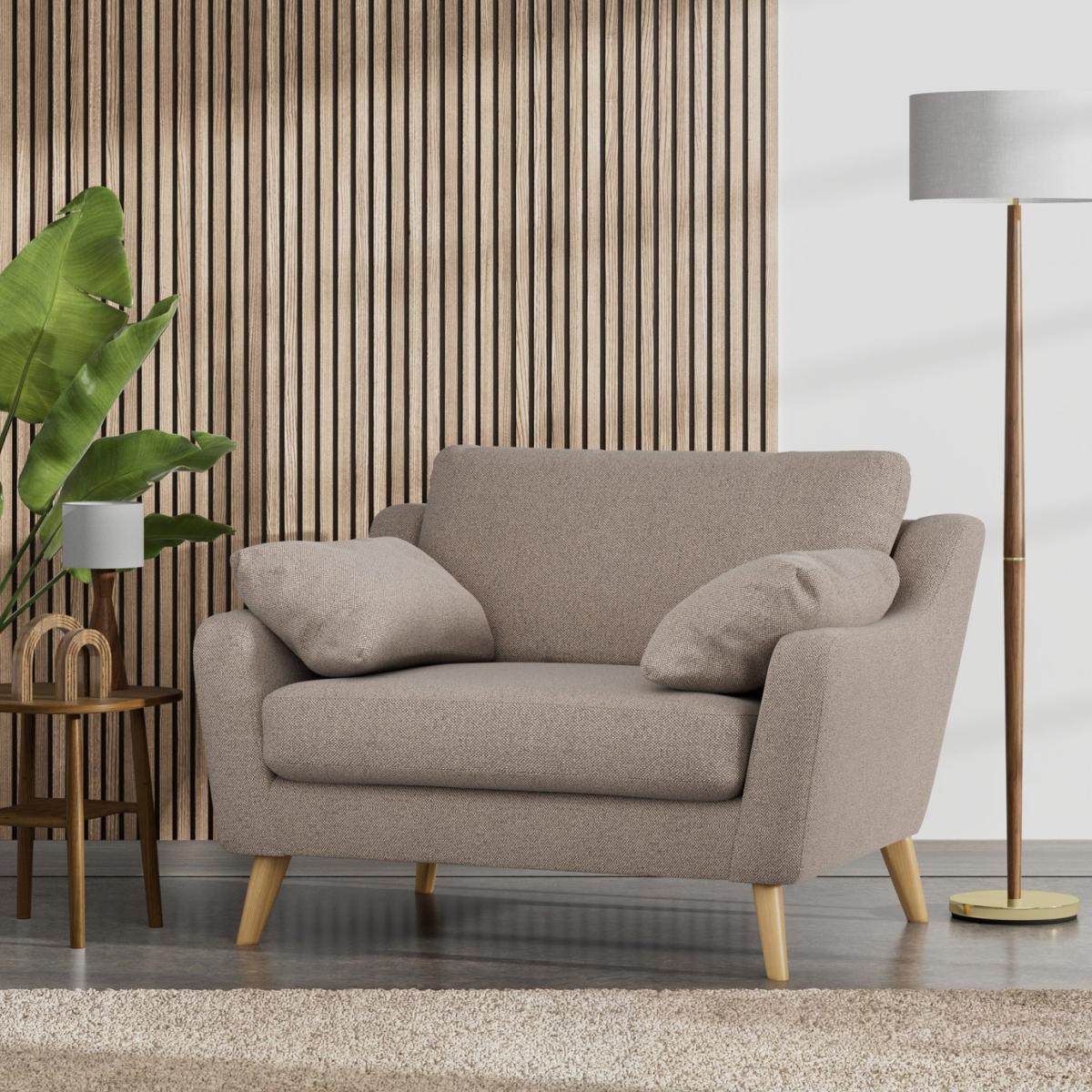 When it's made for you, you know you'll love it. This laid-back cuddle chair sets the mood for mellow mid-century style. A plumply relaxing back rest, softly inviting seat, and a comfy cushion is waiting to welcome you. Upholstered in a textured weave, the Ivor takes on a soft, tactile feel. And the finishing touch? Wooden splayed legs that emphasise the gently tapered angles of this iconic sofa design. Offering superior comfort, the Ivors reversible cushions use high density foam core wrapped in soft fibre wadding to create the perfect balance of support, durability and recovery. Hand made to order in the UK, the Ivor uses quality materials and traditional techniques for furniture thats unique to you. Available in a choice of sizes and fabrics including Aquaclean technology protection built into the yarn, which is easy to clean with just water. Part of the Ivor collection. Material: Made from 100% polyester. Wooden feet. Reversible seat with foam fibre wrap filling. Reversible cushion(s) with foam fibre wrap filling. Free fabric swatch available on this line. Dimensions: Size H88.5, W127, D99cm. Floor to seat height: 51.5cm. Depth of seat: 59cm. Height of seat back: 45cm. Width of seating area between arms: 97cm. Height of arm rest: 60cm. Weight: 46.5kg. Packaged dimensions: Package size H66.5, W132, D104cm. General information: FSC certified meaning the materials used for this product are responsibly sourced. We do more than deliver your product, we unpack, set it up and take away the packaging. Manufactured in the UK using components sourced globally. Professional clean only. Plump cushions regularly to maintain shape. Manufacturer's 15 year frame guarantee.
