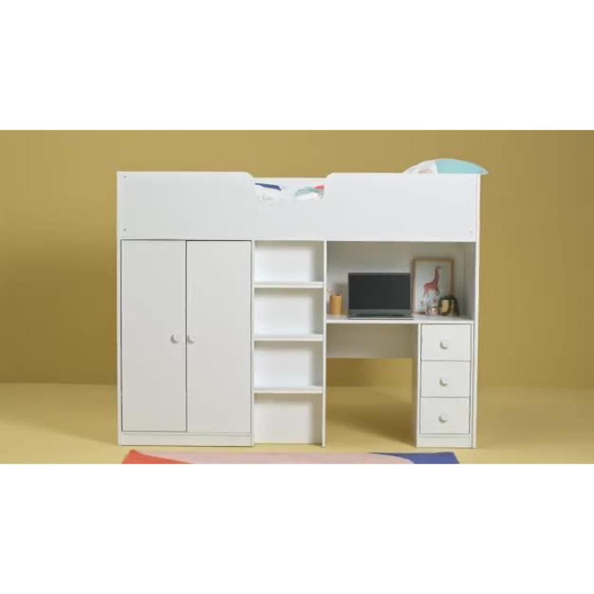Climb up, up and away with the Jackson high sleeper. A complete bedroom in one tidy footprint, it comes with a built-in desk, a wardrobe, 3 deep drawers and lots of shelf space. This is a fun space-saving solution any kid will love, ideal for smaller rooms or where space is precious. Also available in a shorty length for even more space versatility!