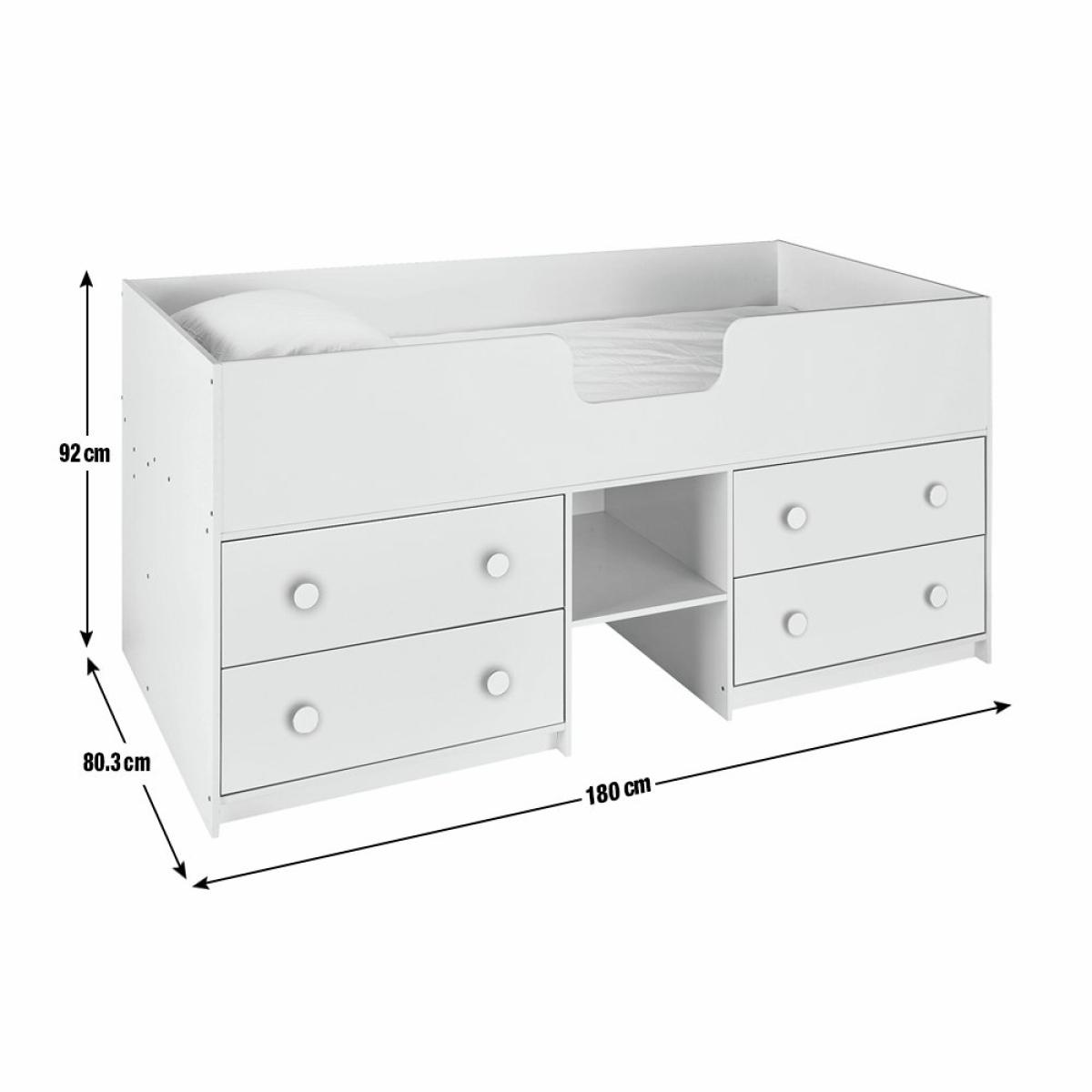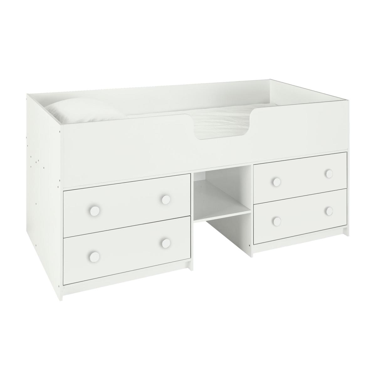 Climb aboard for a great night's sleep and a fun space-saving solution with the Jackson shorty Mid Sleeper bed. 15cm shorter than our standard Jackson Mid Sleeper bed, and 15cm narrower, this is a great bed for small rooms or where space is particularly precious, all wrapped up in one neat footprint. With 4 deep drawers and a handy shelf ladder, there's plenty of storage underneath for clothes, toys and books. Also available in a standard length. The high sides create a secure and cosy bed for your child, and the fun white handles add a pop of freshness to any room. Strong and sturdy, the Jackson has been designed to last the years. Part of the Jackson collection. Sleeper: Shorty bed. White bed with a particleboard frame. Packed flat - 2 people recommended. WARNING "This product must be attached to a wall or building structure". Ladder is in a fixed position. Maximum user weight per bunk 100kg. For ages 6 years and over. Suitable for adult use (safety tested to 100kg). Mattress: (not included). For safety, maximum depth of mattress to be used is 16cm. Dimensions: Safety rail height 33cm. Frame size L180, W80.3, H92cm. Mattress size L175, W75, D16cm. Clearance between floor and underside of bed 57.5cm. Storage unit size H17.2, W61.6, D33.5cm. Package dimensions: Package 1 size H9.3, W184.8, D59.8cm. Package 2 size H11.2, W100, D83.4cm. General information: By choosing FSC certified products, you are supporting responsible management of the world's forests. Manufacturer's 1 year guarantee.