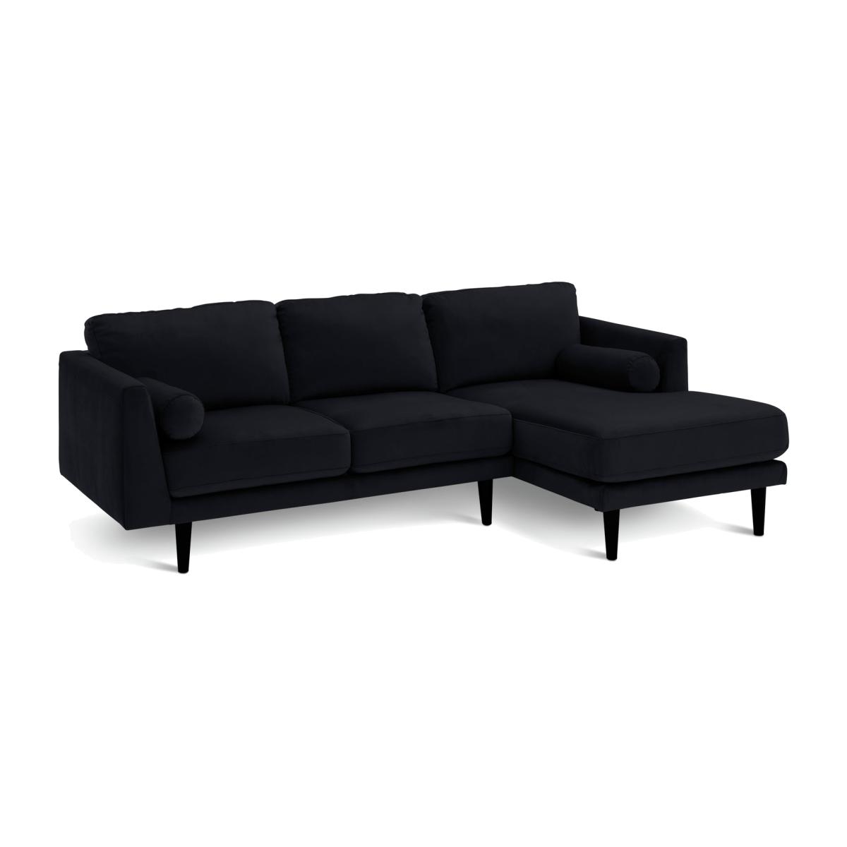 Cosy up with Jacob. Upholstered in black velvet this mid-century modern corner sofa is comfy and luxurious. Sink into the low, wide pocket sprung foam seats. Snuggle into the plump and squishy bolsters. And lean against the fibre-filled cushioned back rests. Now breathe. Relaxation achieved. Our velvet fabric is crafted from robust, long-lasting polyester. A great choice for families and pet owners. Part of the Jacob collection. Right hand corner. Material:Made from 100% velvet. Wooden feet. Fixed seats with pocket sprung and foam filling. Fixed cushion(s) with fibre filling. Free fabric swatch available on this line. Dimensions:Size H82, longer width 229, shorter width 145, D145cm. Floor to seat height: 46cm. Depth of seat: 56cm. Height of seat back: 38cm. Shorter seating area width between arms: 112cm. Longer seating area width between arms: 188cm. Height of arm rest: 64cm. Overall weight 64.5kg. Professional clean only. Plump cushions regularly to maintain shape. Minimal assembly - just add feet. Maximum individual user weight 120kg. Packaged dimensions:Package size H67, W149, D93cm. Second package size H67, W85, D147cm. General information:We are excited to be welcoming some of our favourite HOME products into the Habitat range. Your product may arrive in Habitat or HOME packaging. Manufacturer's 10 year frame guarantee.