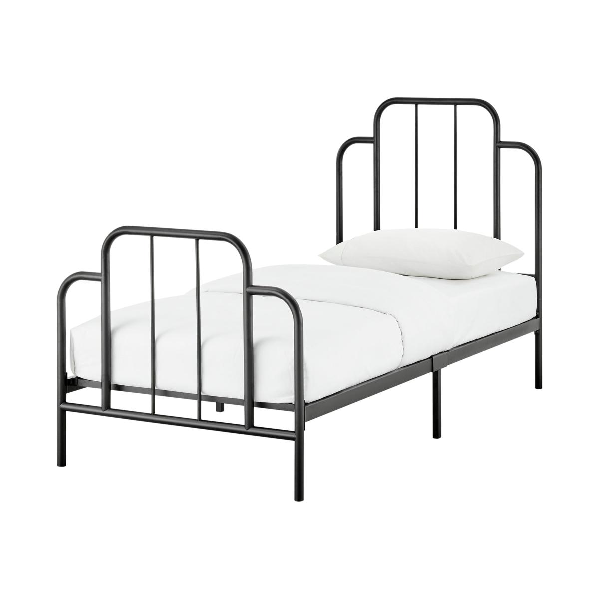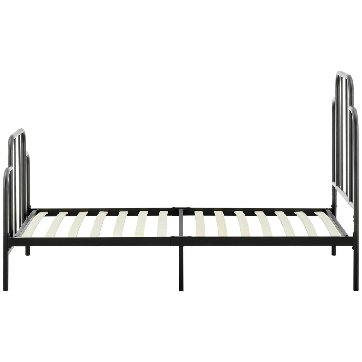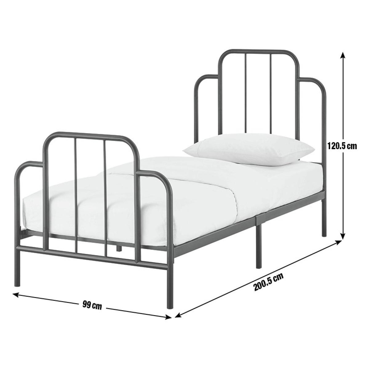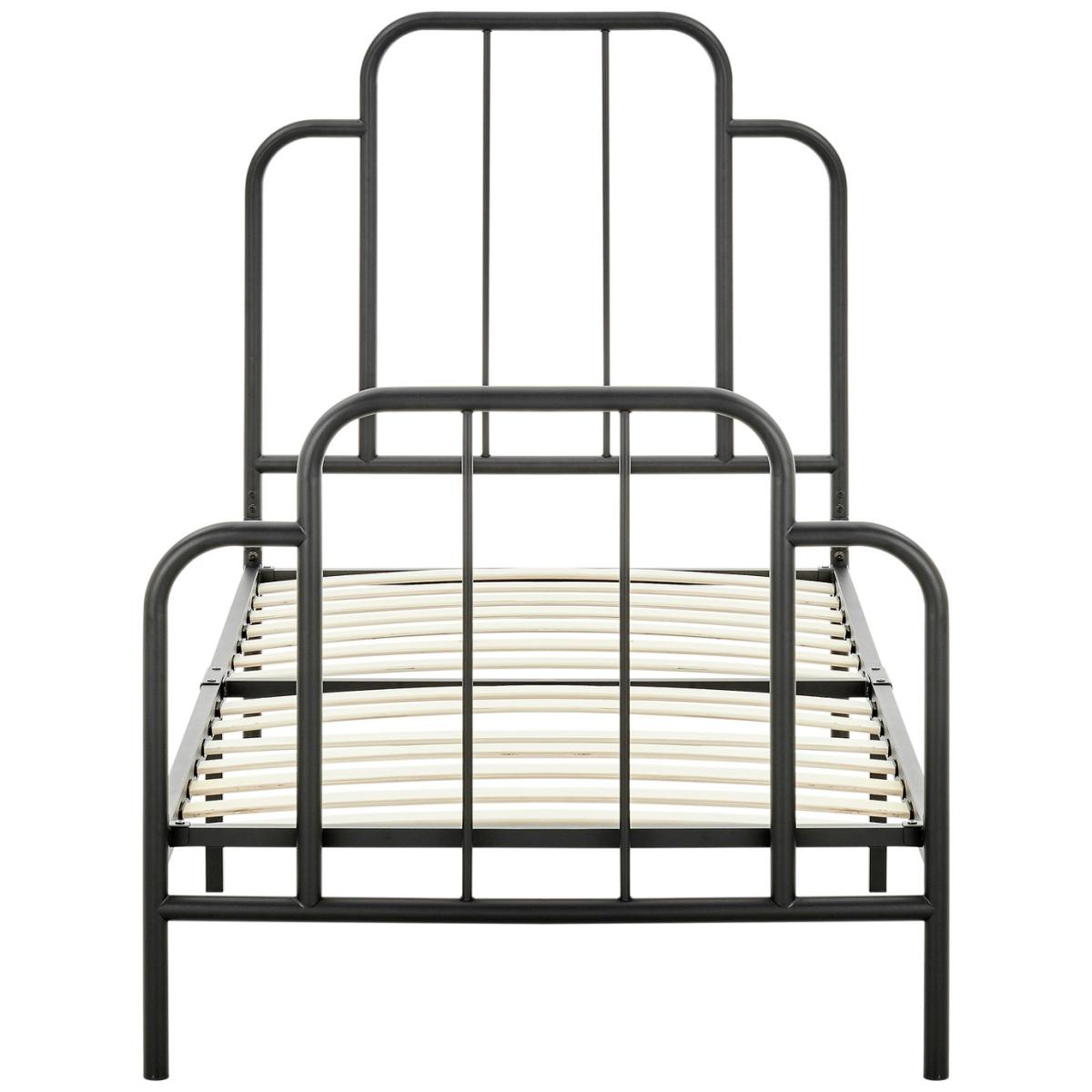 Meet Jacques. A black metal bedframe with a distinctive header and footer. You could say it's a fusion of contemporary design and French art deco elegance. The base has sprung wooden slats to comfortably support and ventilate your single mattress. Part of the Jacques collection. Metal frame. Base with sprung wooden slats. Size W99, L200.5, H120.5cm. Height to top of siderail 31cm. 27cm clearance between floor and underside of bed. Weight 17.2kg. Total maximum user weight 110kg. Packed flat - 2 people recommended. Package Dimensions: Package 1 dimensions: H100, W93.5, D8cm. Package 1 weight: 11.3kg. Package 2 dimensions: H101, W34, D6cm. Package 2 weight: 9.2kg. FSC certified meaning the materials used for this product are responsibly sourced. General Information: We are excited to be welcoming some of our favourite HOME products into the Habitat range. Your product may arrive in Habitat or HOME packaging. Manufacturer's 1 year guarantee.