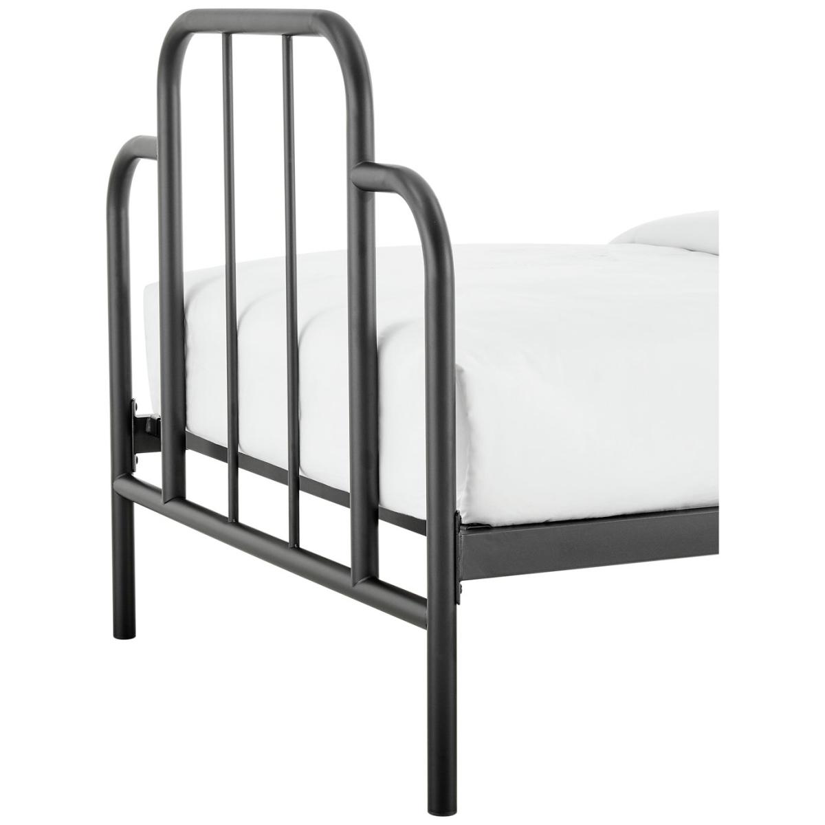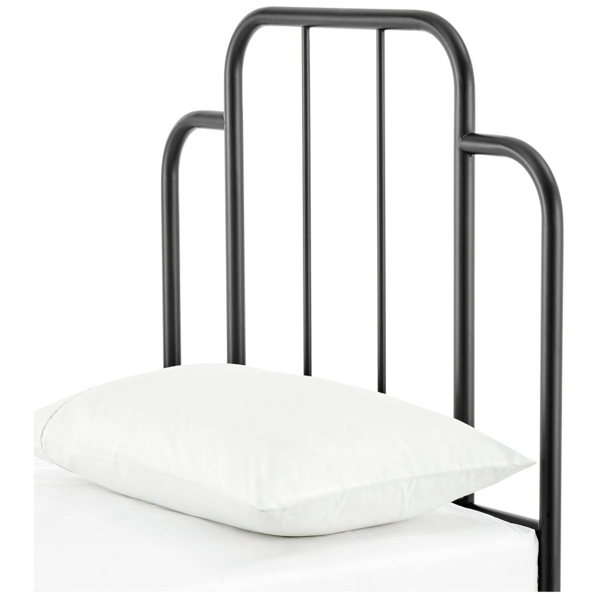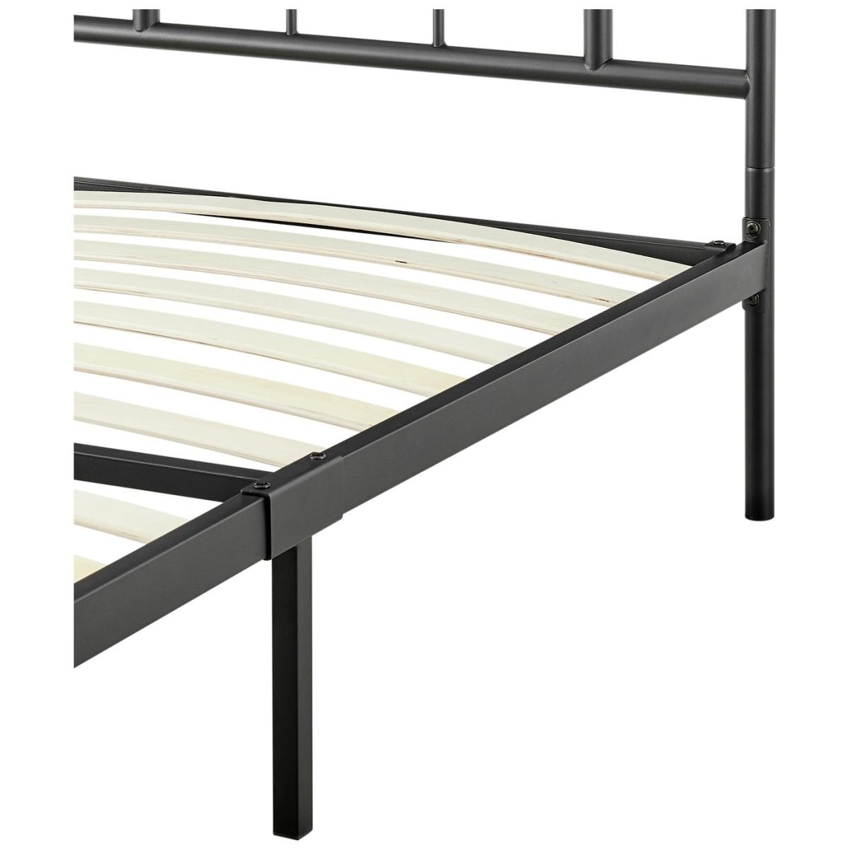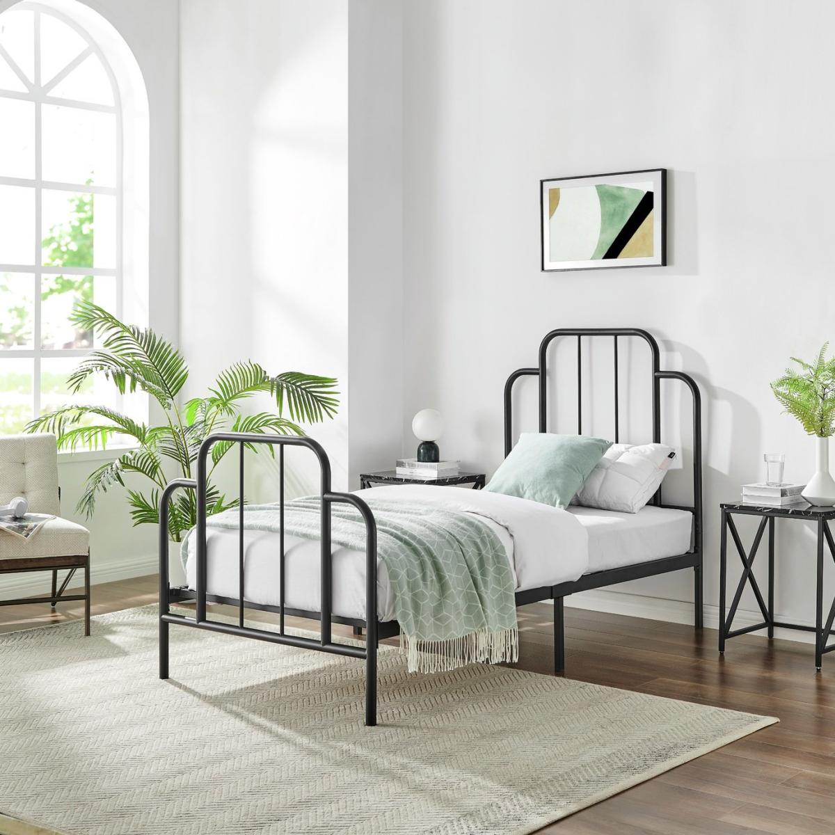 Meet Jacques. A black metal bedframe with a distinctive header and footer. You could say it's a fusion of contemporary design and French art deco elegance. The base has sprung wooden slats to comfortably support and ventilate your single mattress. Part of the Jacques collection. Metal frame. Base with sprung wooden slats. Size W99, L200.5, H120.5cm. Height to top of siderail 31cm. 27cm clearance between floor and underside of bed. Weight 17.2kg. Total maximum user weight 110kg. Packed flat - 2 people recommended. Package Dimensions: Package 1 dimensions: H100, W93.5, D8cm. Package 1 weight: 11.3kg. Package 2 dimensions: H101, W34, D6cm. Package 2 weight: 9.2kg. FSC certified meaning the materials used for this product are responsibly sourced. General Information: We are excited to be welcoming some of our favourite HOME products into the Habitat range. Your product may arrive in Habitat or HOME packaging. Manufacturer's 1 year guarantee.