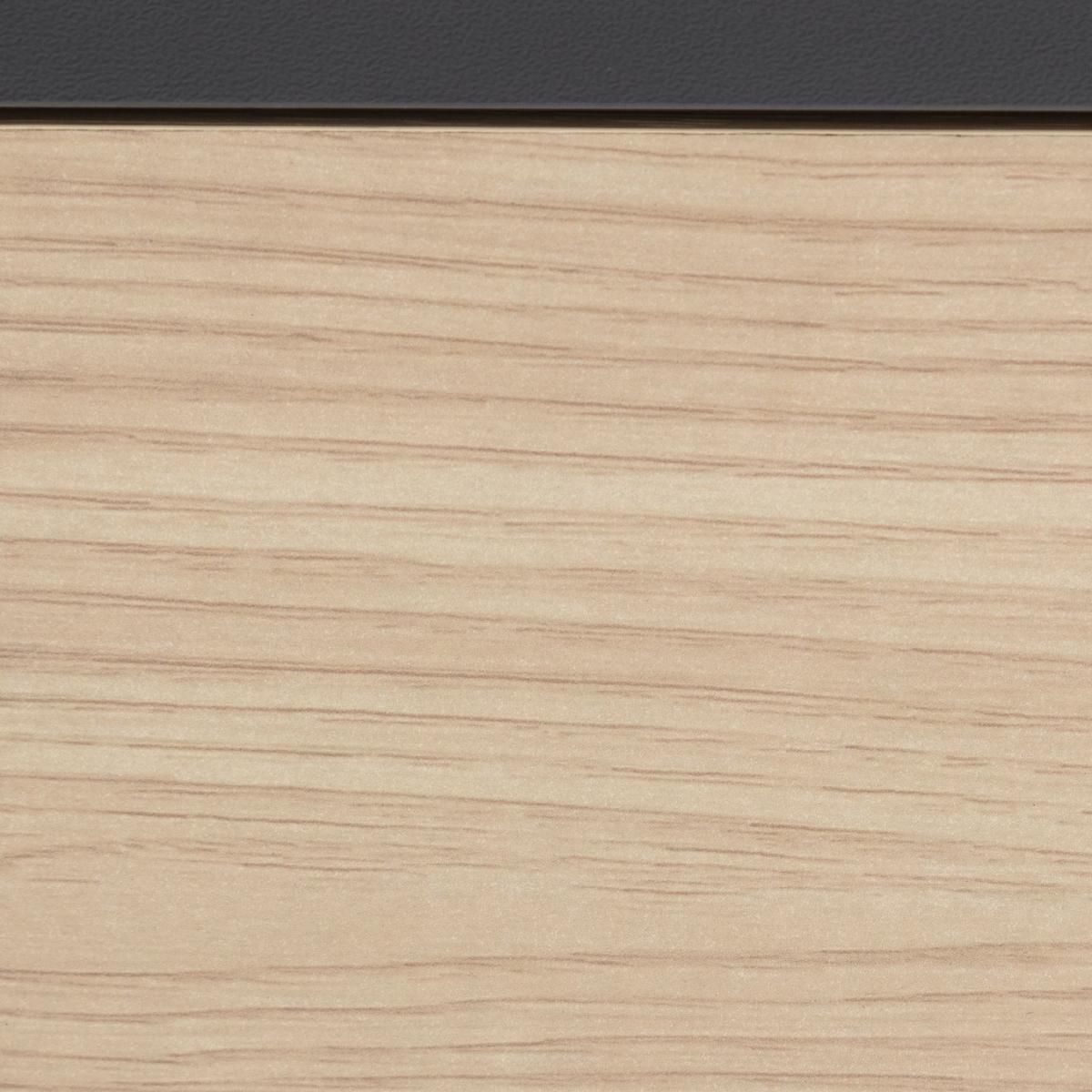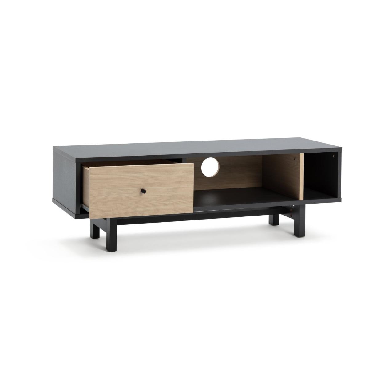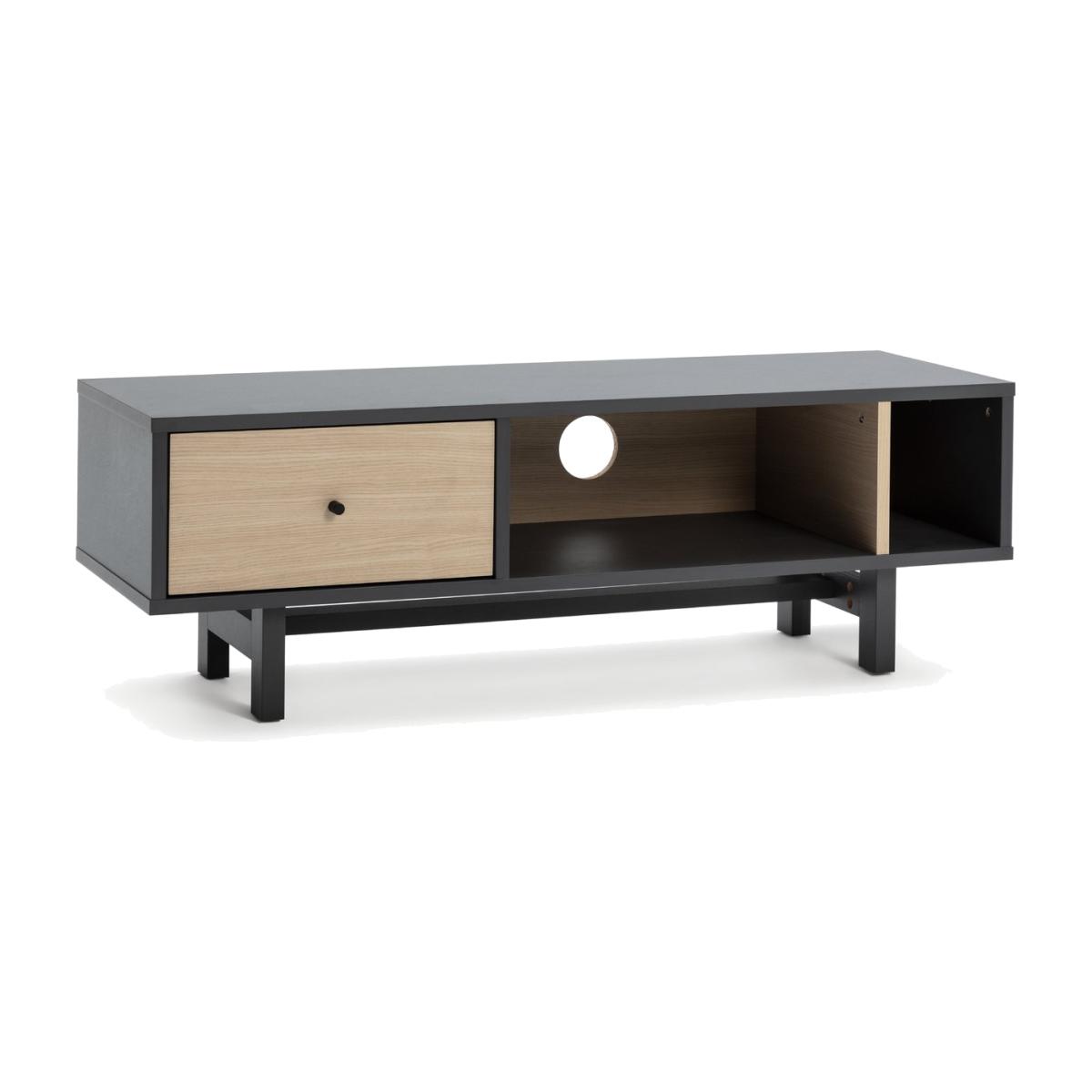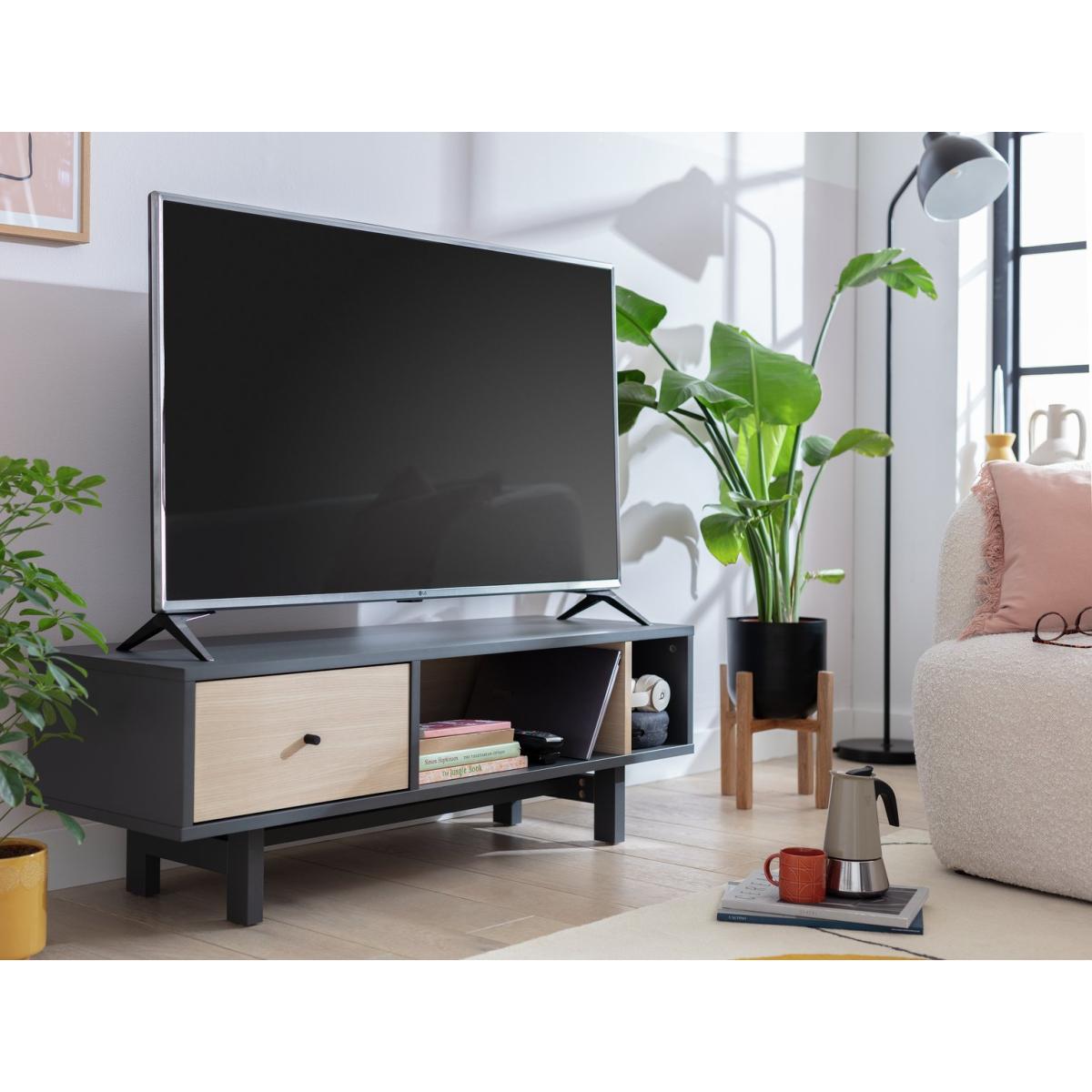 A standout TV stand. Movie nights just got a little more stylish with this modern TV unit. In deep grey and light oak, it's fashionably on-trend. Wide enough to take a 50inch screen, with an open shelf below to hold your consoles. The handy cut out area lets you tuck cables out of sight and makes connecting devices nice and easy. A deep drawer gives you space to stash away books or games. There's even a little cubby hole to pop your remote after the credits role. Dim the lights, it's showtime.