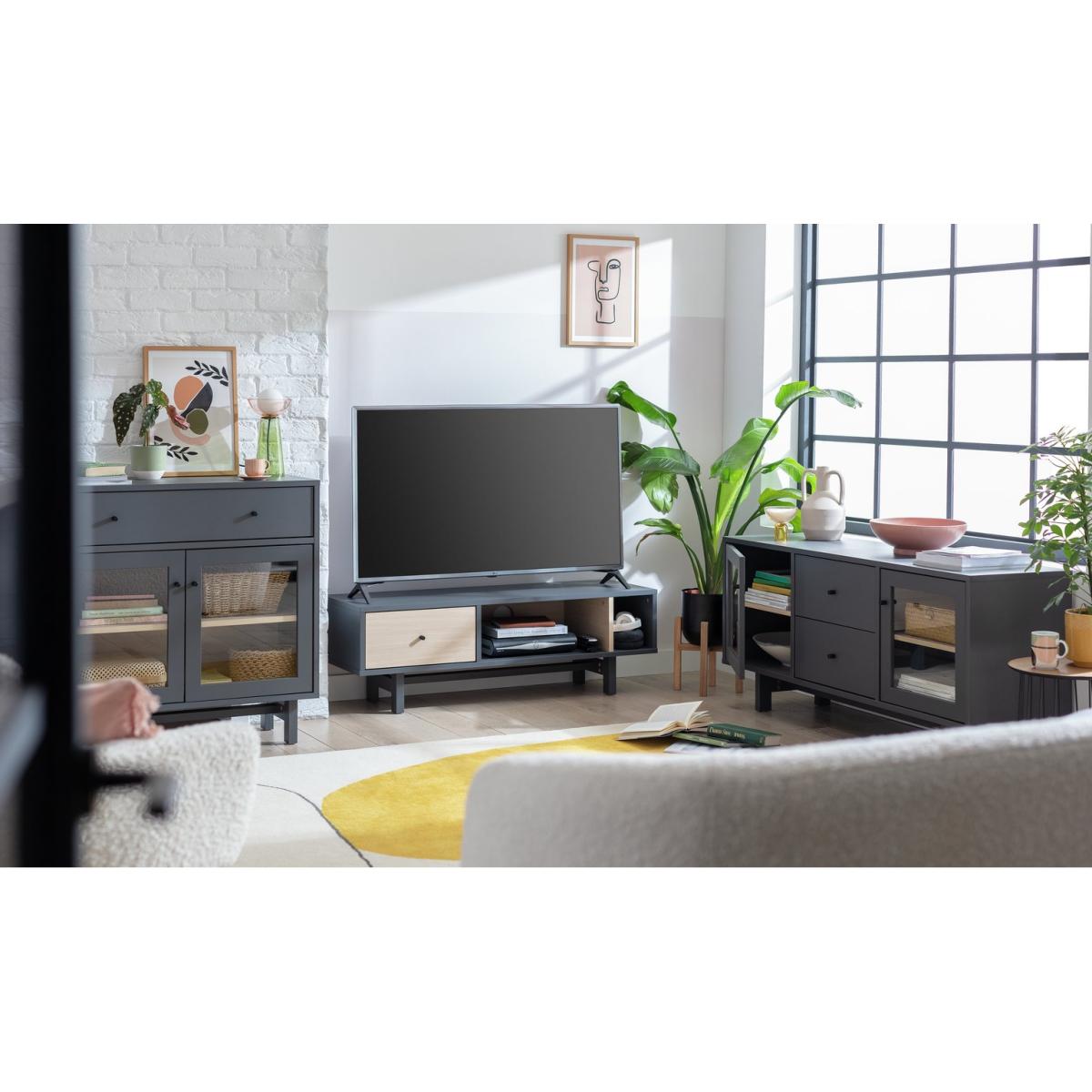 I love this TV stand because of its contemporary style with a clever mix of dark grey and oak that brings warmth and modernity to any living space. It works particularly well in minimalist or Scandi-inspired interiors, where its clean lines and neutral tones can be highlighted with simple accessories. Practical styling tips include adding a few decorative books or vessels on top, while utilising the drawer for remote controls and essentials to keep the surface clutter-free. The open shelf offers space for media equipment or statement decorative objects, making it a versatile piece that can be styled casual or more curated, depending on your room’s vibe. Its understated yet functional design makes it an easy upgrade for any media corner.