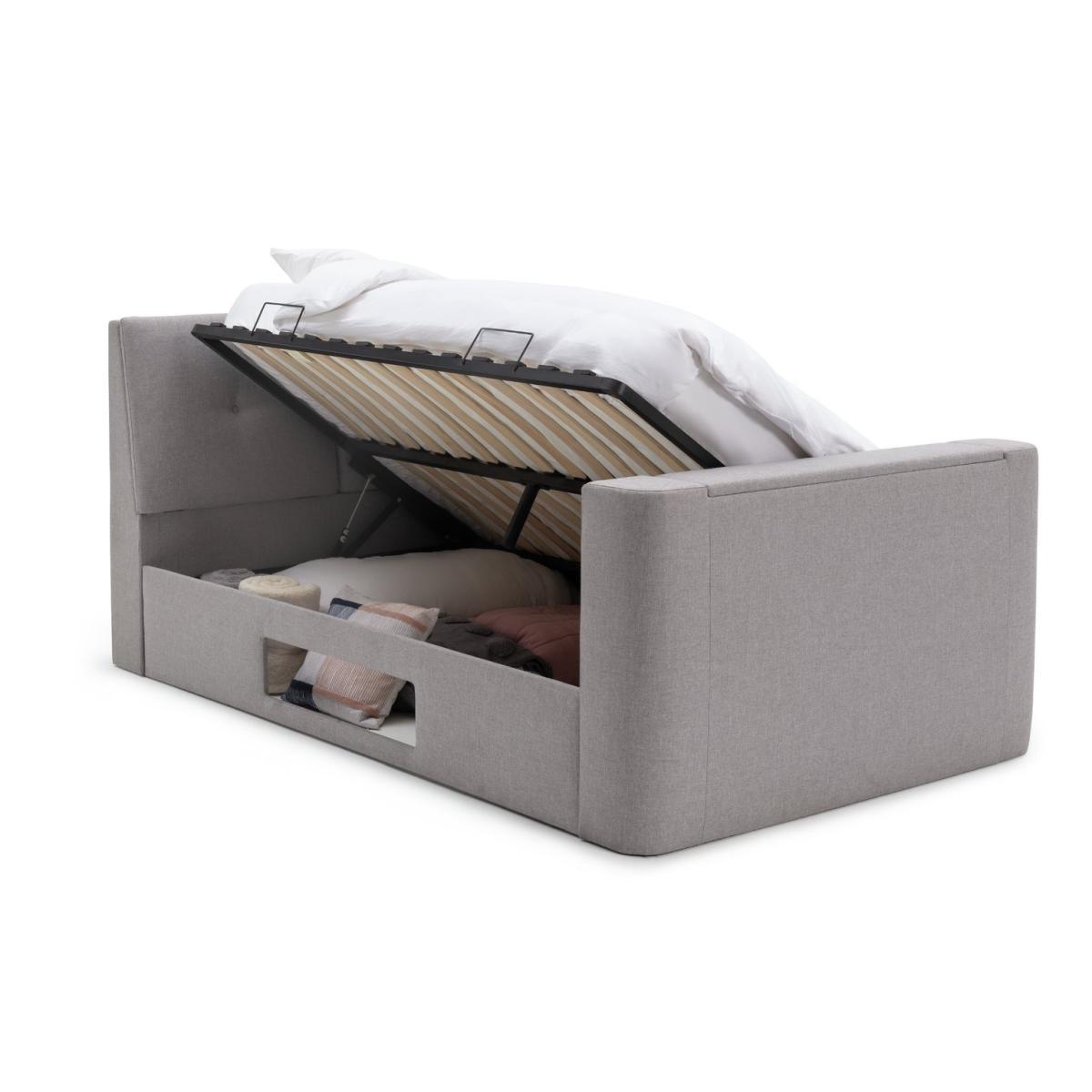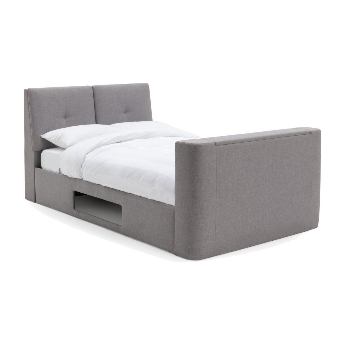 Bang on trend with an electric TV lifting mechanism in the end - Jakob is what we call a transformer bed. Lean against the slanting headboard and watch your favourite shows. Flip down the headboard and ta'dah, hidden handy shelves for bedtime essentials. Jakob's king size frame also includes an ingenious gas lift mechanism to raise the side of the bed and reveal loads of storage space. Jakob scores high in looks and comfort too in soft woven fabric, buttoned headboard and with sprung slats for mattress support.