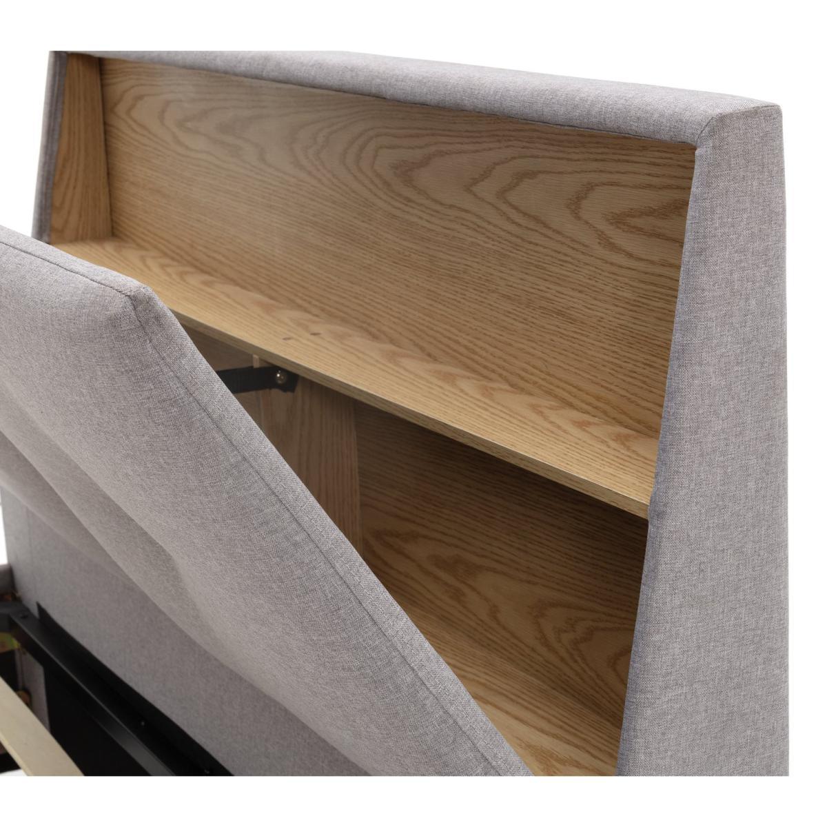 Want a minimalist home but need storage? Meet Jakob - a bit of a transformer. Jakob's super king size bed frame includes an ingenious gas lift mechanism which raises the foot end of the bed to reveal loads of storage space. Next flip down the slanting headboard. Ta'dah - handy hidden shelves for night time essentials. Finished perfectly in a fabulous soft woven fabric with buttoned headboard and with sprung wooden slats for good mattress support and ventilation - we are definitely fans.