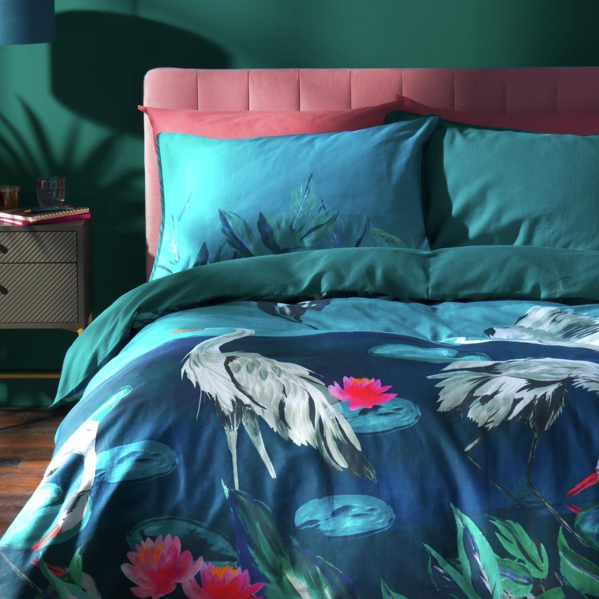 Bring home the luxe boutique hotel style. We're loving this fabulously bold 200-thread count Japonica duvet set. Inspired by Japanese kimono prints, the crane design, rich teal palette with pops of pink, is bang on trend. Enjoy the feel of the soft, silky fabric. It's made from 100% cotton sateen and it's 100% glam. For a seriously, sophisticated sleep sanctuary, style it up with metallic bedside tables, rich textured curtains and relaxing, low lighting. Ta dah! Instant zen den.