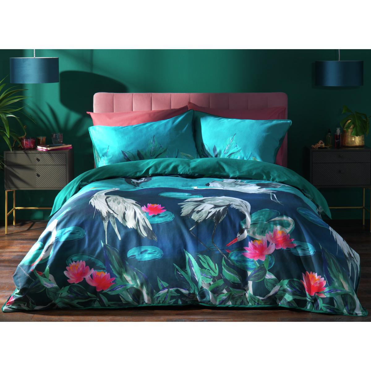 Bring home the luxe boutique hotel style. We're loving this fabulously bold 200-thread count Japonica duvet set. Inspired by Japanese kimono prints, the crane design, rich teal palette with pops of pink, is bang on trend. Enjoy the feel of the soft, silky fabric. It's made from 100% cotton sateen and it's 100% glam. For a seriously, sophisticated sleep sanctuary, style it up with metallic bedside tables, rich textured curtains and relaxing, low lighting. Ta dah! Instant zen den.