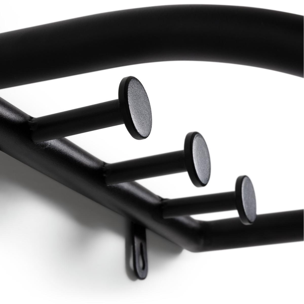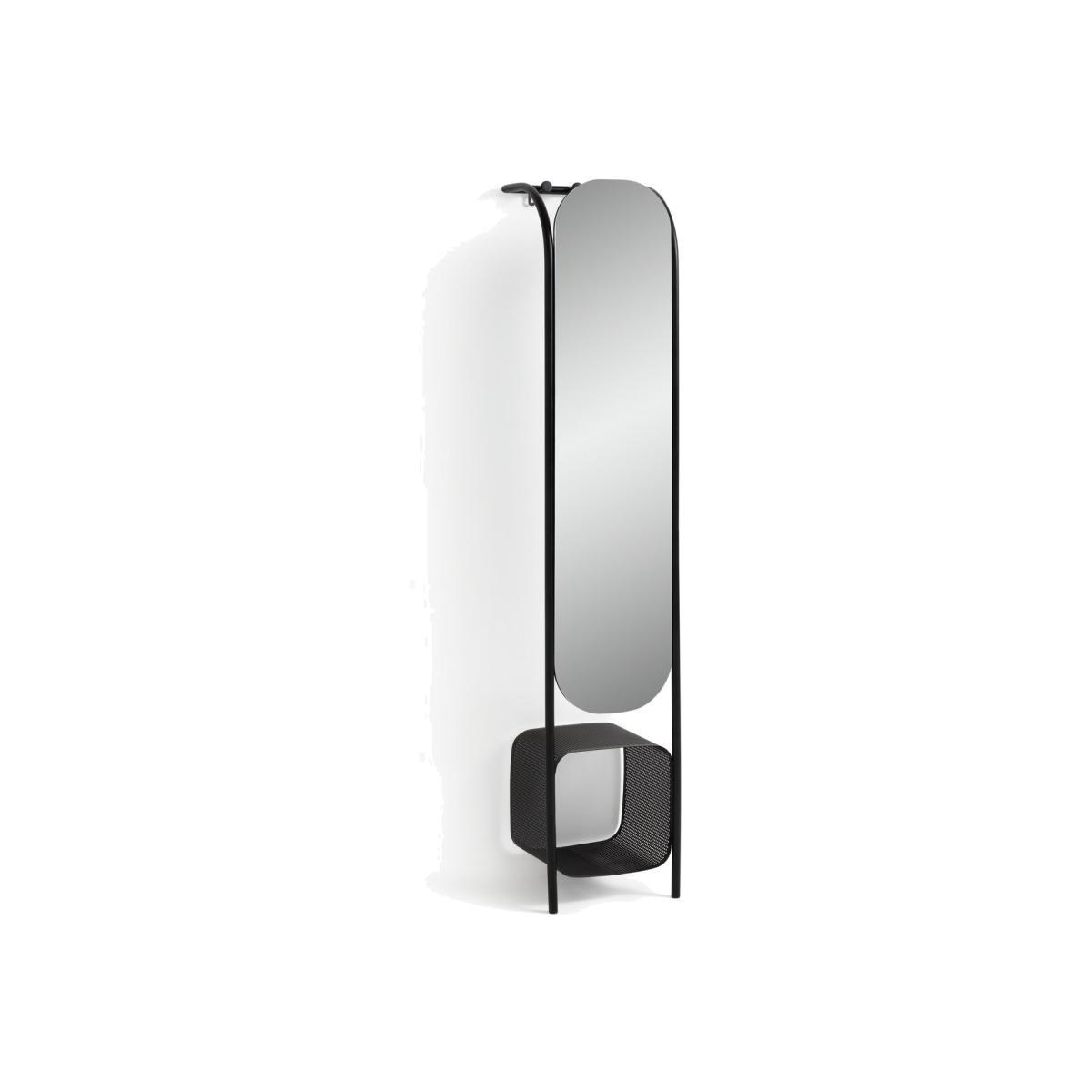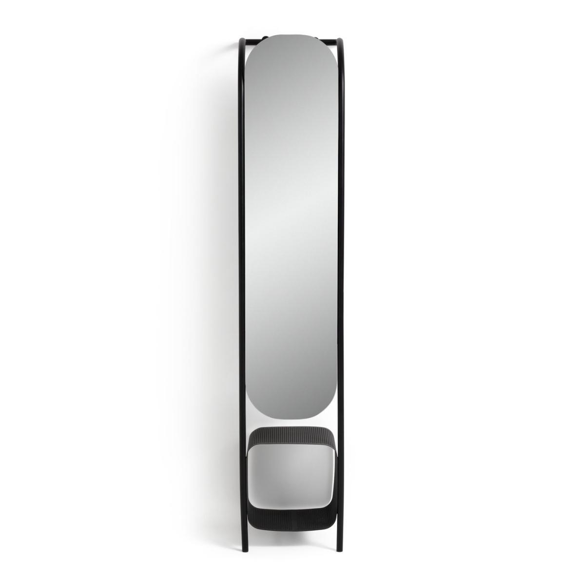 Sleek and tidy. Our freestanding floor length mirror is a space saving superstar. Hang coats or jackets on its hooks and out the way. There's even a cool cube for your favourite footwear. Simple and chic with a black metal finish, this all-in-one storage mirror is designed to prop effortlessly against your wall. Neat. Grab your coat, grab your shoes, check your outfit. Looking good.