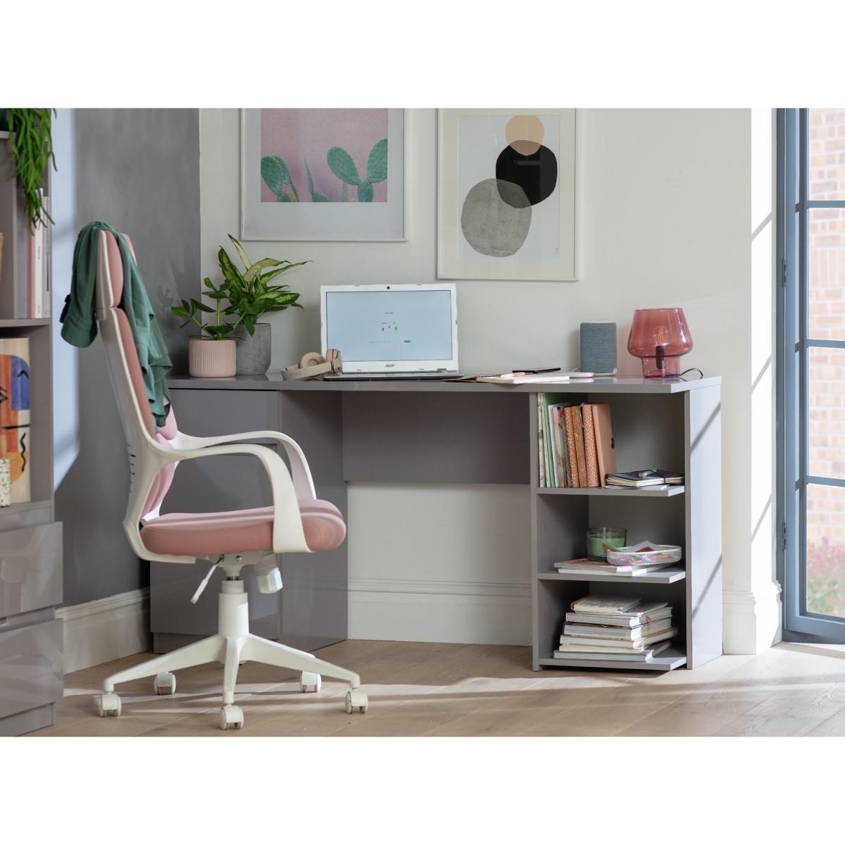 A perfect place to work. Jenson is a sleek minimalist desk designed for work and hiding clutter. Finished in a contemporary grey gloss, one pedestal has a handy drawer and adjustable shelving concealed by a door. The other has open shelving for attractive display space. Clever, huh? Jenson makes a perfect work-from-home space and looks great wherever you put it – living room, study or bedroom.