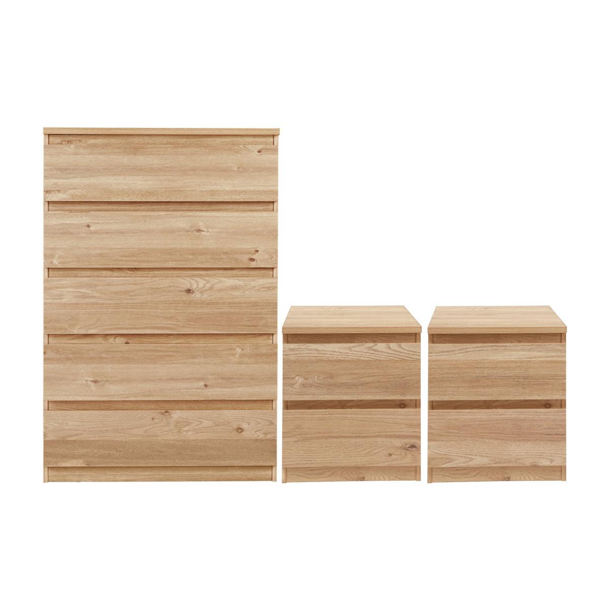Keep it clean. Our Jenson bedroom collection is modern and stylish. Created with clean lines and minimalist design, it sits comfortably with any interior scheme you stick it into. This great value package includes 2 bedside chests and a 5 drawer chest, ideal for a complete bedroom refresh. The oak effect finish has a warm and natural feel which is bang on trend. And smooth-glide, handleless drawers look chic and unfussy. Part of the Jenson collection. Chest of drawers:Size H120.7, W79.6, D45cm. 5 drawers. - requires 2 people. Bedside table:Size H53.1, W47.5, D45cm. 2 drawers. Self-assembly requires 2 people. General information:Made from wood effect. If this product is over 60cm high it must be securely attached to the wall to prevent overturning. FSC certified wood. Drawers in this unit have metal runners. We are excited to be welcoming some of our favourite HOME products into the Habitat range. Your product may arrive in Habitat or HOME packaging. Manufacturer's 1 year guarantee.