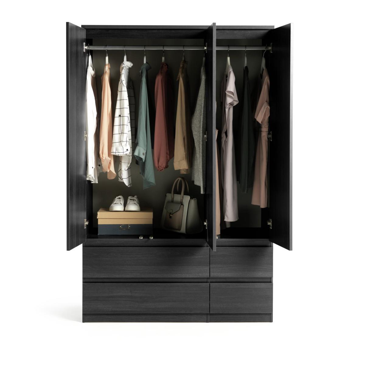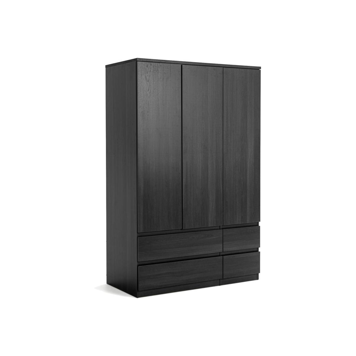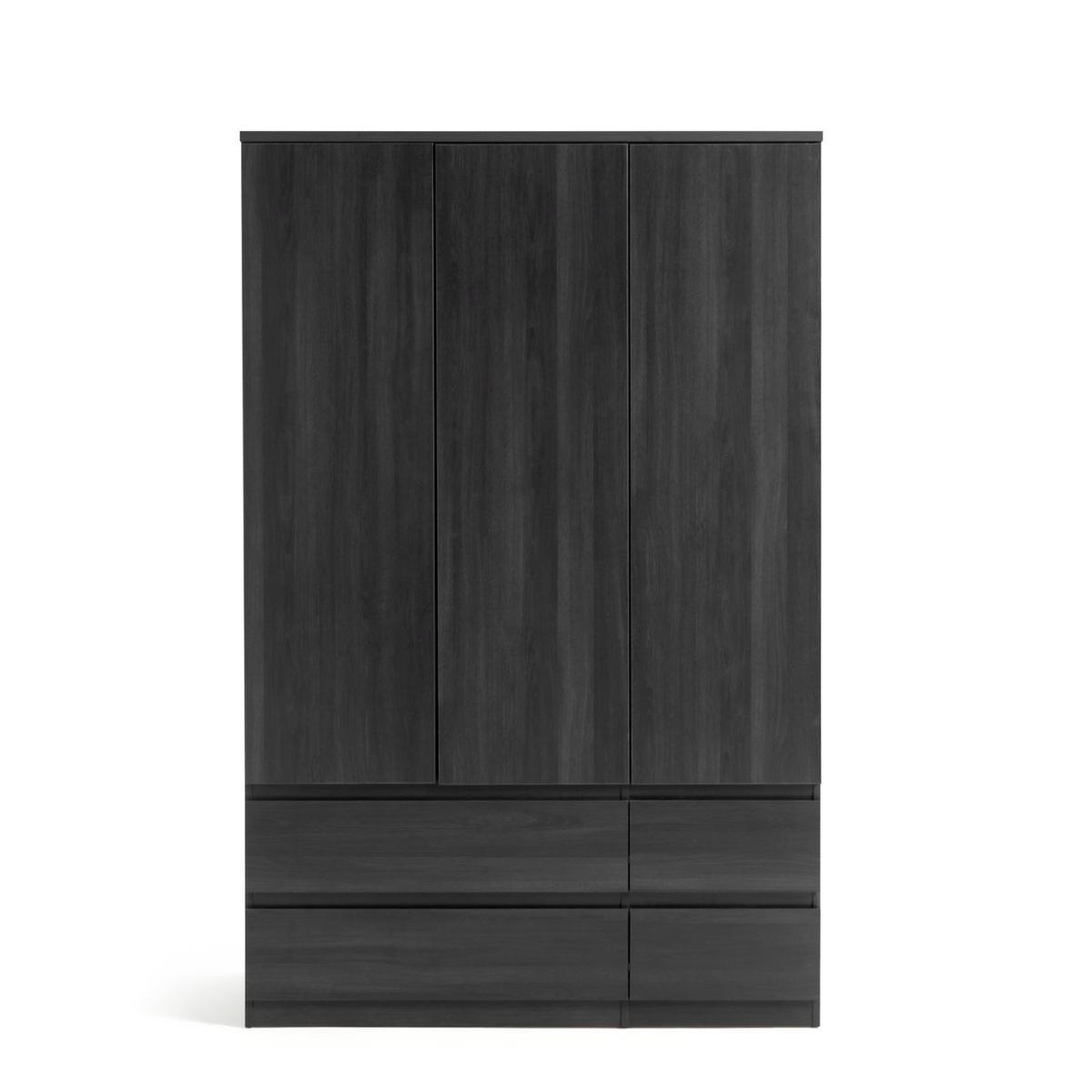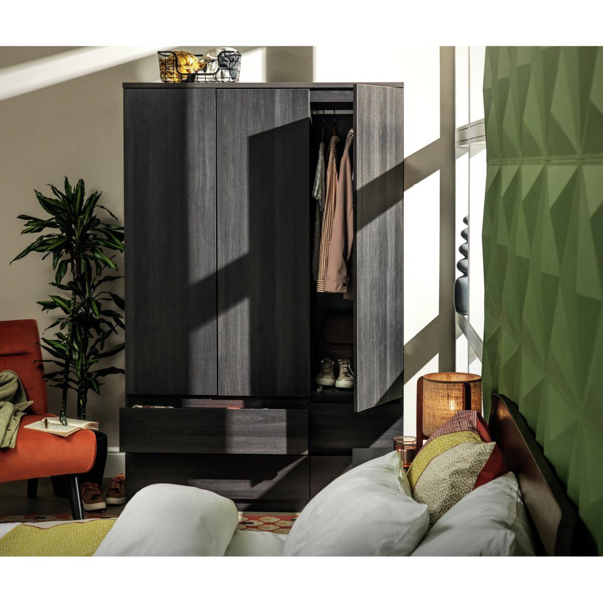 Keep it clean. Our Jenson bedroom collection is modern and stylish. Created with clean lines and minimalist design, it sits comfortably with any interior scheme you stick it into. This generously-sized wardrobe features 3 doors of hanging space and 4 drawers for organising folded clothing, shoes or anything else you want neatly kept out of sight. Finished in a black oak effect, glossy sheen for a sleek, smart look. And smooth-glide, handleless drawers look chic and unfussy.