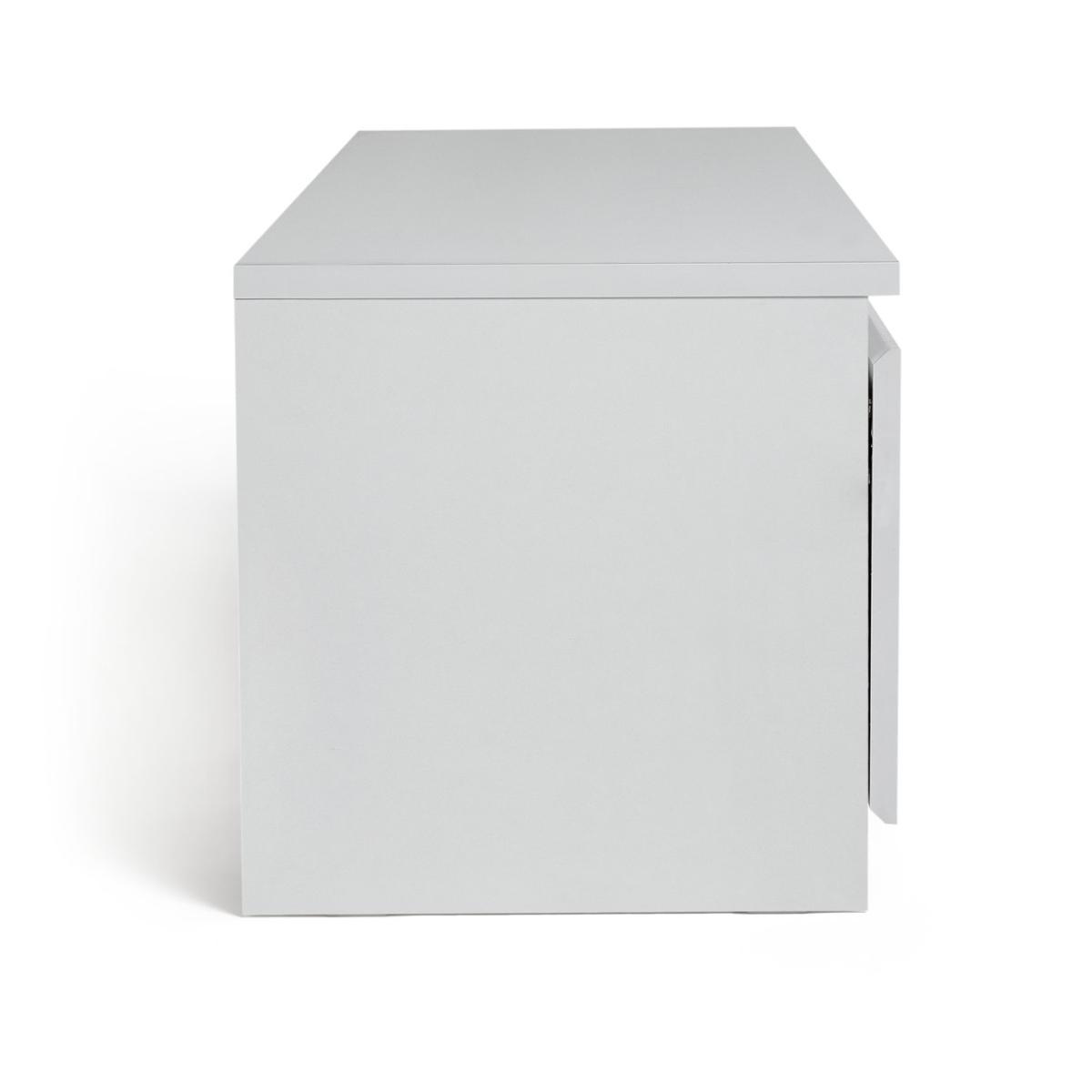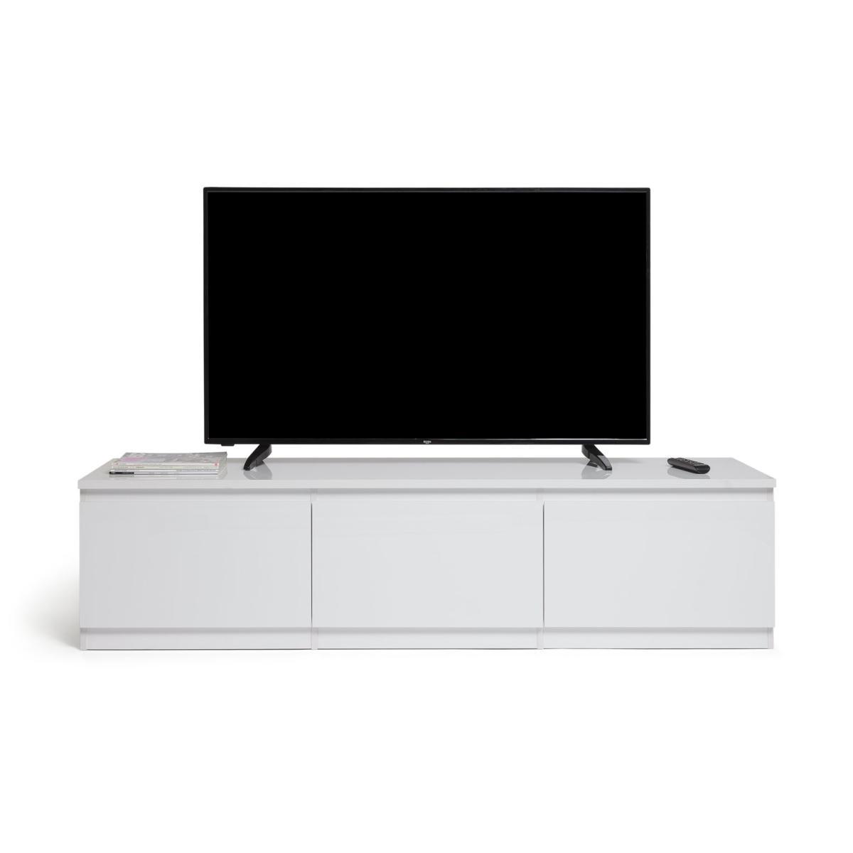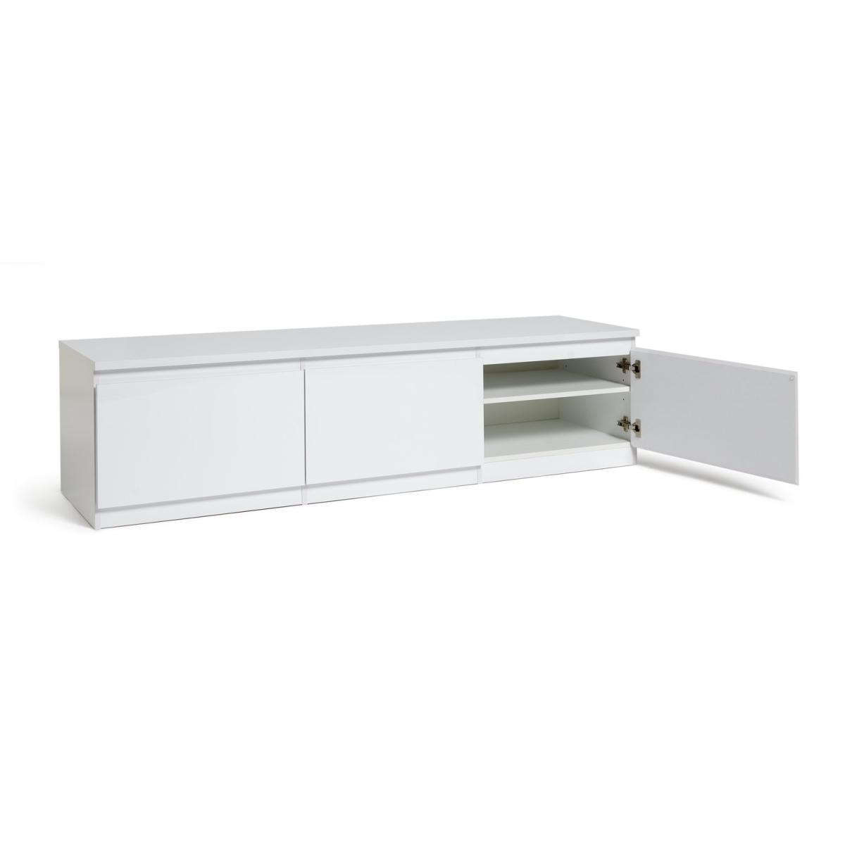 Drama queen or gaming fan? We'll make sure everything's on hand. Jenson comfortably accommodates gaming consoles and media players, keeping unsightly cables out of the way. And this ultra-long unit is large to take the widest of screens. Display rows of DVDs and games on the spacious shelves to easily find your favourites. Now everything's hidden behind closed doors, you can keep your attention on the main event – the screen! Finished in a smooth white gloss with concealed handles, it'll fit in anywhere. Now, where did I put the tv controller? Jenson is perfect for modern-day homes – take a peek at the entire collection. Part of the Jenson collection. Made from particleboard and foil with a gloss finish. Size H 44.5, W 180, D 45cm. Weight 52kg. 3 shelves. 3 doors. 3 media storage sections. Largest height of media equipment sections 28cm. Easy cable access. Suitable for screen sizes up to 75in. Maximum weight of TV 40kg. Self-assembly - 2 people recommended.