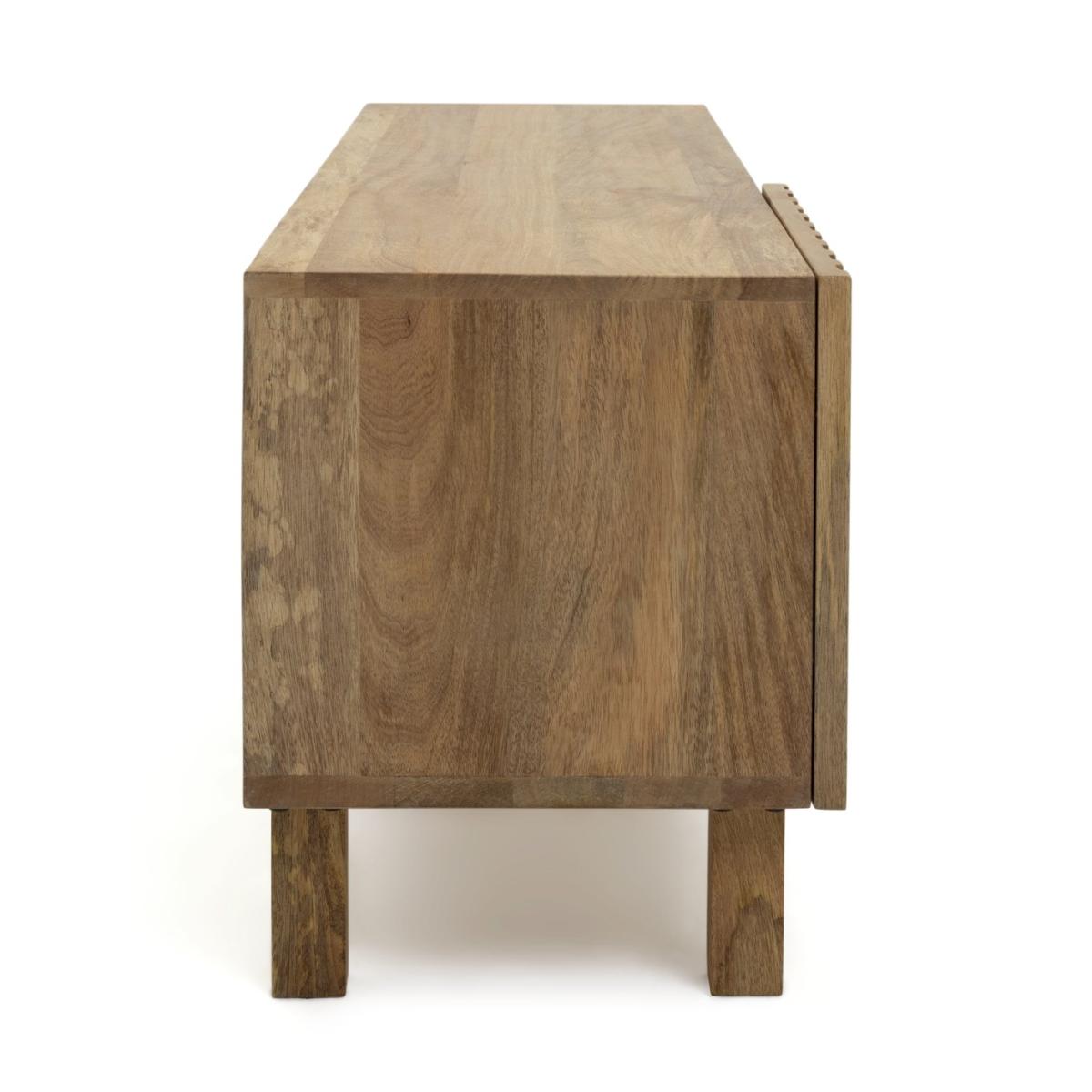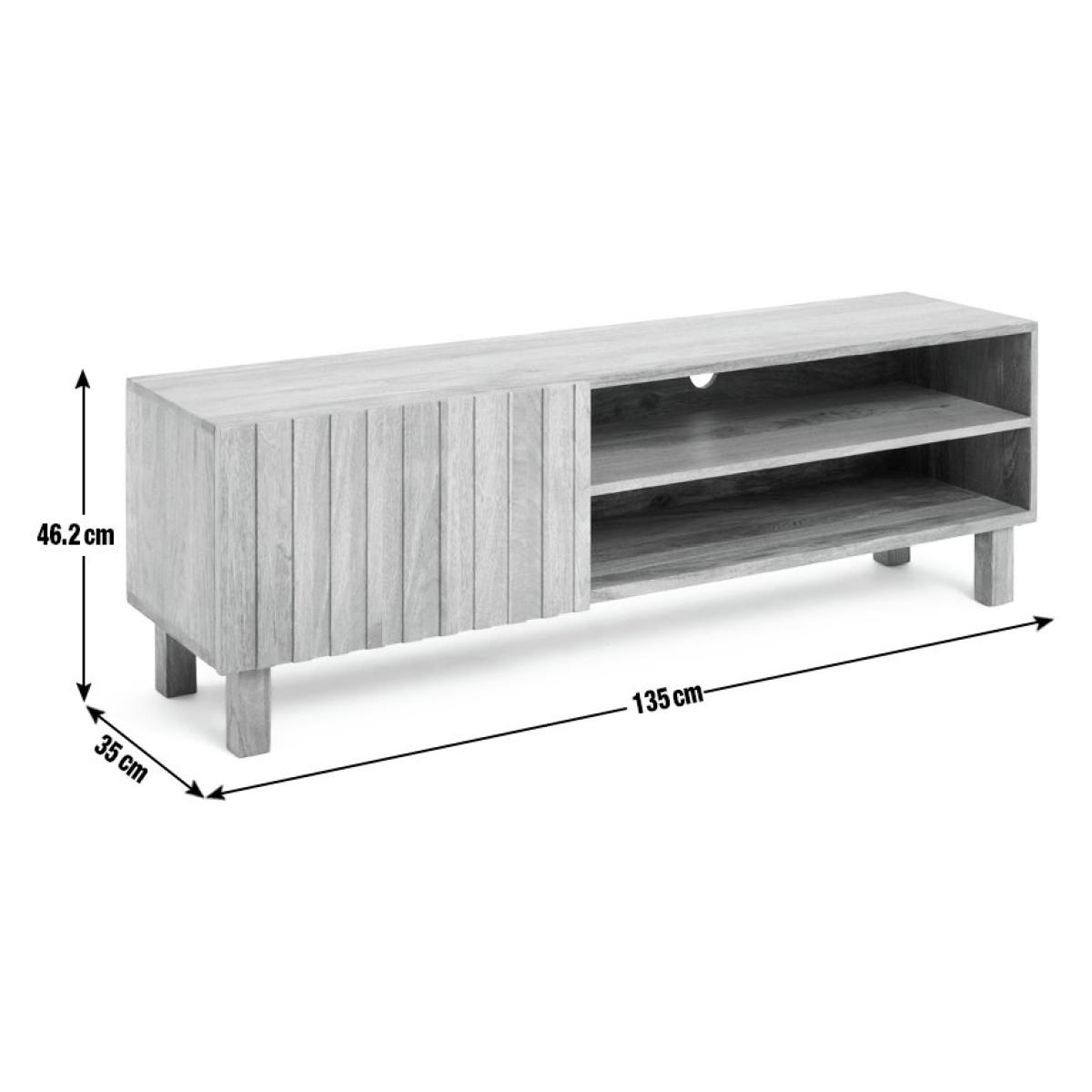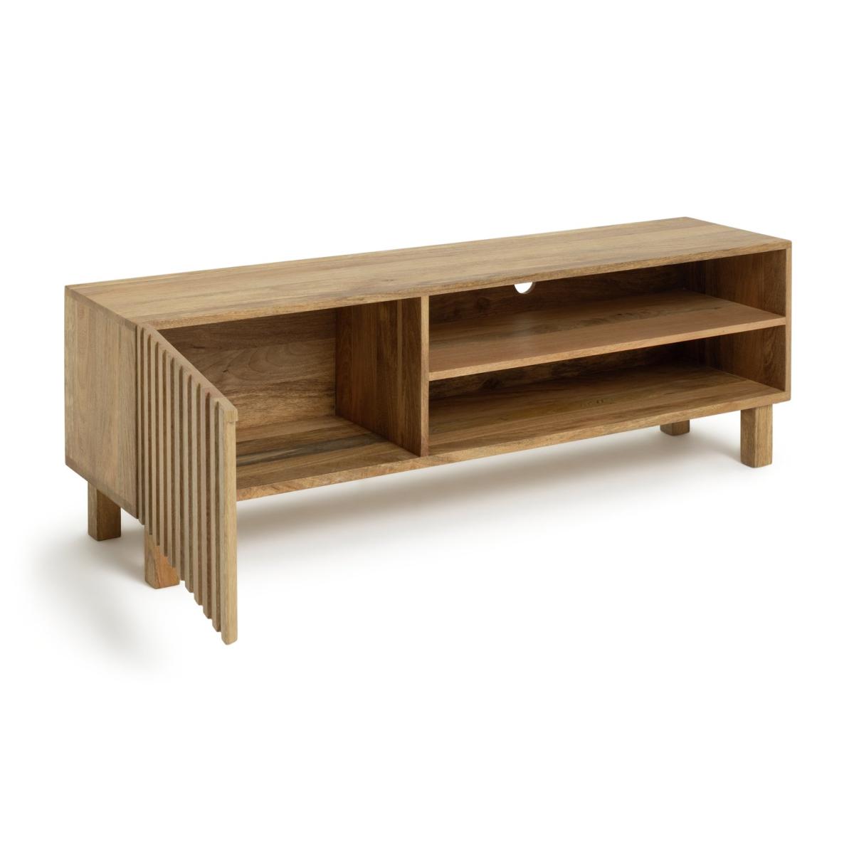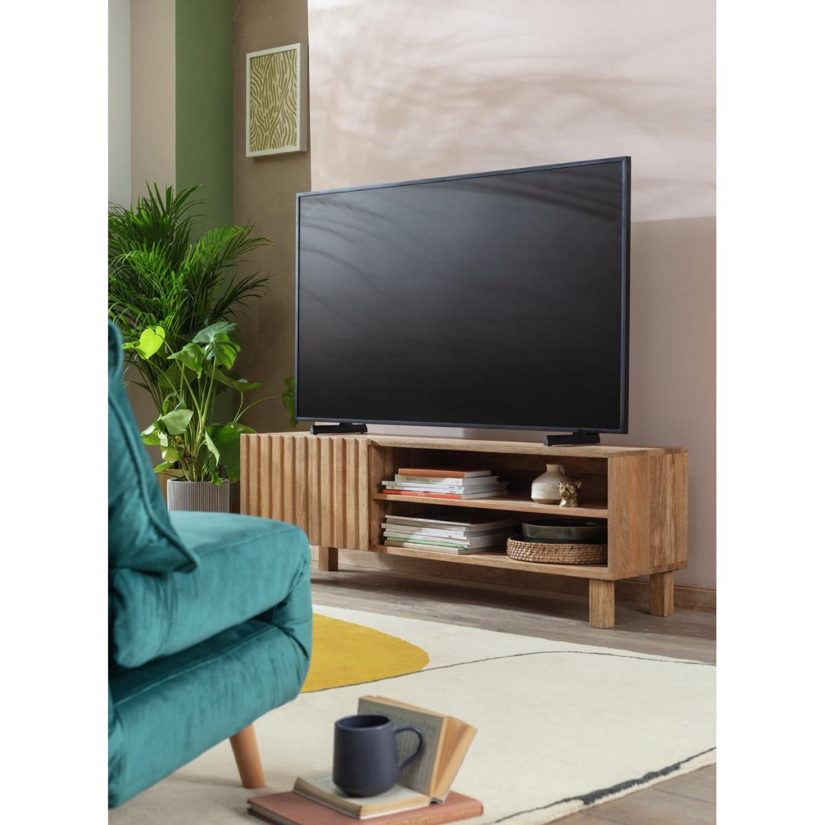 There's something naturally inviting about Jericho. Elevate your interior decor with our 1 door wooden tv unit. Crafted entirely from solid mango, so you know it's hardwearing with a beautiful grain. A great spot to showcase your widescreen tv. With plenty of space on the 2 roomy shelves for your entertainment essentials, mags and more. And you can hide away lounge clutter behind the slatted paneled door. Settle down, it's showtime.