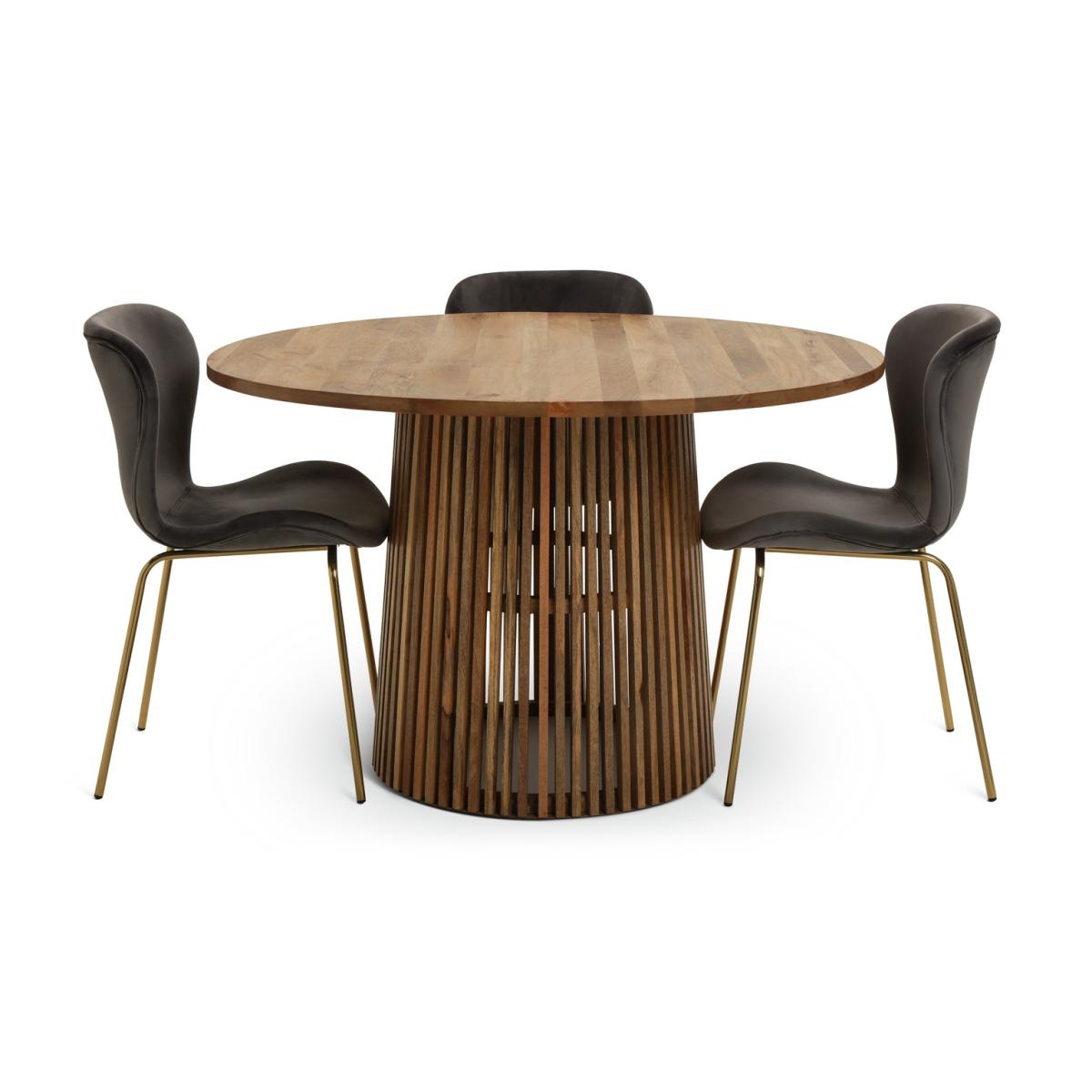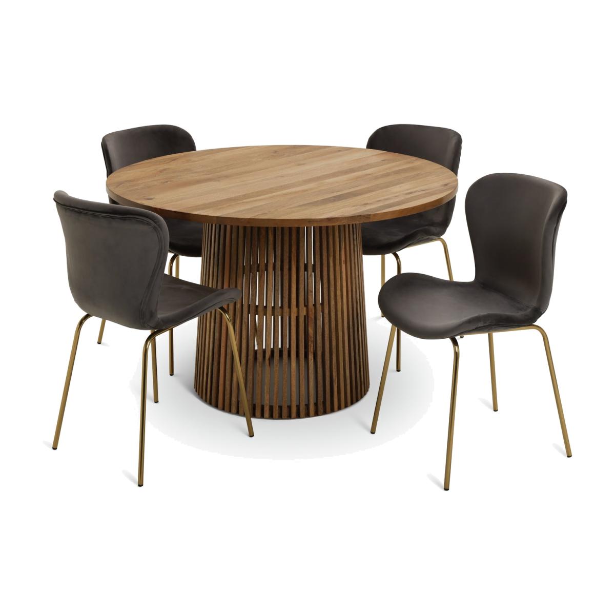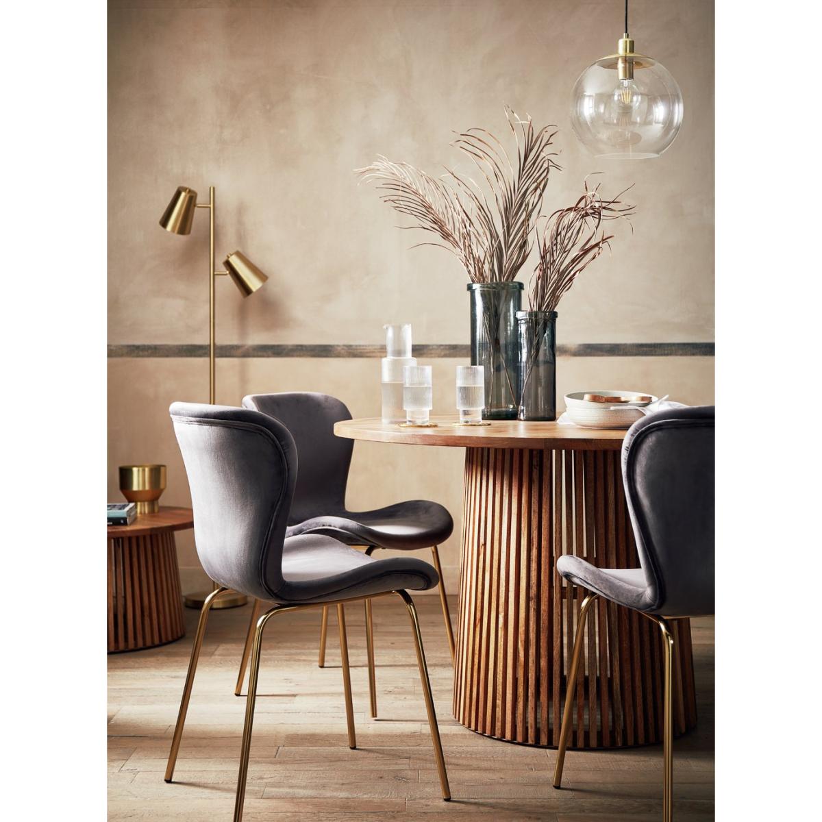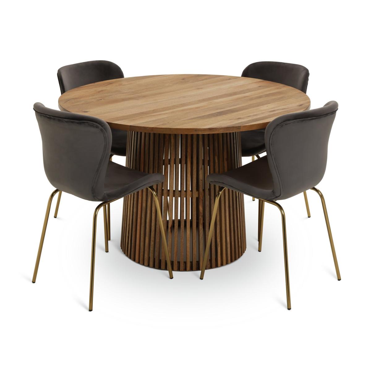 Designer dining. Exclusive to Habitat, this impressive dining set brings a modern relaxed quality to a room. The solid mango wood round table features a statement slatted base. And just look at those chairs. Upholstered in plush grey velvet, the comfortably curved ergonomic shape is so inviting. Gold chrome legs add a solid luxe touch. Together, the table and chairs are contemporary with lashings of cosy. Perfect.