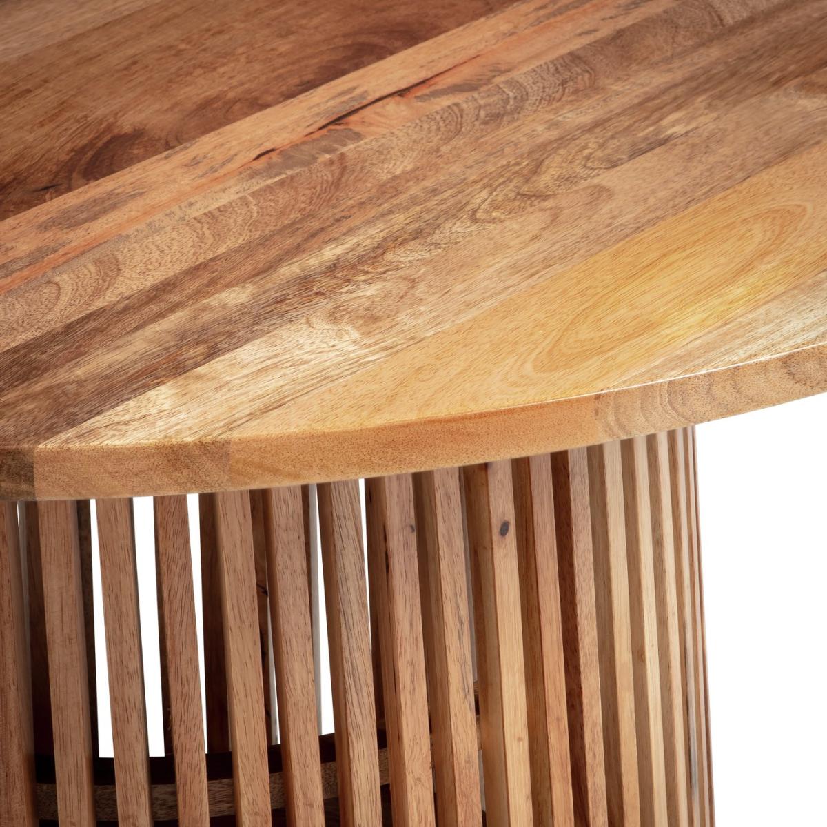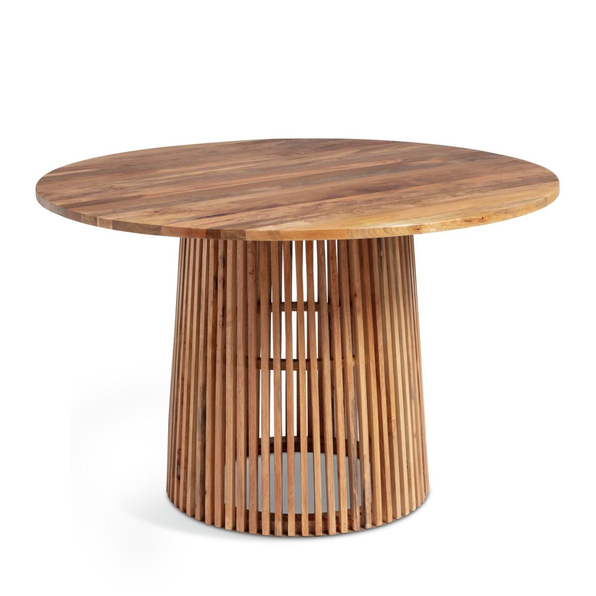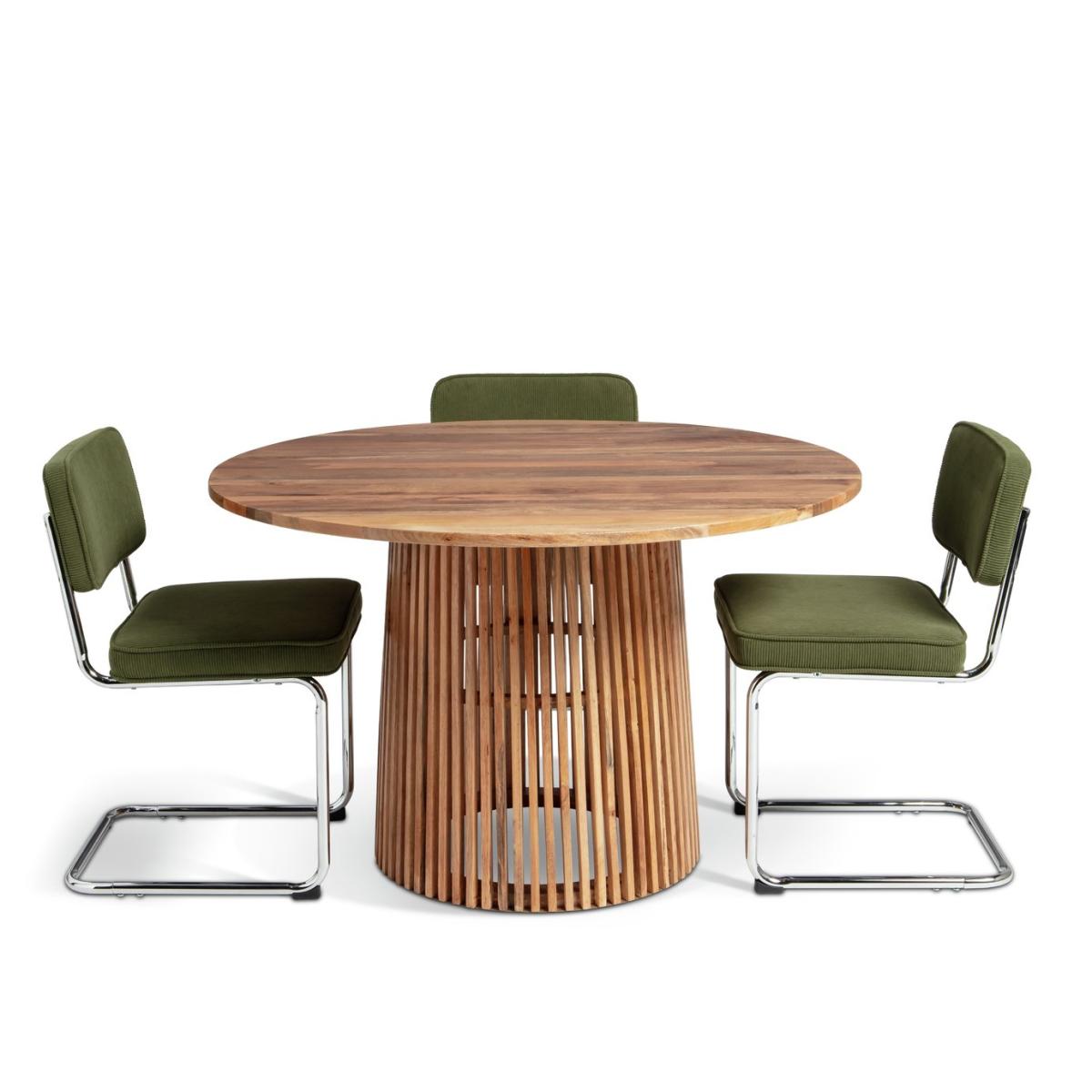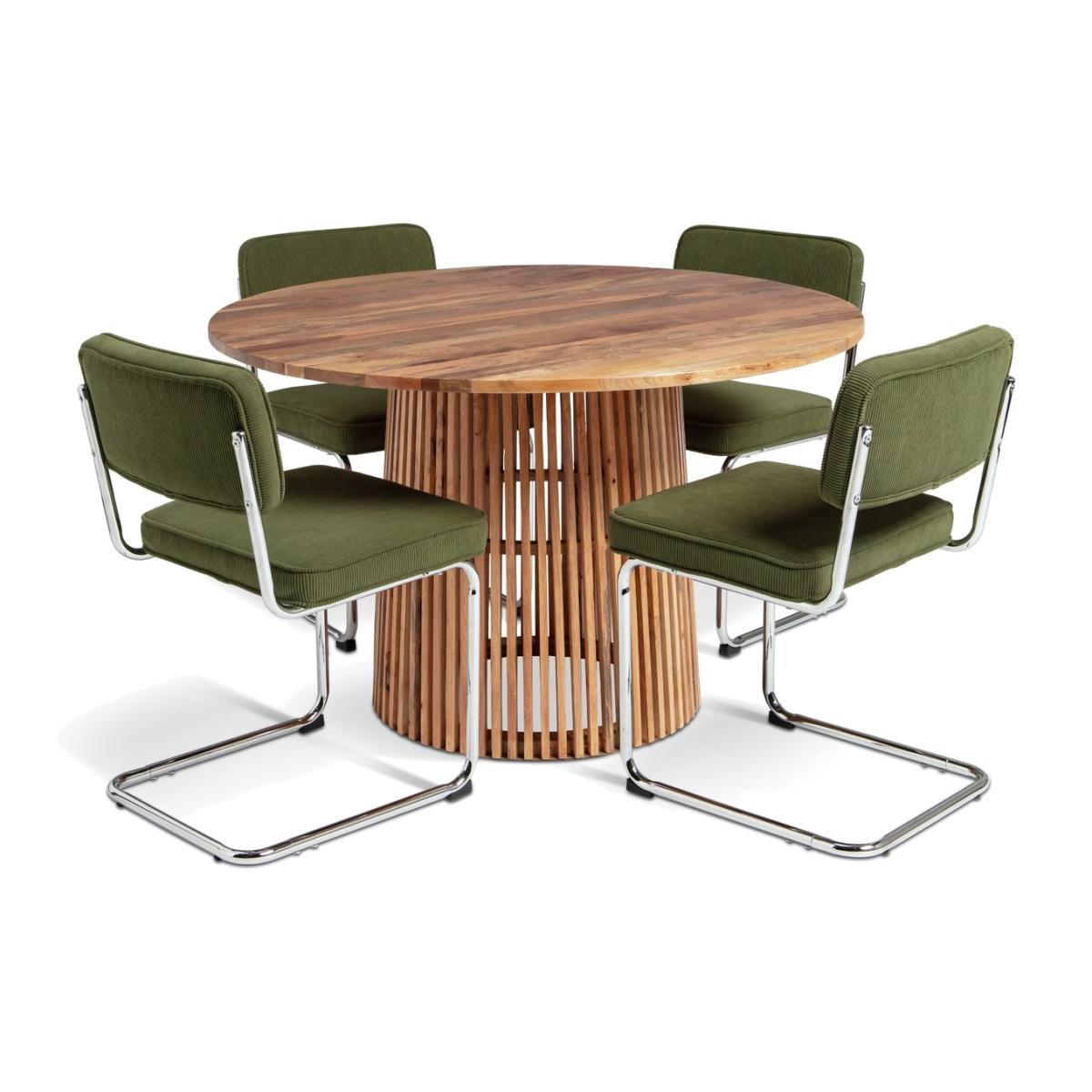 A designer dining combo. Jericho brings a modern relaxed feel to a room. Crafted from mango wood, the round tabletop displays the natural grain beautifully. The sculptural slatted base makes it a striking centre piece. And just look at those Bauhaus-inspired chairs. Upholstered in plush forest green fabric and finished with chrome cantilever frames. A comfy set with a cool retro look. Part of the Jericho collection. Table: Table size H75, D120cm. Solid wood table with solid wood legs. Solid wood table top finish. Chair: Includes 4 chairs. Size of each chair H80, W48.5, D55cm. Seat height 49cm. Metal frame with metal legs. Fabric seat pad. Maximum user weight per chair 100kg. Individual chair weight 8.5kg. Package Dimensions: Table package 1 size H10, W101, D167cm. Table package 2 size H82, W109, D58cm. Individual chair package size H11, W54, D76cm. General information: Self-assembly - 2 people recommended. Manufacturer's 1 year guarantee. Sponge clean. By choosing FSC certified products, you are supporting responsible management of the world's forests.