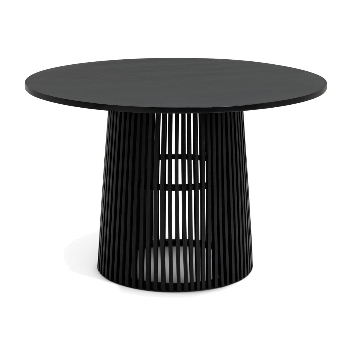 Designer dining. Exclusive to Habitat, our Jericho dining table brings a modern relaxed quality to a room. Crafted from mango wood, it has a dramatic black finish. And what about that impressive base? Open wooden slats make this table a real statement piece. A dinner winner for sure. Complement your new solid wood table by adding 4 new dining chairs. We've lots of designs to choose from. So settle in and take a look. Part of the Jericho collection. Table: Table size: H75,. Diameter 120cm. Solid wood table with solid wood legs. Solid wood table top finish. Self-assembly - 2 people recommended. Weight of table 30kg. Package Dimensions: Table packaging size: H10, W101, D167cm. Table packaging part 2 size: H82, W109, D58cm. General information: Manufacturer's 1 year guarantee. FSC certified meaning the materials used for this product are responsibly sourced.