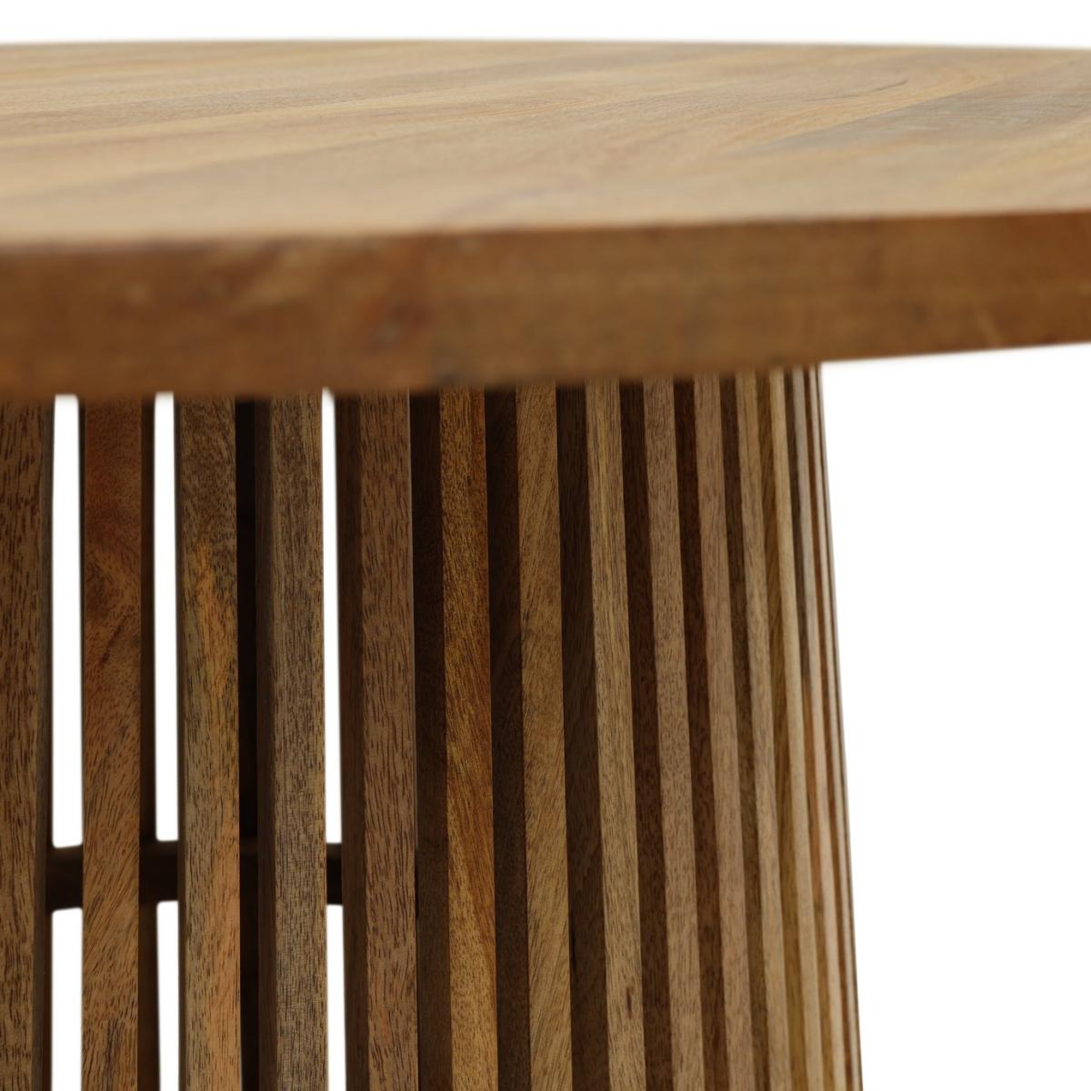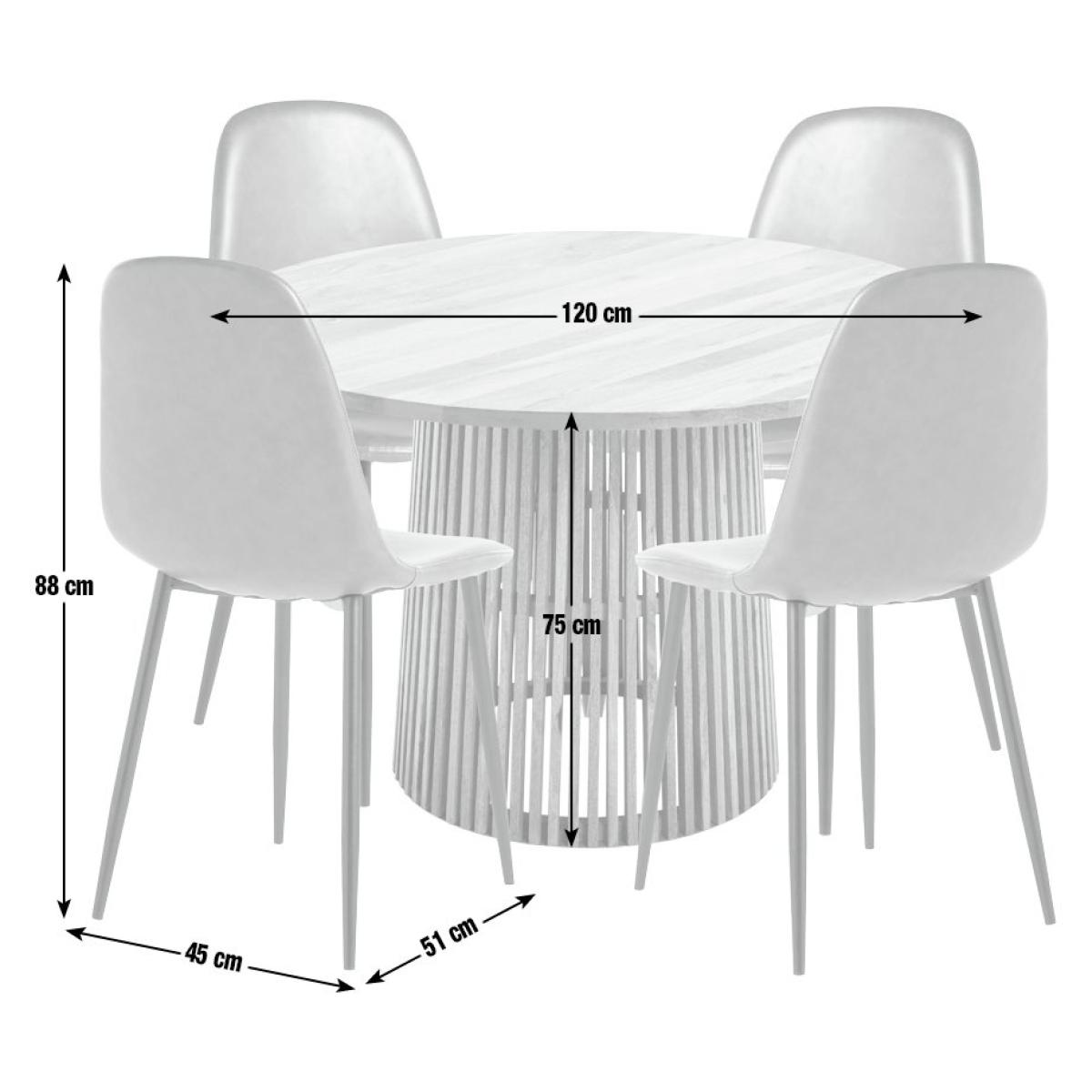 A designer dining combo. This Jericho dining table brings a modern relaxed quality to a room. Crafted from mango wood, the round tabletop displays the natural grain beautifully. A striking base made of open wooden slats makes it a real statement piece. And looks impressive with 4 tan faux leather Beni chairs, featuring comfy padded seats and distinctive tapered legs. Settle in and enjoy. Table: Table size H75, D120cm. Solid wood table with solid wood legs. Solid wood table top finish. Self-assembly - 2 people recommended. Chair: Includes 4 chairs. Size of each chair H88, W45, D51cm. Seat height 45cm. Faux leather frame with wood effect legs. Faux leather seat pad. Self-assembly. Maximum user weight per chair 120kg. Individual chair weight 9.4kg. Package Dimensions: Individual chair package size H50, W56, D60cm. General information: Dust or wipe with a damp cloth only.