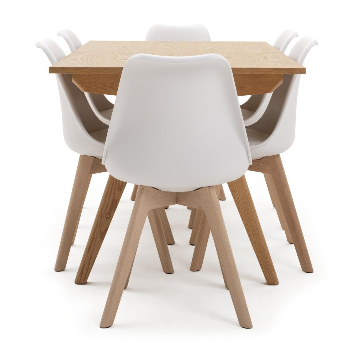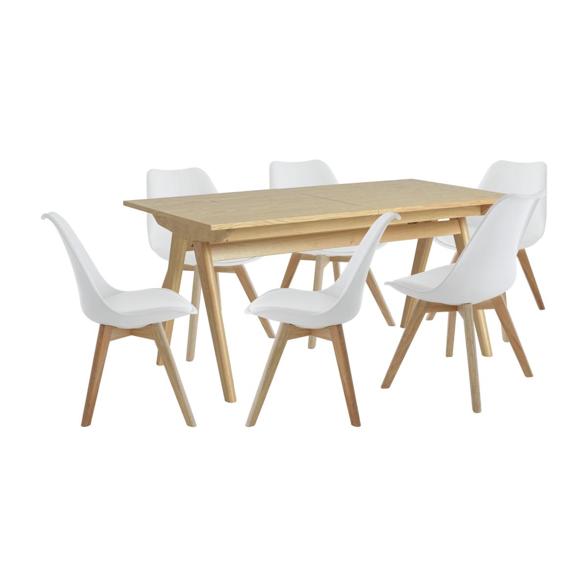 Dinner's served, Skandi style. Meet Jerry, our nifty extendable wooden dining table with 6 matching chairs. Smart, space-saving design fits right in with this clean and contemporary look. This on-trend dining set looks good with minimalist decor and bold colours. Anyone for seconds?
