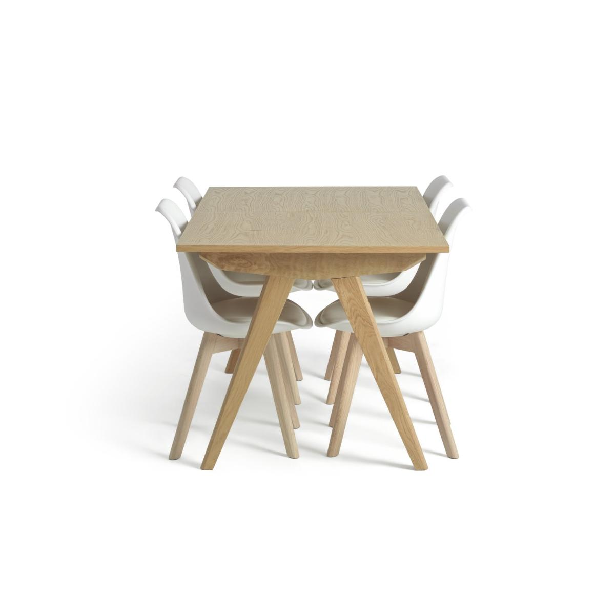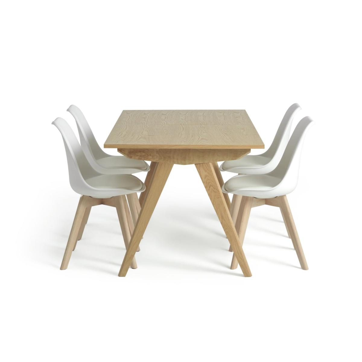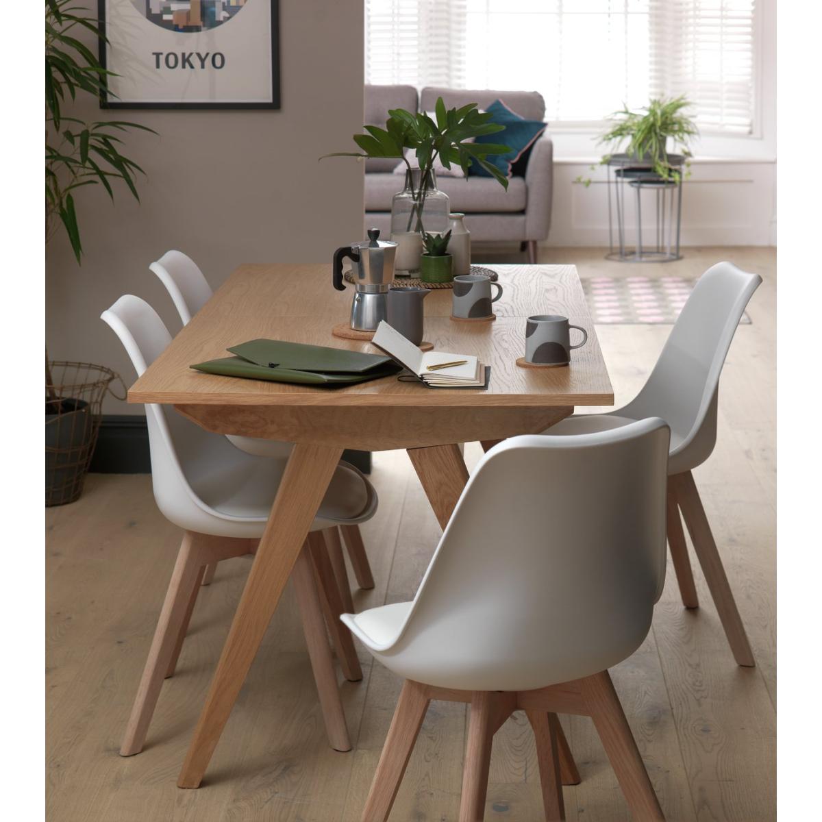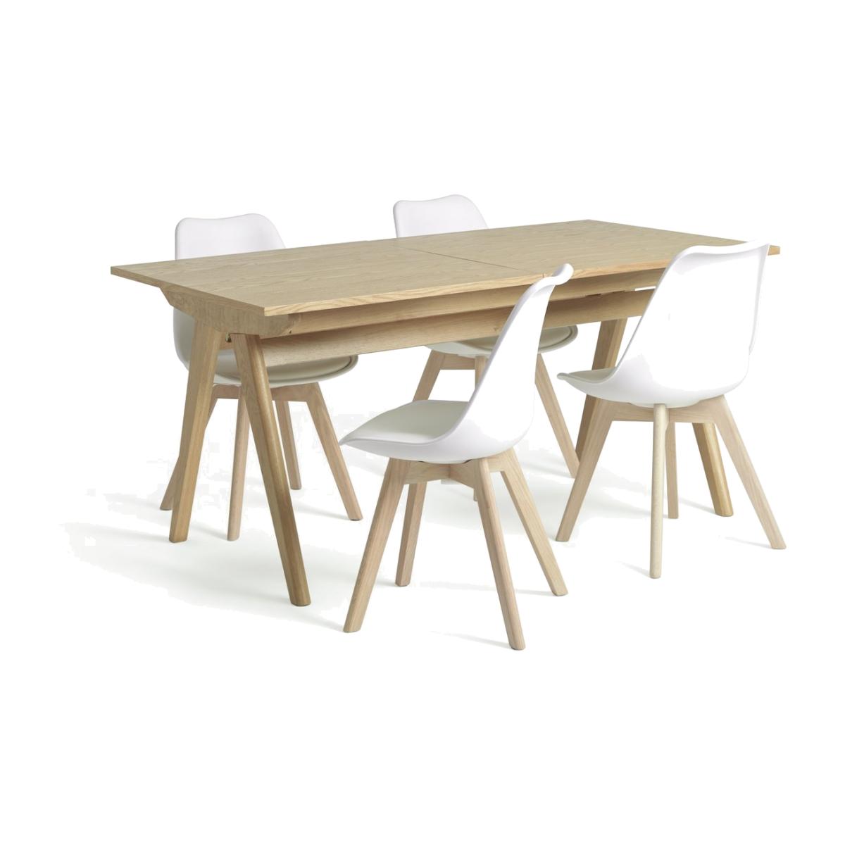 Dinner's served, Skandi style. Meet Jerry, our nifty extendable wooden dining table with 4 matching chairs. Smart, space-saving design fits right in with this clean and contemporary look. Go from feeding 4 to 6 in a flash, just add the central extension piece. In a white and oak finish, this on-trend dining set looks good with minimalist decor and bold colours. Anyone for seconds?