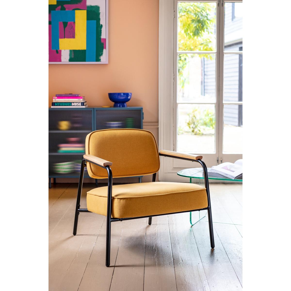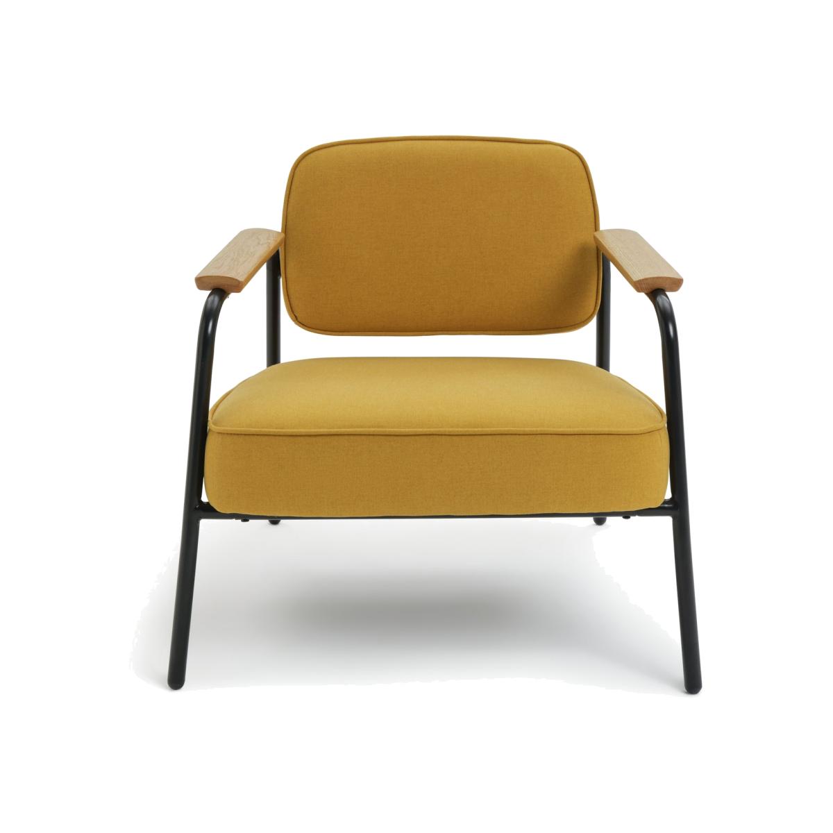 Lounge away in our Jesper chair. A distinctive black metal frame, oak armrests and deep yellow brushed linen upholstery give this comfy chair its stand-alone style. A timeless take on the industrial look with a passing nod to mid-century cool. We're loving it. A bold accent chair for traditional or modern schemes, all it needs is the perfect spot.