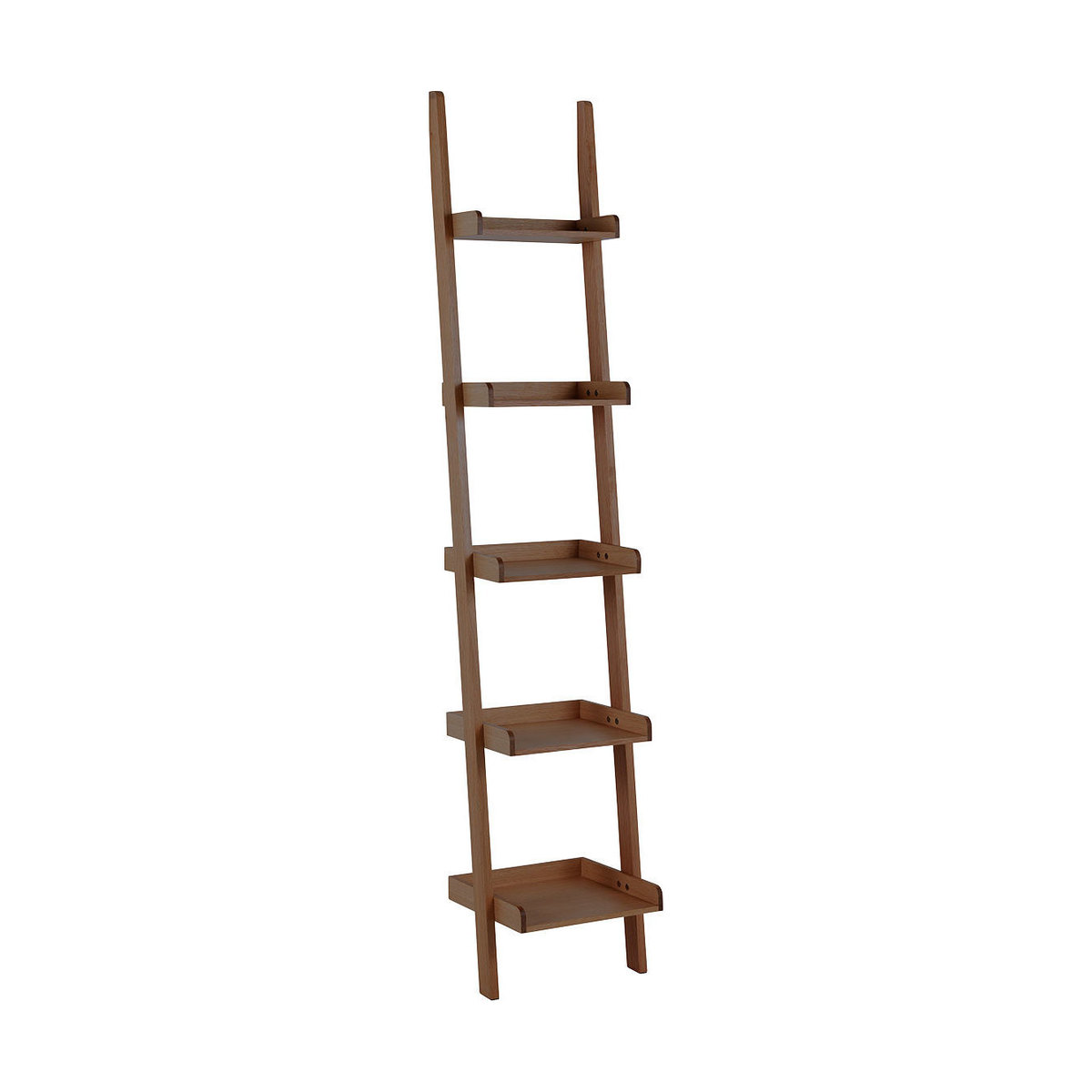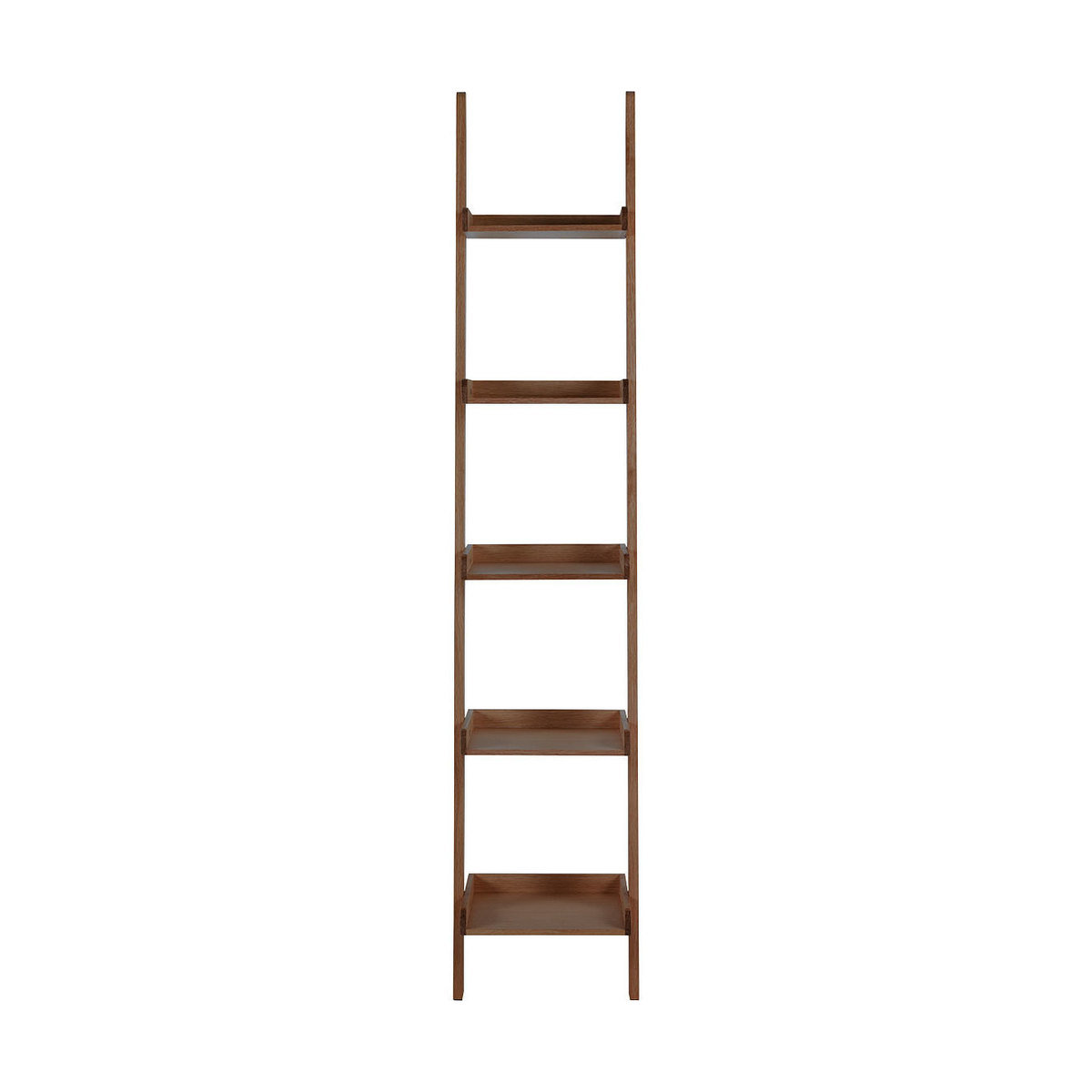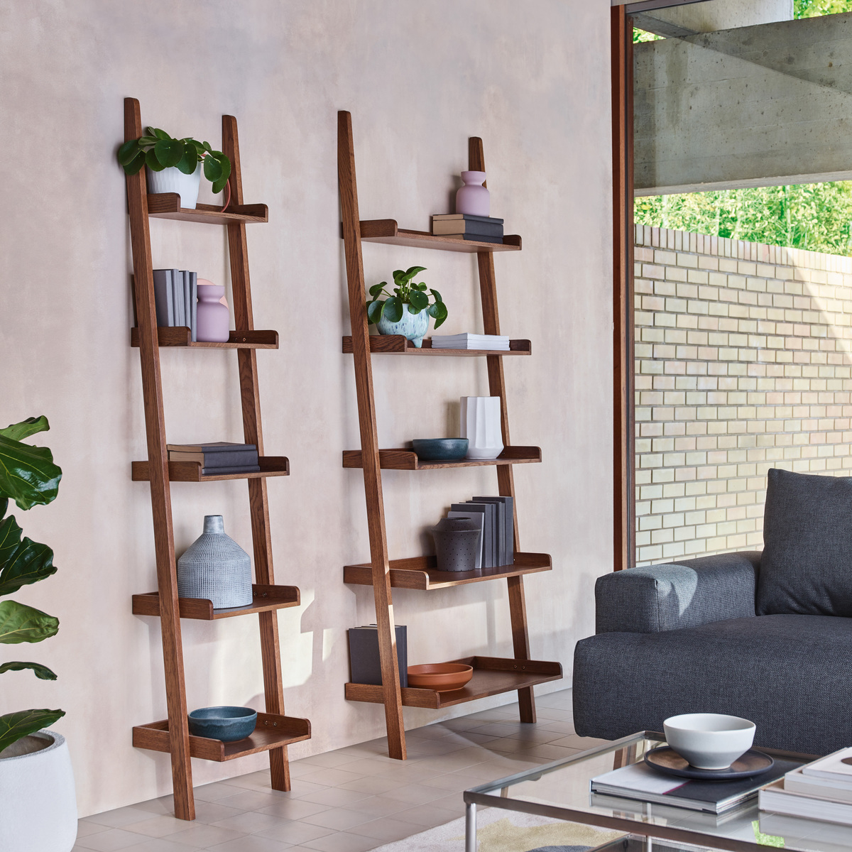 Perfect for smaller spaces, this versatile narrow leaning bookcase provides storage and display space for books and decorative objects. Jessie has clean, crisp lines in walnut veneer with solid uprights and a durable, lacquered finish, and attaches to the wall for safety.