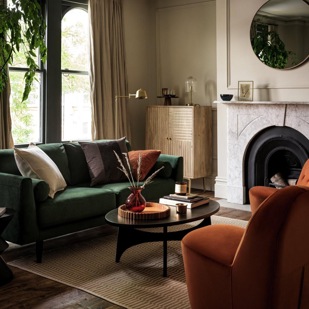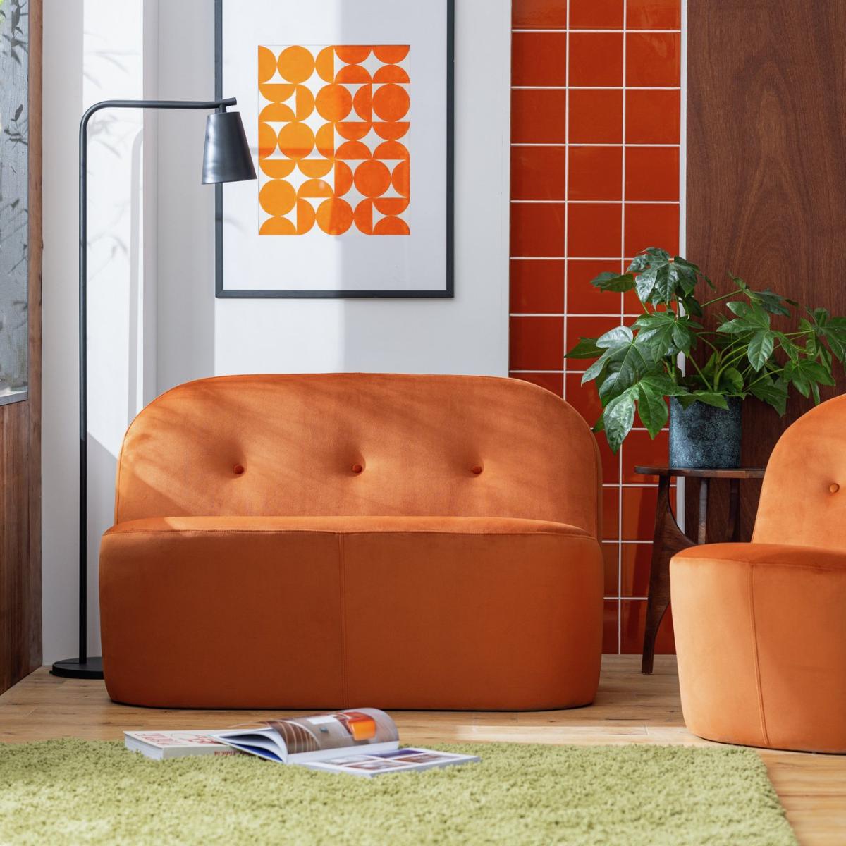 Va va voom. Meet Jetson. A master class in compact, mid-century design. An in-house Habitat exclusive that brings uber style to small spaces. With a rounded, single piece seat and buttoned backrest it offers comfy and supportive sitting. Upholstered in a fiery burnt-orange velvet, Jetson is a complete head turner. We absolutely love it. Part of the Jetson collection. Material: Made from 100% velvet. Medium firm seat cushions. Fixed seats with foam filling. Fixed cushion(s) with foam filling. Free fabric swatch available on this line. Dimensions: Size H74.5, W117.5, D74cm. Floor to seat height: 43cm. Depth of seat: 43cm. Height of seat back: 37cm. Width of seating area between arms: 116cm. Weight 22.63kg. Professional clean only. Fully assembled. Maximum individual user weight 110kg. Packaged dimensions: Package size H75, W119, D45cm. FSC certified meaning the materials used for this product are responsibly sourced. General information: Manufacturer's 2 Year (1 year fabric) guarantee.