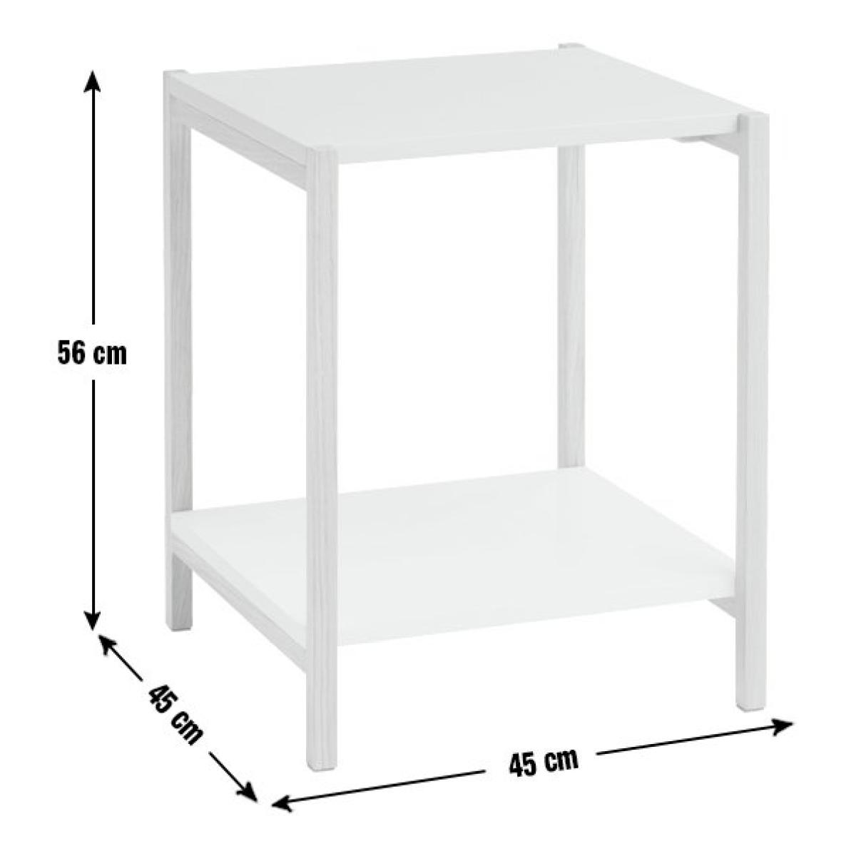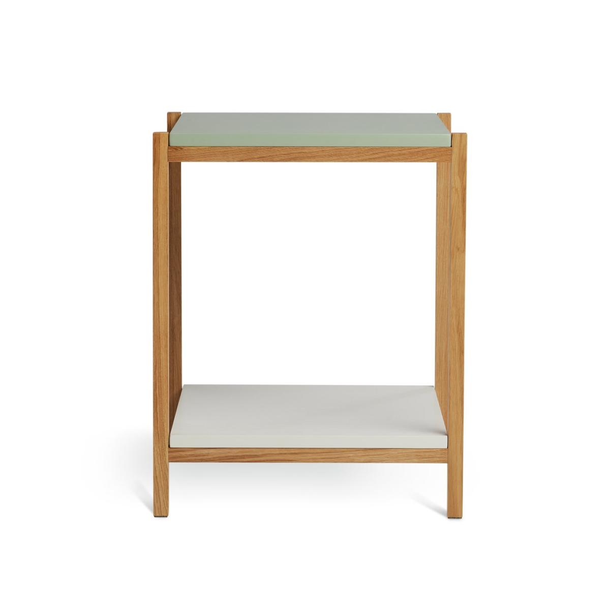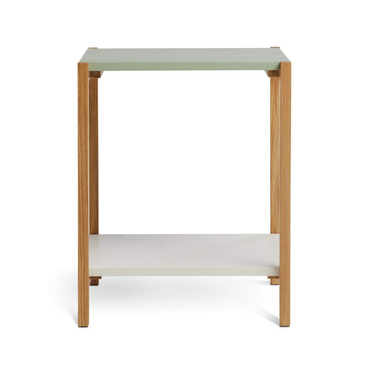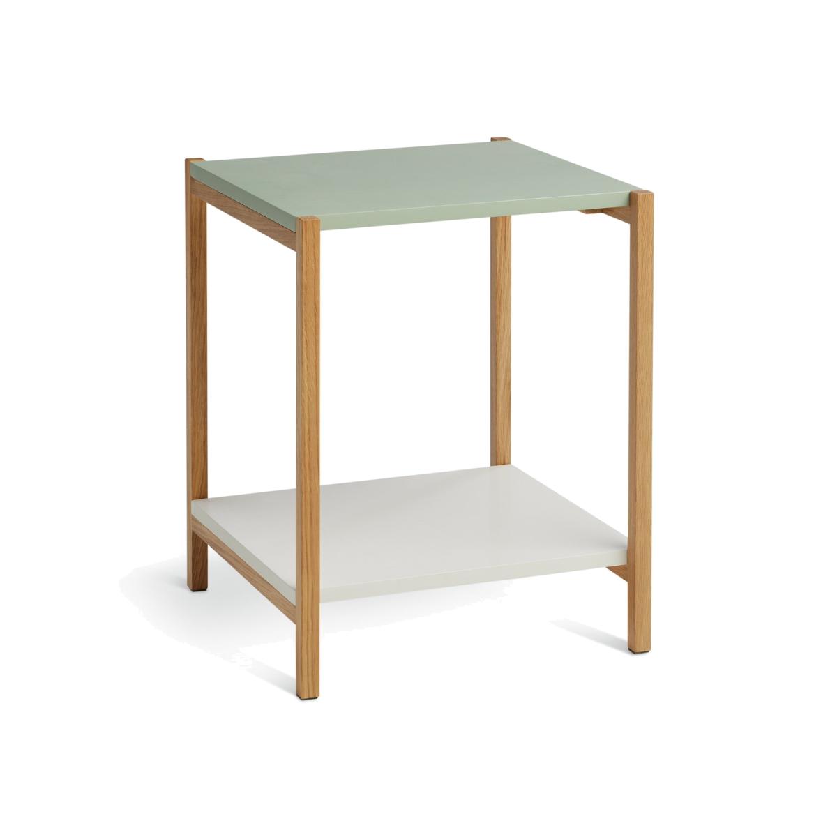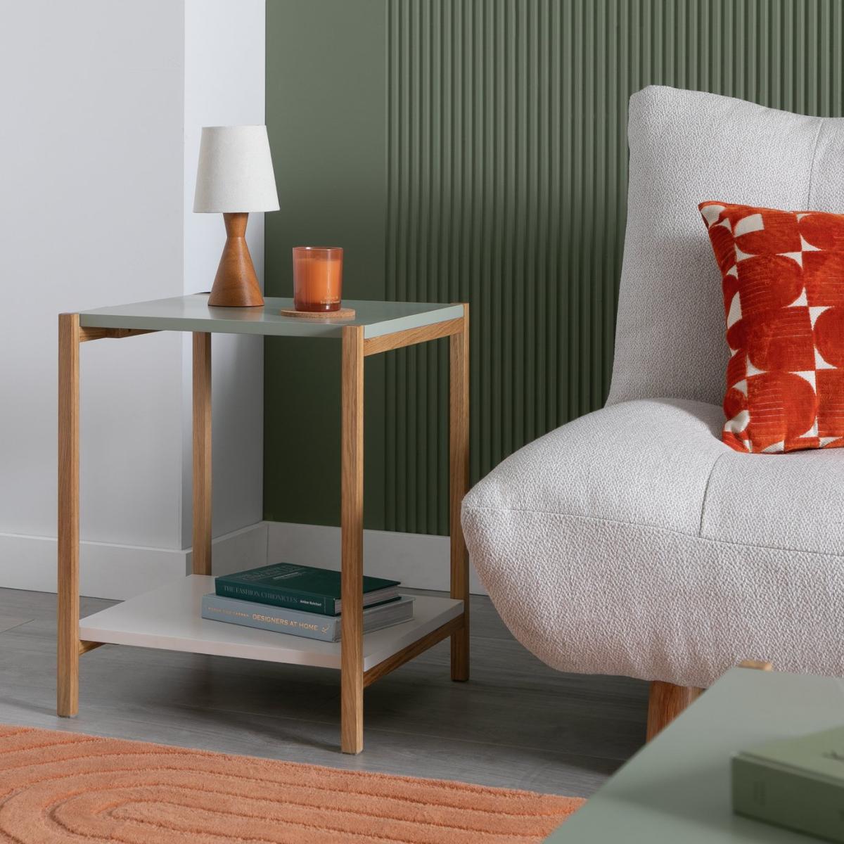 Fresh, funky fun. Here's a stylish side table for your living room or bedroom. The 2 sturdy shelves in sage green and white are nestled within a natural oak frame. A modern design that brings a playful pop of colour wherever it goes. Green on top or white on top? Both shelves are interchangeable, so you can put it together to suit your style. Part of the Jive collection. Size H 56, W 45, D 45cm. Made from oak with a painted finish. 1 undershelf. Weight 6.6kg. Self-assembly - 2 people recommended. Maximum load weight 50kg. Package Dimensions: Package 1 dimensions: H14, W64, D56cm. Package 1 weight: 7.8kg. General information: Manufacturer's 1 year guarantee.