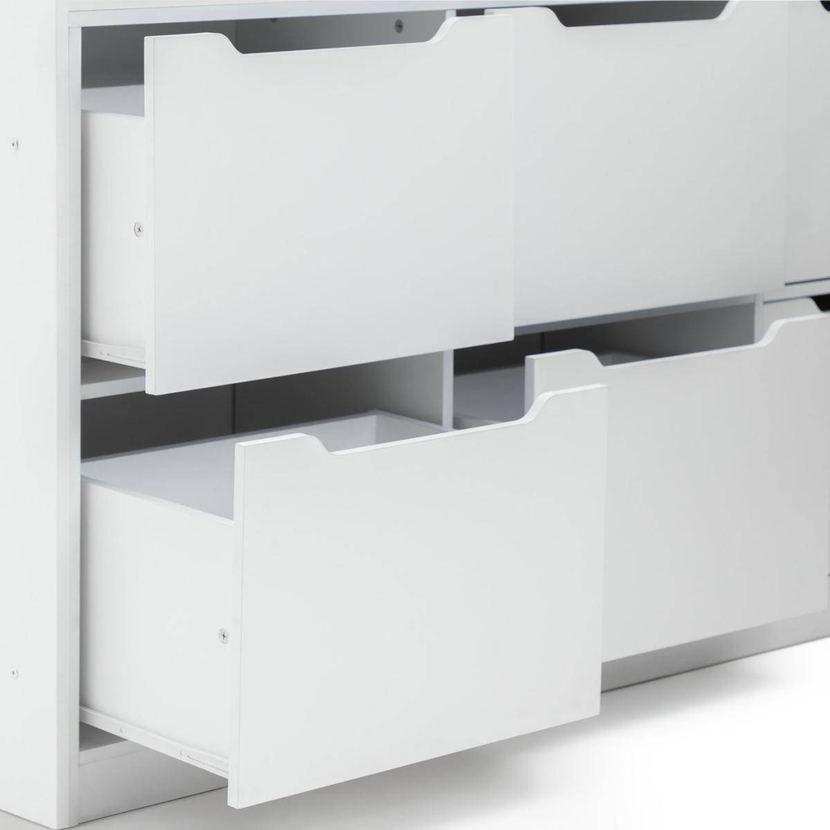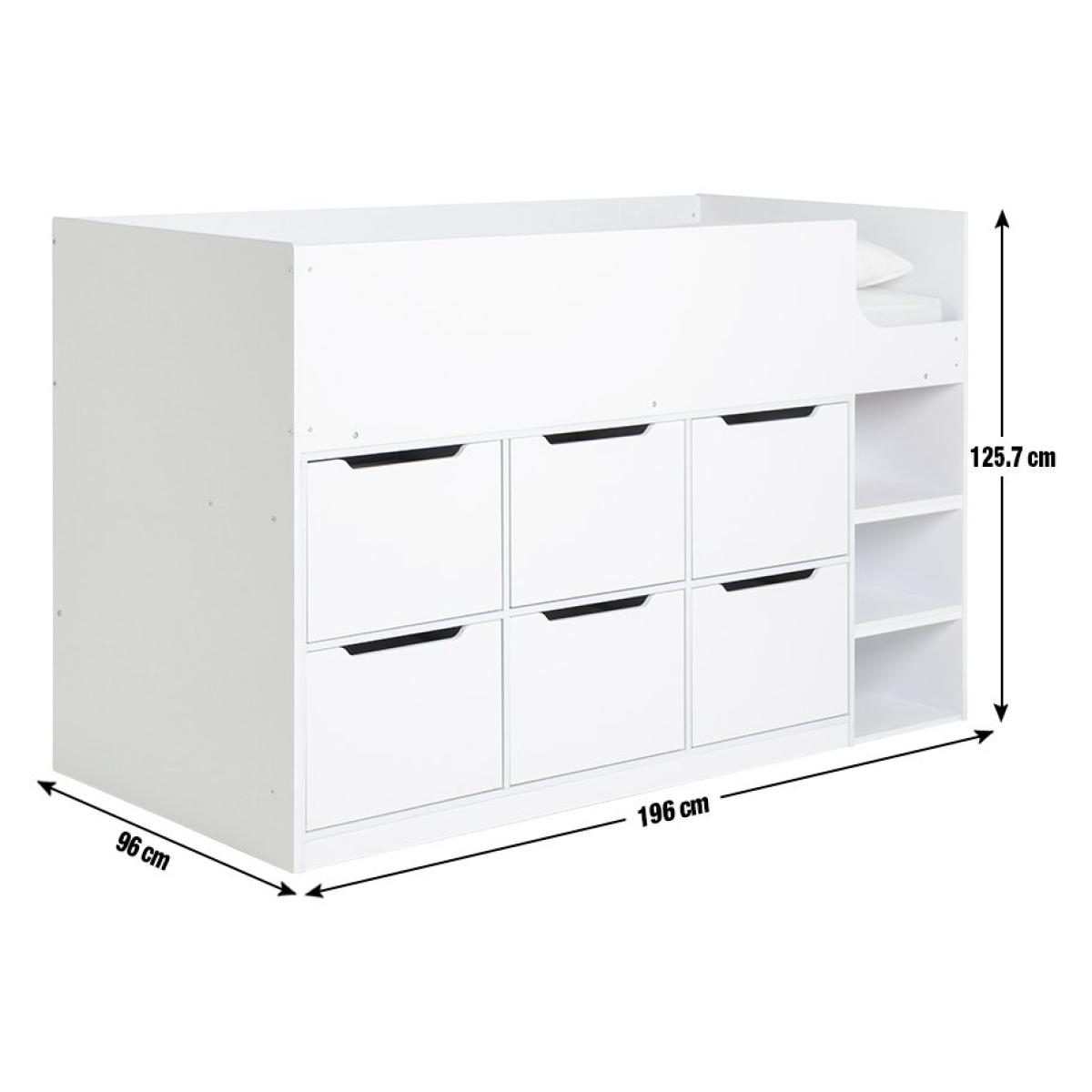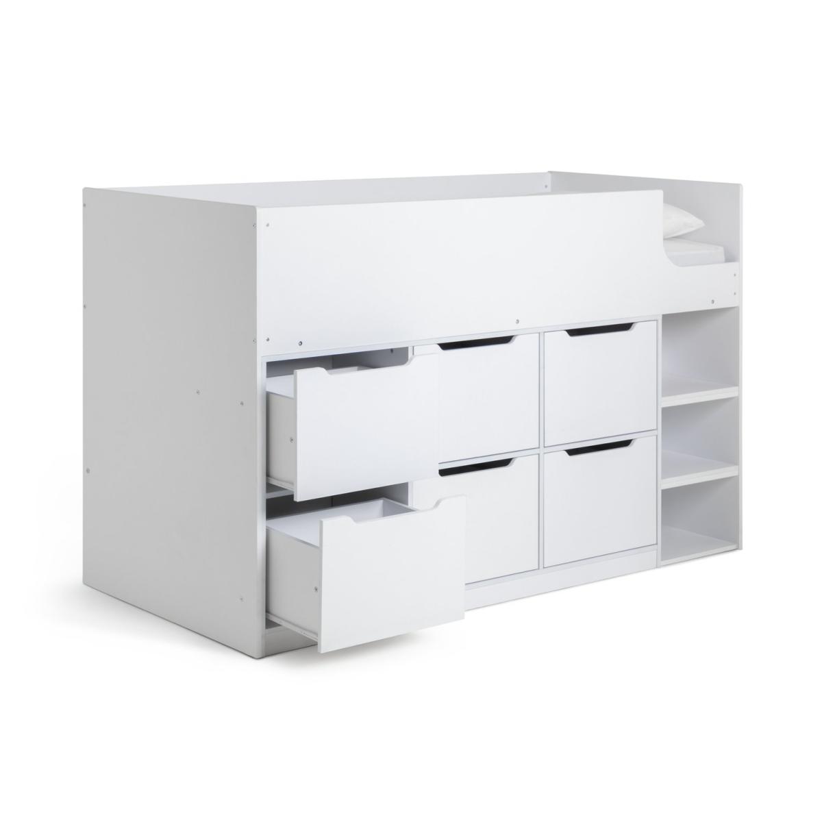 Kids will love our Jude mid-sleeper bed. With 6 generous drawers and 3 deep shelves, there's plenty of room to stow away games, books and toys. The bright white frame is fresh and modern, and a sturdy ladder is fixed in place, so, clambering onboard is easy. Comes with pine slats for mattress ventilation and support.