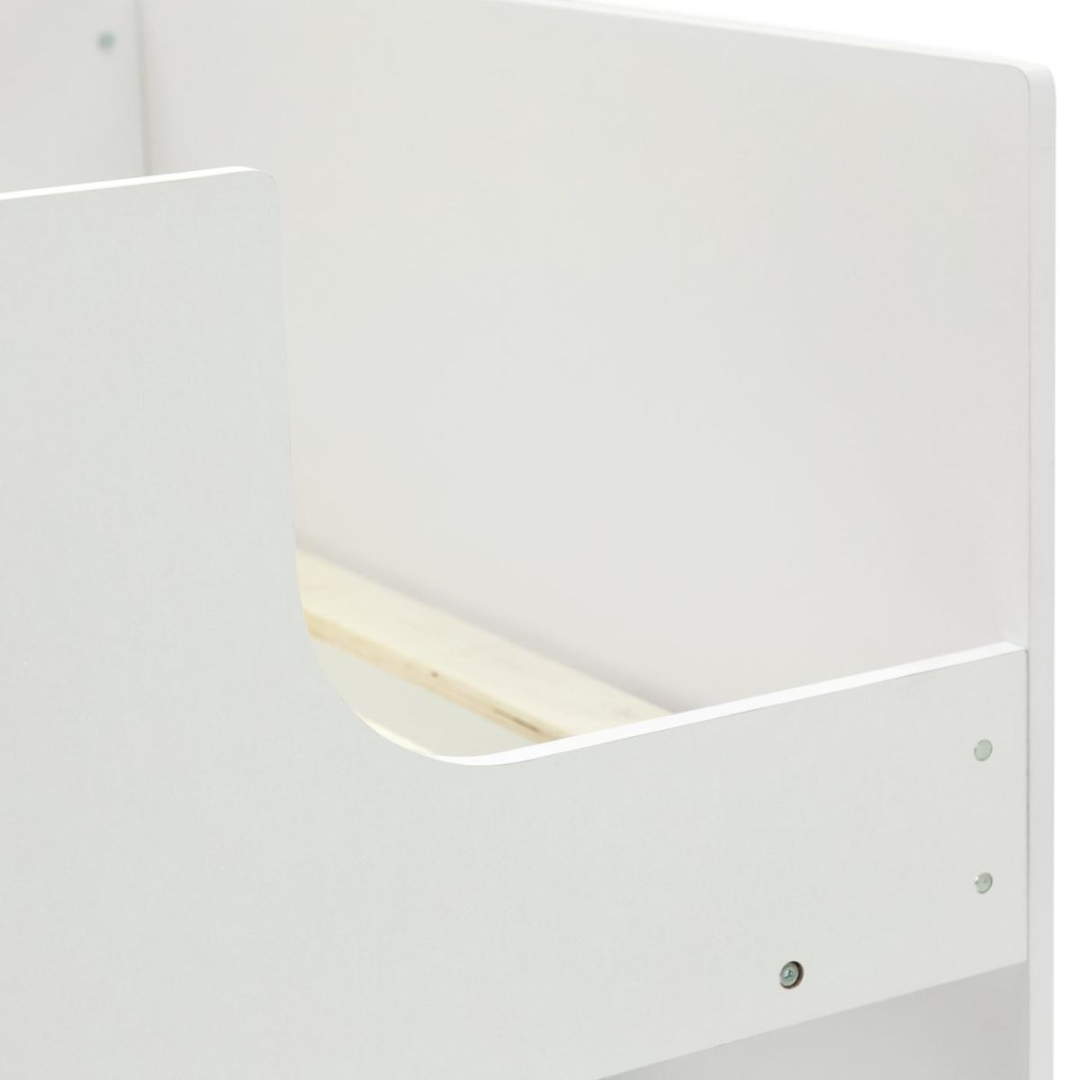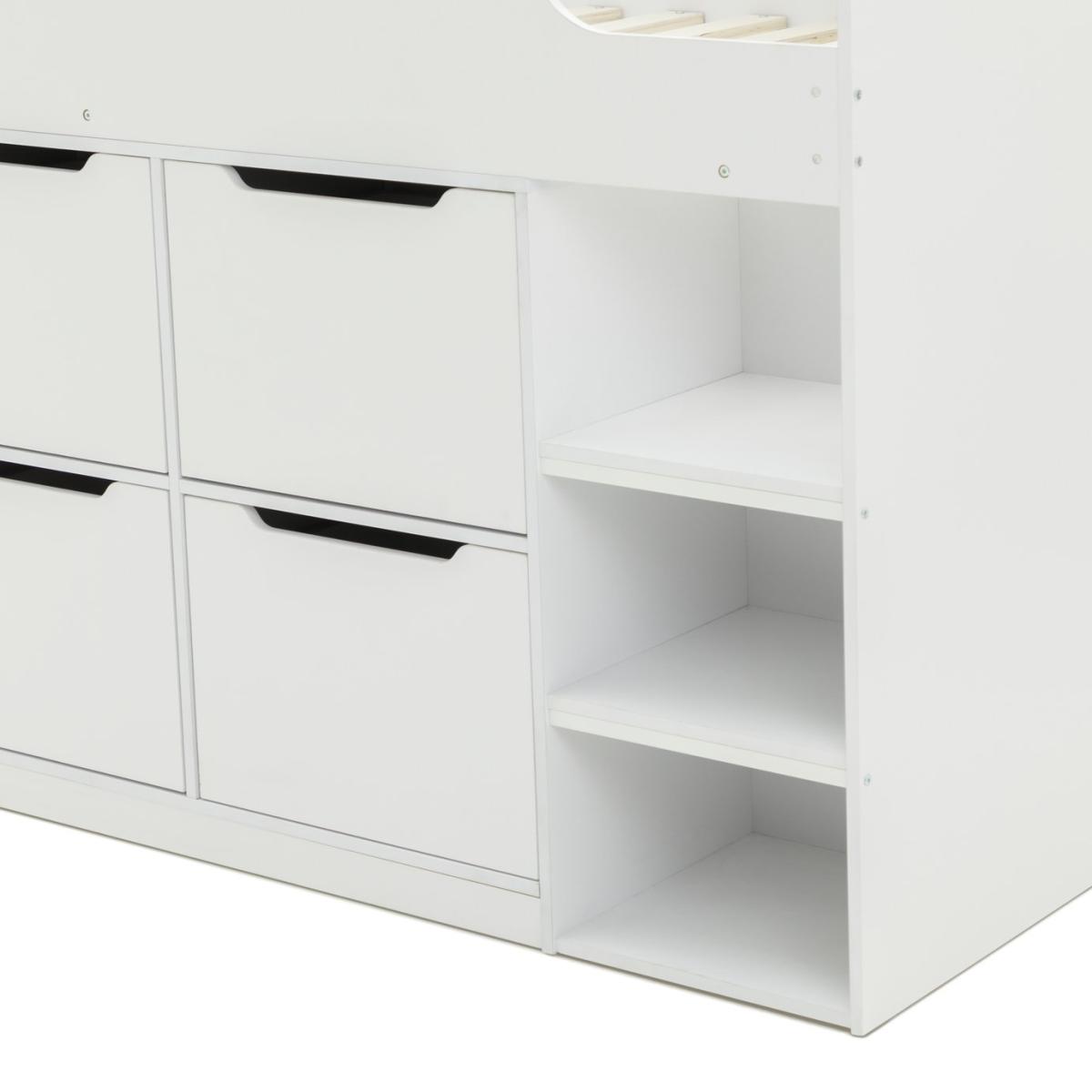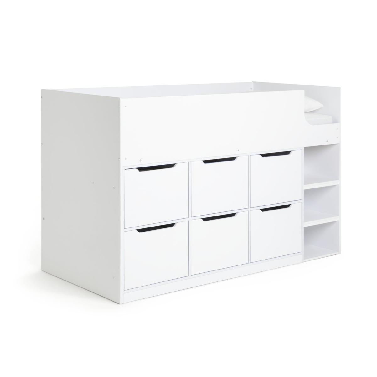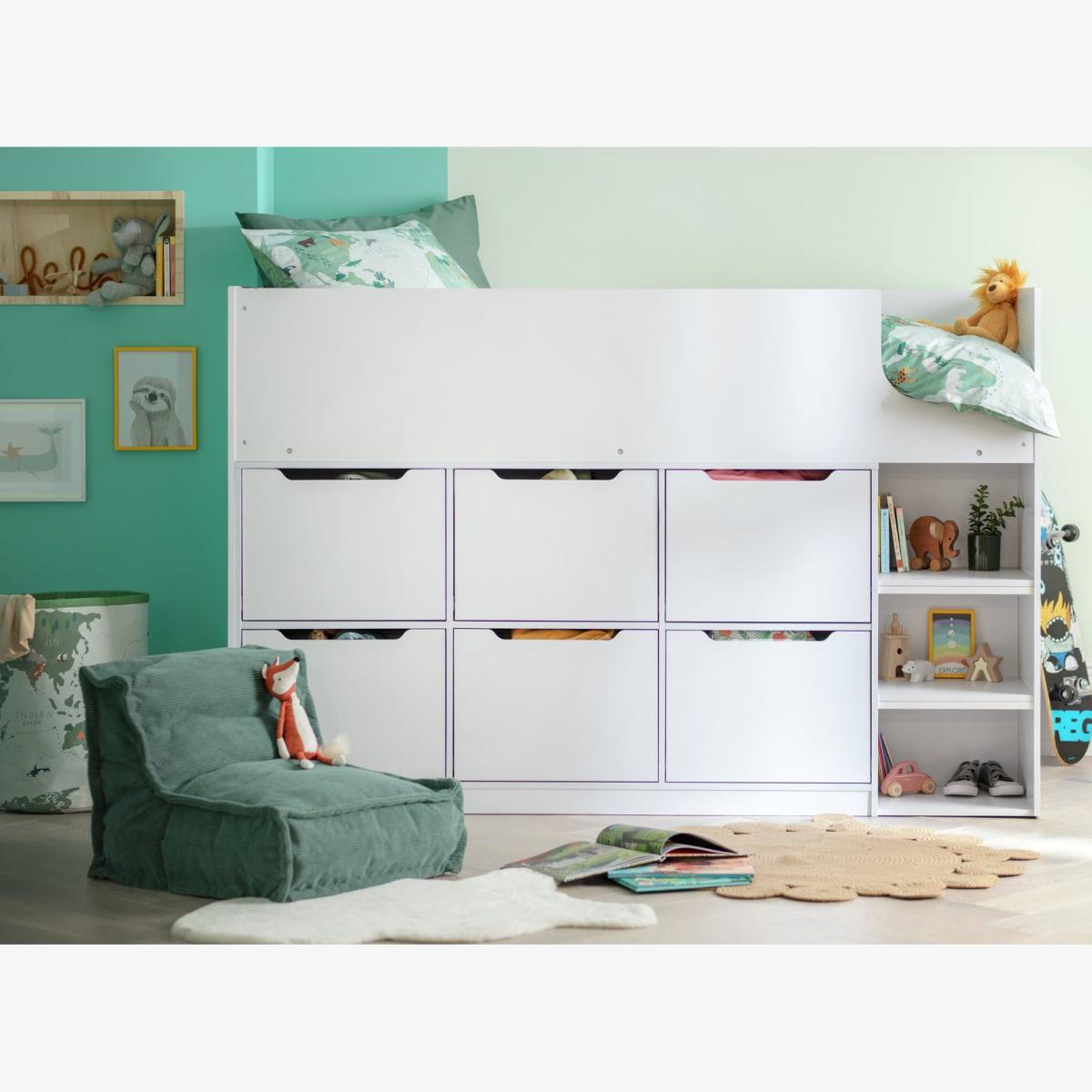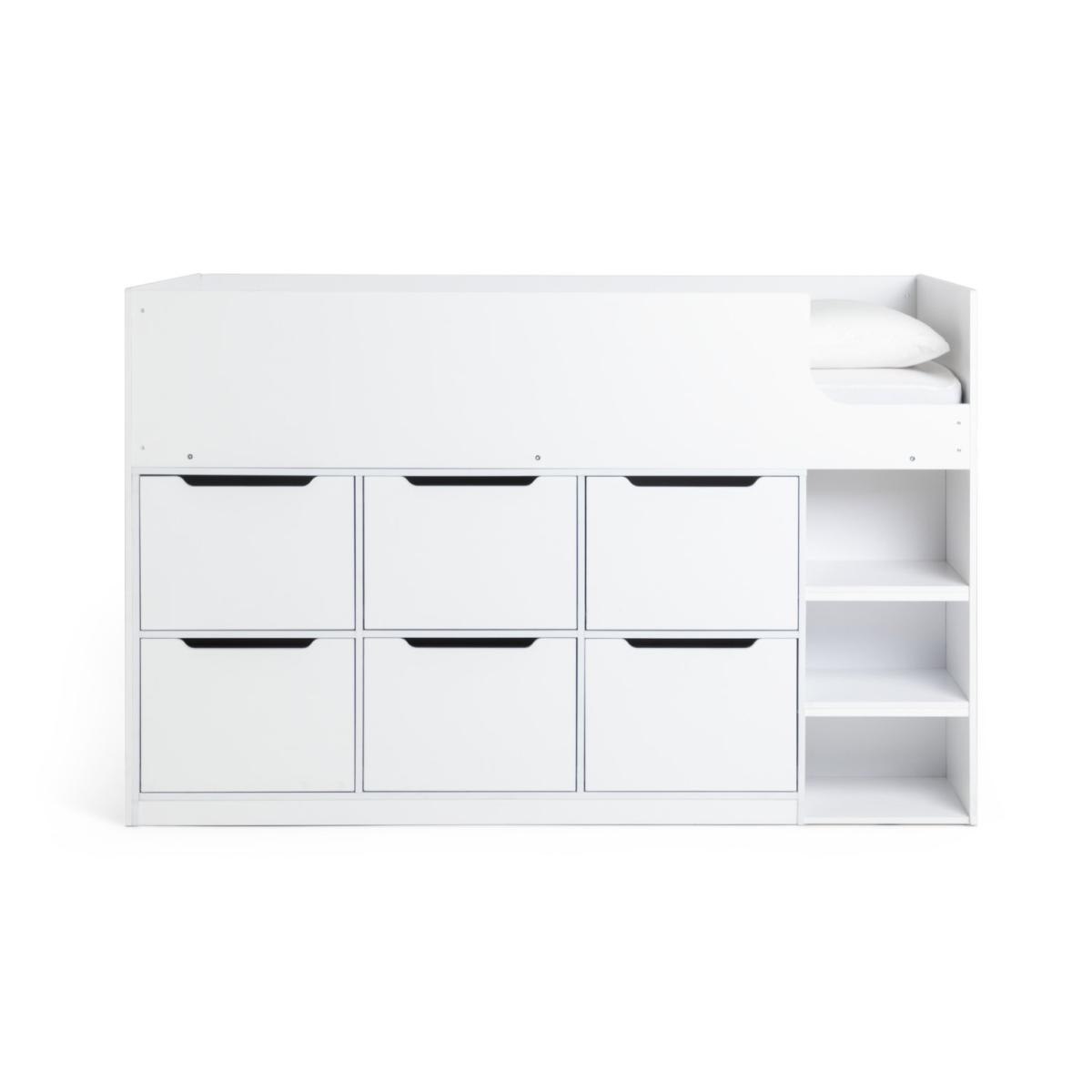 Tuck them up and tidy up. Kids will love to check in to our Jude mid-sleeper bed. With 6 generous storage drawers and 3 deep shelves below, there's plenty of room to stow away their games, books and toys. The bright white frame is fresh and modern, and a sturdy ladder is fixed in place, so, clambering onboard is easy. Comes with a comfy anti-allergy mattress.