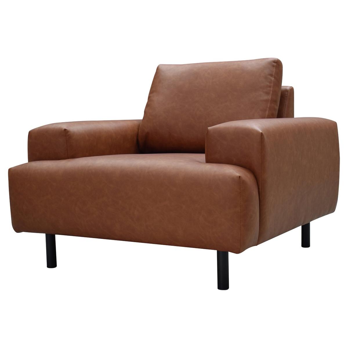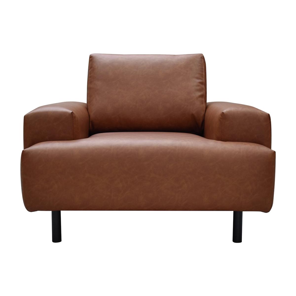 Armed with city living charm. Julien's generous dimensions make this one cosy chair. Race to the lounge to nab the prime spot. Once you're seated, you'll discover the foam-filled T-shaped seat cushions and foam back cushions offer the utmost comfort and support. Upholstered in tan faux leather. It has the look and feel of real hide but without the upkeep. Designed in-house, this Habitat armchair's wide arms and cylindrical legs give it a masculine edge. Clamber on and nestle down. Part of the Julien collection. Material: PU faux leather. Made from 100% faux leatherpolyurethane. Metal feet. Fixed seat with foam filling. Reversible cushion(s) with fibre filling. Dimensions: Size H82.5, W104.5, D96.5cm. Floor to seat height: 44cm. Depth of seat: 60cm. Height of seat back: 36cm. Width of seating area between arms: 58cm. Height of arm rest: 12cm. Weight: 30kg. Packaged dimensions: Package size H58, W106.5, D98.5cm. General information: FSC certified meaning the materials used for this product are responsibly sourced. Do not clean with abrasives. Plump cushions regularly to maintain shape. Minimal assembly - just add feet. Maximum individual user weight 110kg. Manufacturer's 2 year guarantee.