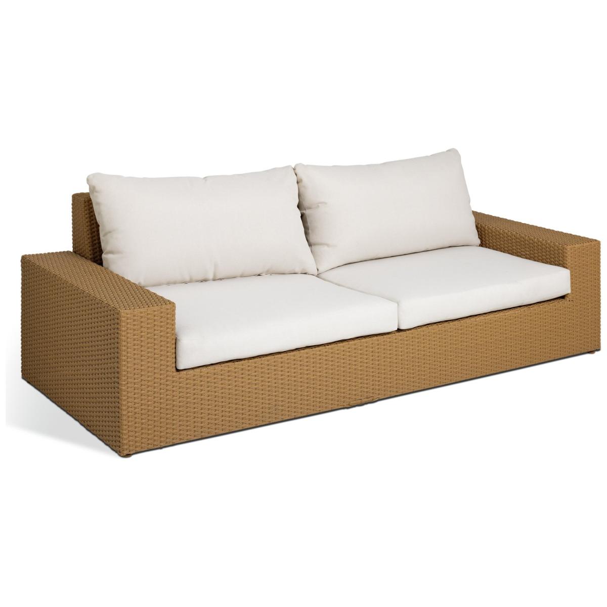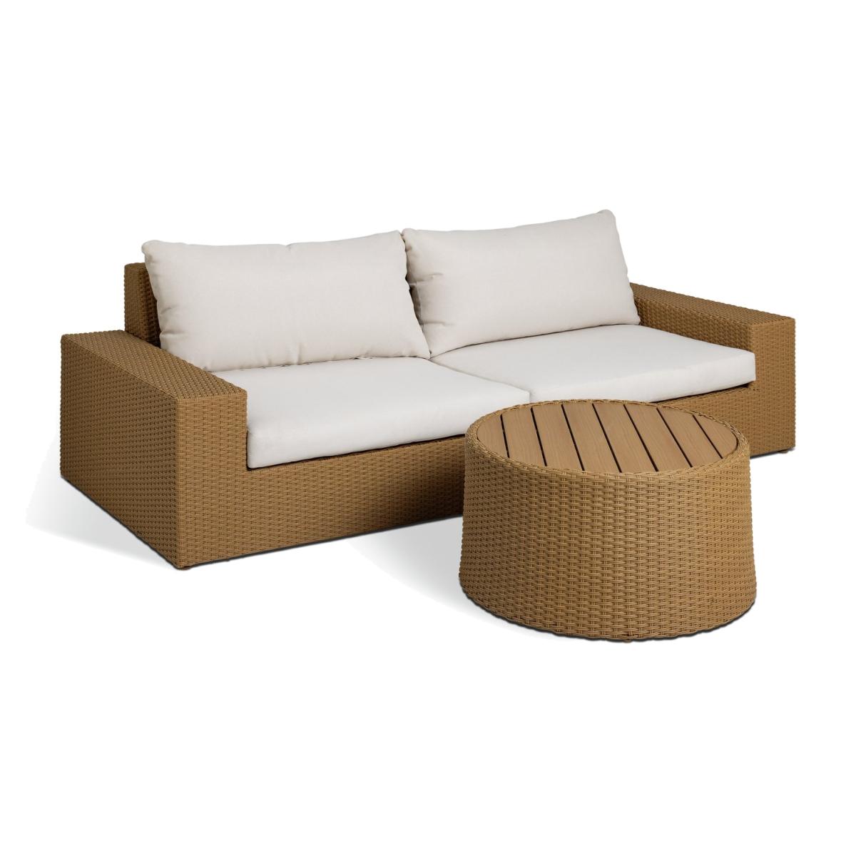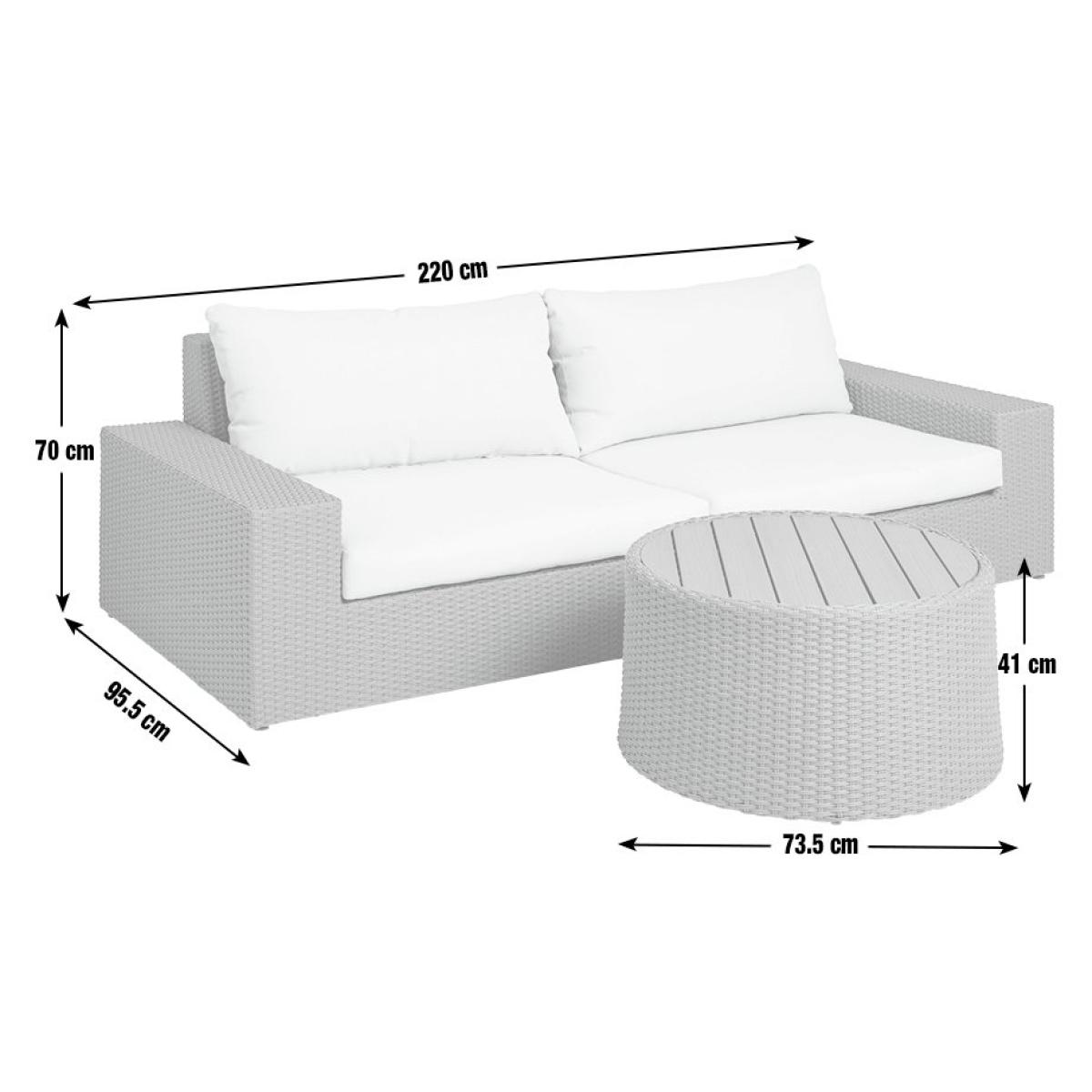 A mix of comfort and style makes for relaxed outdoor living. And our June rattan effect 2-seater outdoor sofa and table gives you both in bundles. Look at the natural, woven finish and the planked style table top. Small details that uplift the look. While 4 foam filled sofa cushions are perfect to nestle in and chat with friends. Warm, textural, timeless. Tempted? Part of the June collection. Parasol not included. Includes 4 cushions. General features: Set seats 2 people. Set made from rattan effect and polyethylene. Store inside when not in use. Cover or store inside in winter months to prolong life of the products. Total weight 47.84kg. Garden table features: Plastic table top. Table size: H41,. Table diameter: 73.5cm. Sofa features: Sofa size H70, W220. D95.5cm. 220kg maximum user weight per sofa. Cushion features: Recycle Solution dye polyester and Beige cushions. Removable covers. Washable covers. Remove cushions when not in use and store inside. Packaging information: Package 1 size H53, W225, D99cm. Package 1 weight 50.2kg. Package 2 size H44.5, W76, D76cm. Package 2 weight 13.2kg. General Information: Self-assembly - 2 people required. Manufacturer's 1 year guarantee.