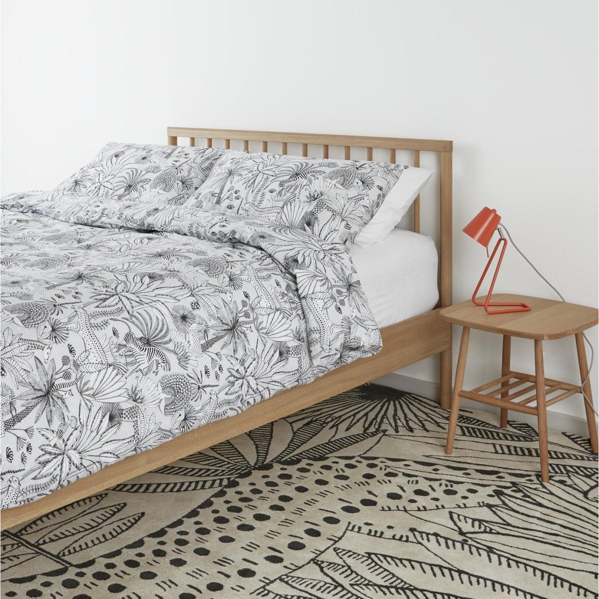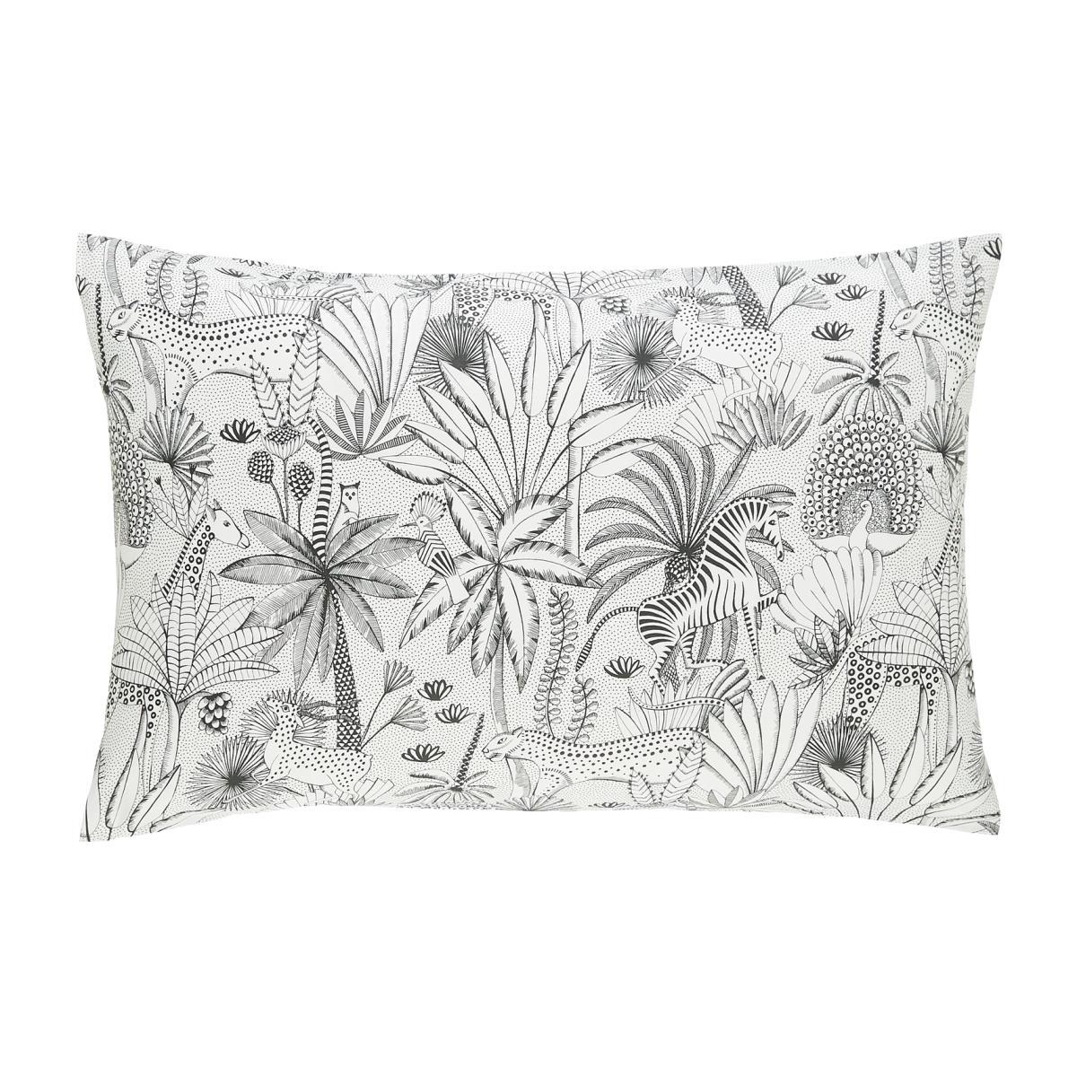 Add a tropical touch to your bedroom with the Jungle black and white printed cotton pair of rectangular pillowcases. Made in India from 100% cotton, this set depicts wildlife animals amongst palm trees and greenery in a monochrome design and sits against a white cotton base. With a 180 thread count, these breathable and lightweight pillowcases will add a cosy feel to your space and is easy to care for. An original Habitat design, Jungle comes in various sized sets and a co-ordinating cushion and rug are also available.