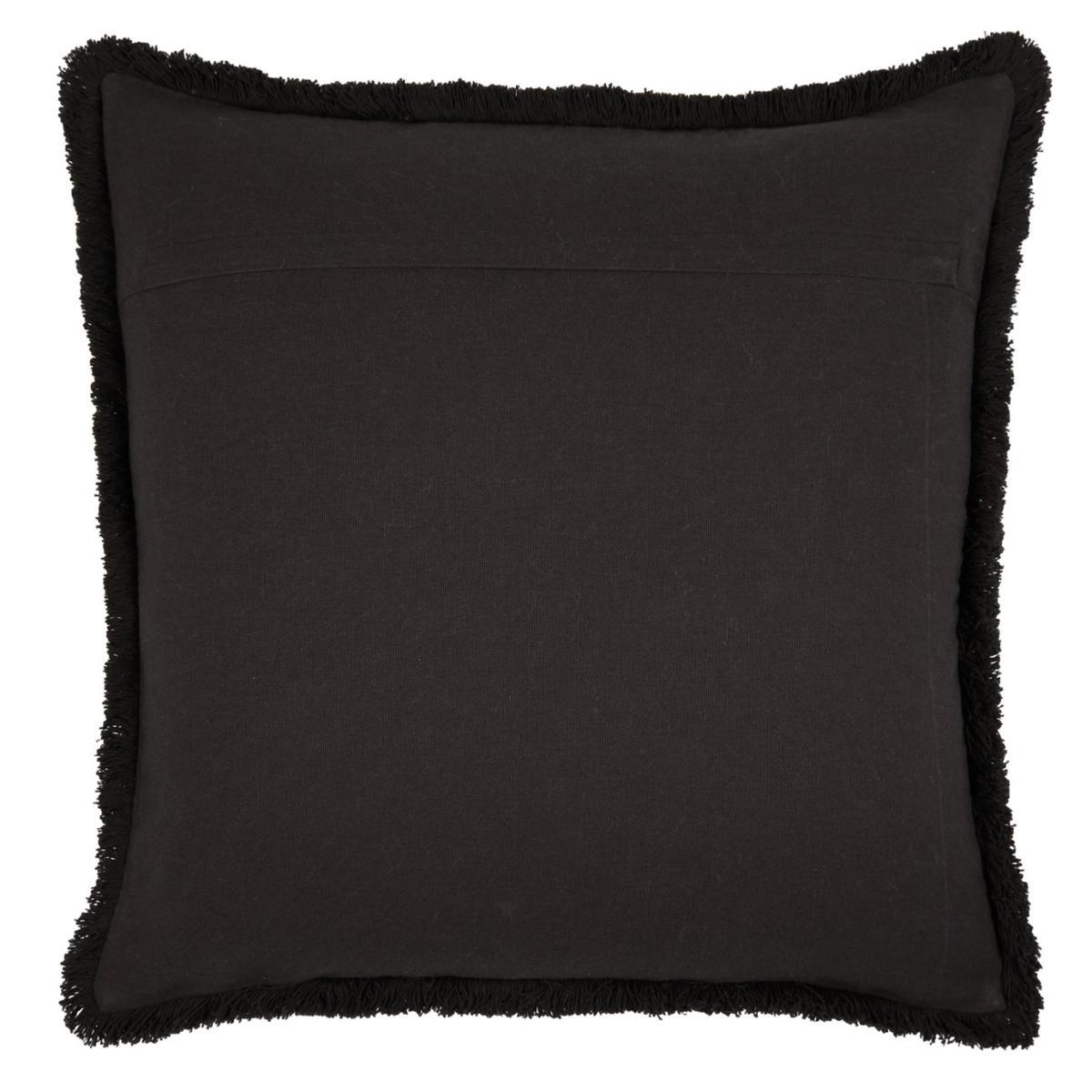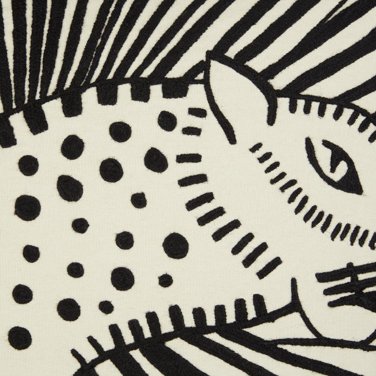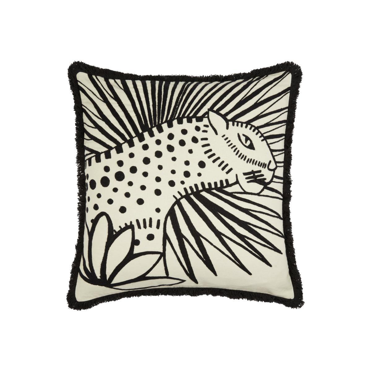 Update your bed or sofa in style with the Jungle black embroidered cushion with trim. Inspired by the jungle, this cushion depicts a cheetah amongst palm trees in a stylish monochrome design and sits against an off-white cotton base. Made in India from 100% cotton, this cushion will provide maximum comfort and is finished with a contrasting black fringe trim. If you cant get enough of this fun, lively design, its also available as a bedding set and rug. Zip fastening. Cover 100% cotton. Size L50, W50cm.
