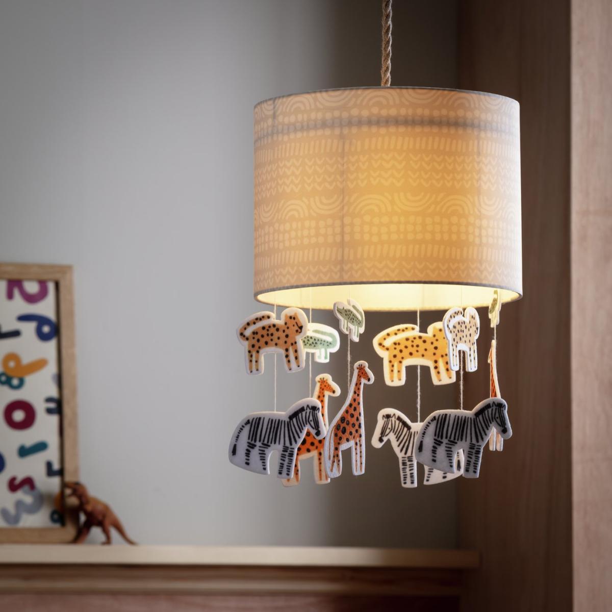 This jungle-themed lampshade is a charming addition that adds a playful yet stylish touch to a nursery or child's bedroom. I love how the hanging animals bring a whimsical element without overwhelming the space, making it perfect for adding character to more neutral or modern interiors. It works particularly well in a decor scheme that includes natural textures or muted colours, where it can act as a fun focal point. For styling tips, consider pairing it with soft pastel or earthy tones to highlight the playful animal motifs, and hang it at a height where the hanging decorations can be appreciated. This little detail can help create a cosy, inviting atmosphere while adding a touch of fun to the room.