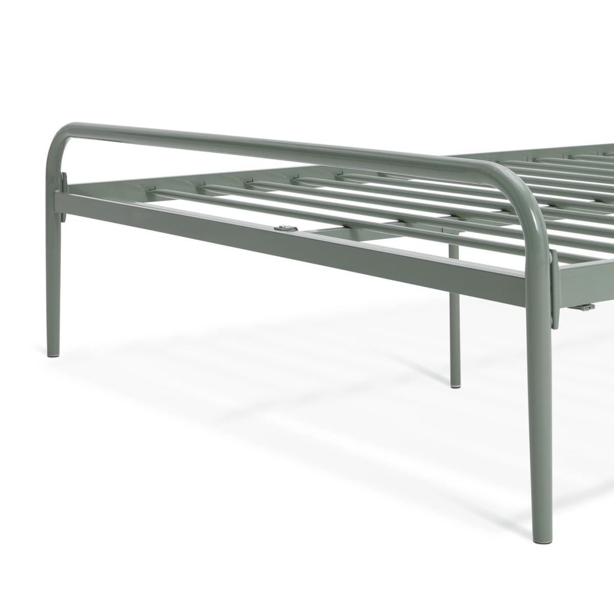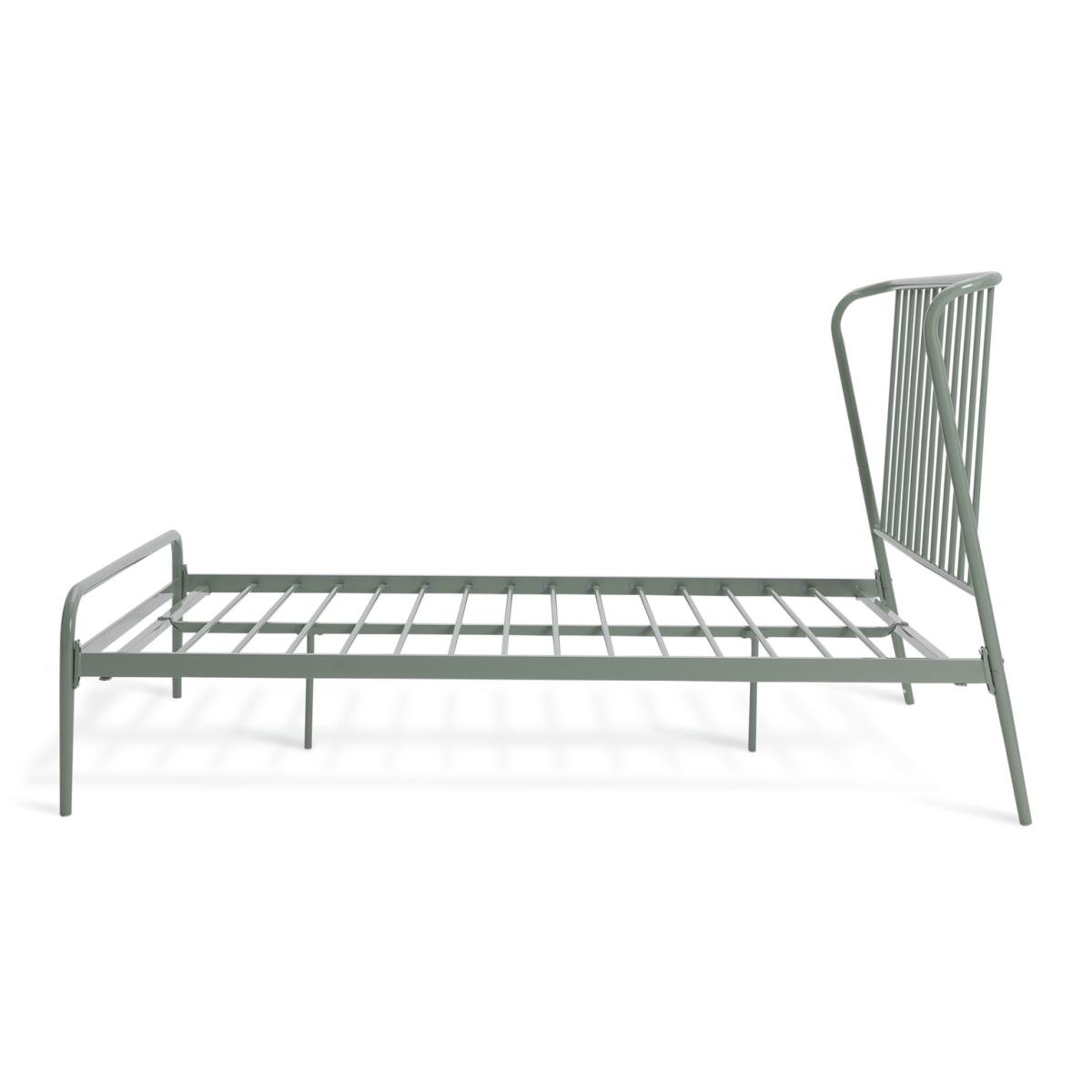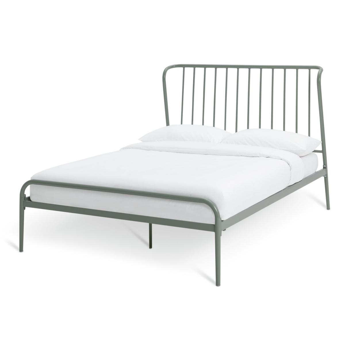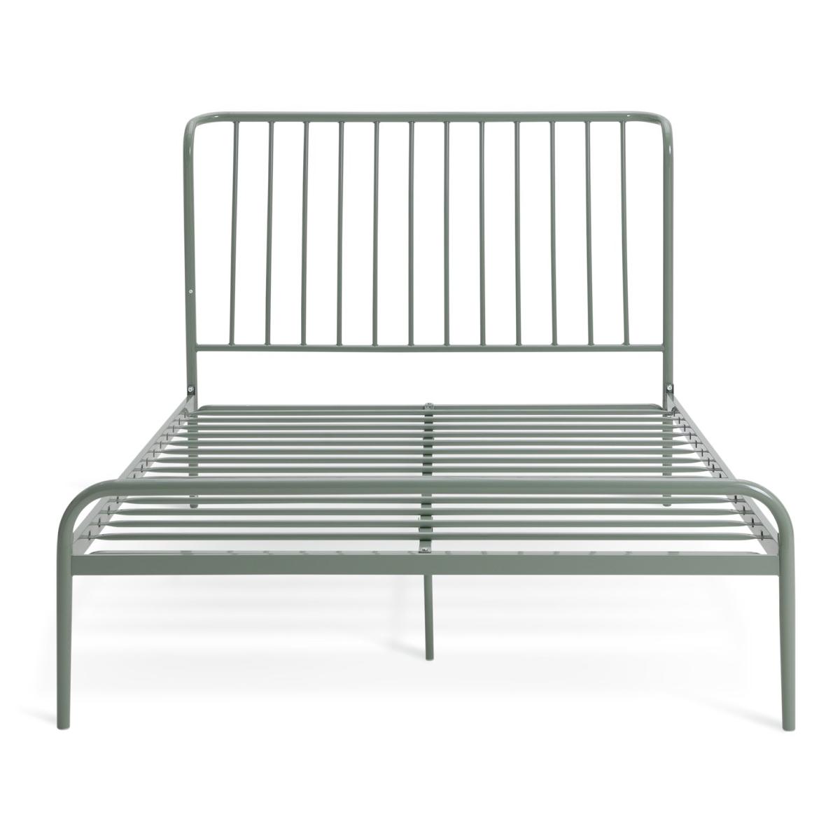 Like the light industrial look? Check out the architectural vibe of our Kanso double bedframe. With a distinctive fixed angled headboard, just plump up your pillows and lean back for the perfect reading position. Very clean and very contemporary in a sage green metal finish. Keep it minimal with crisp white linens or maximise its style with cushions in rich textures and colours. Either way it's a statement piece. Fixed metal slats with central support legs offer firm support and strength. Part of the Kanso collection. Metal frame. Metal feet. Base with metal slats. Size W142.2, L203, H110cm. Height to top of siderail 33.4cm. 30cm clearance between floor and underside of bed. Weight 20.7kg. Total maximum user weight 220kg. Self-assembly - 2 people recommended. Package Dimensions: Package 1 dimensions: H24.5, W84, D146cm. Package 1 weight: 16.7kg. Package 2 dimensions: H7, W13.5, D201cm. Package 2 weight: 8.2kg. General Information: Manufacturer's 2 year guarantee.