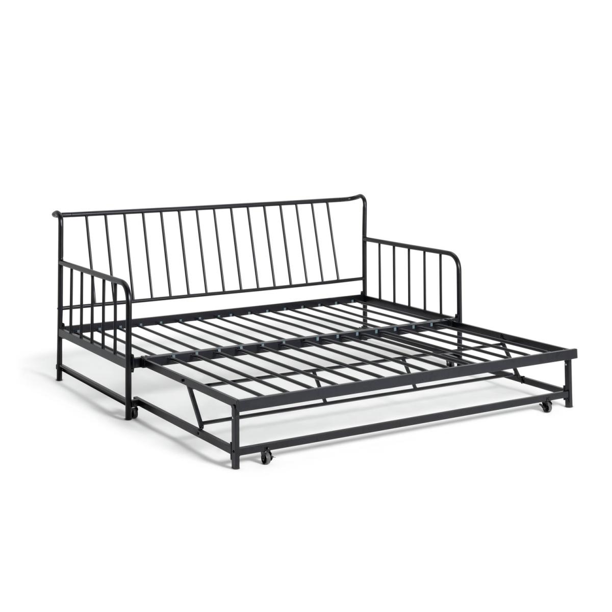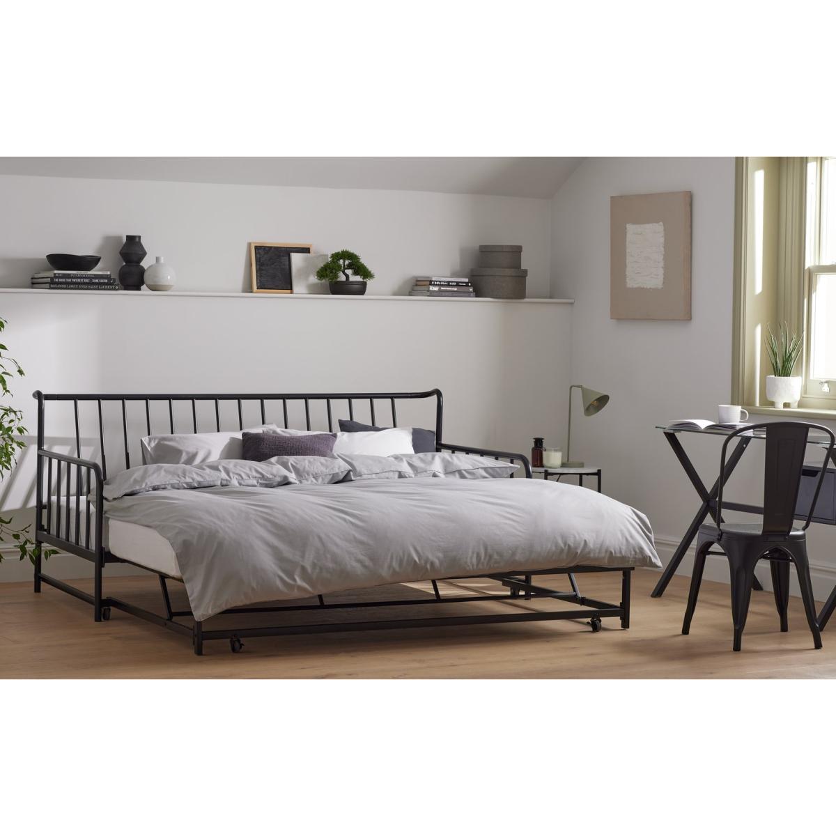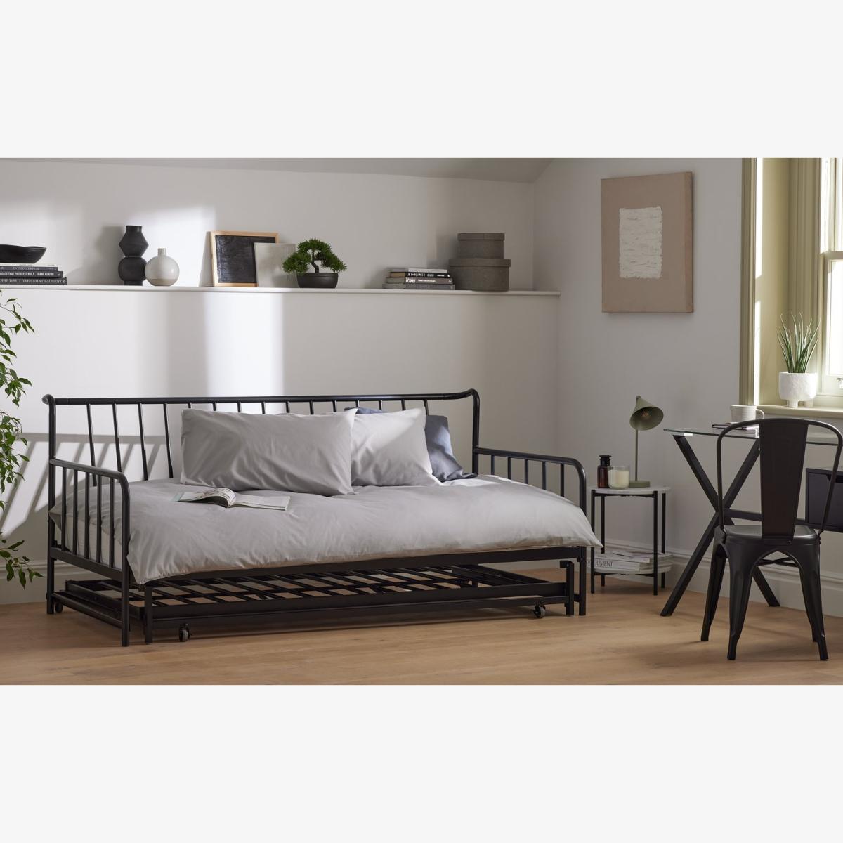 Short on space? Our futon-esque trundle bed frame can be a sofa or overnight sleeper for 2. We're big fans of its space-saving design. Overnighters due? Wheel out the trundle and voila, a twin bed sleep space at the ready. Easy, instant bedtime bliss. Clever Kanso. Now just add mattresses to this clever frame and you're done. We have plenty for you to choose from. Part of the Kanso collection. Metal finish. Model number: 3086430. Supplied with metal slats. Dimensions: Main bed size W114.7, L194.8, H87.9cm. Main bed max. User weight 110kg. Package Dimensions: Package 1 dimensions: H15, W73, D203.5cm. General information: Suitable for everyday use. Self-assembly : 2 people recommended. Manufacturer's 2 year guarantee.