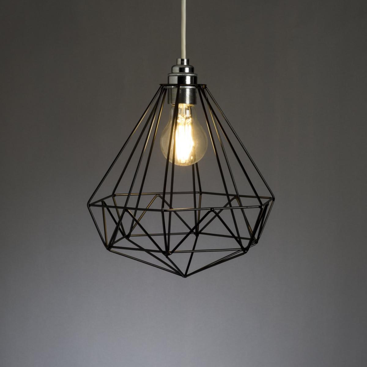 Geometric design makes a bold entrance with this strking pendant shade. With its black steel finish it celebrates the brilliance of feature bulbs, exposing the bulb for a clean understated look. Designed to cast bright light across your room, the Kanso wire pendant shade is a must for any modern on-trend space. See the rest of the Kanso collection to complete the look.