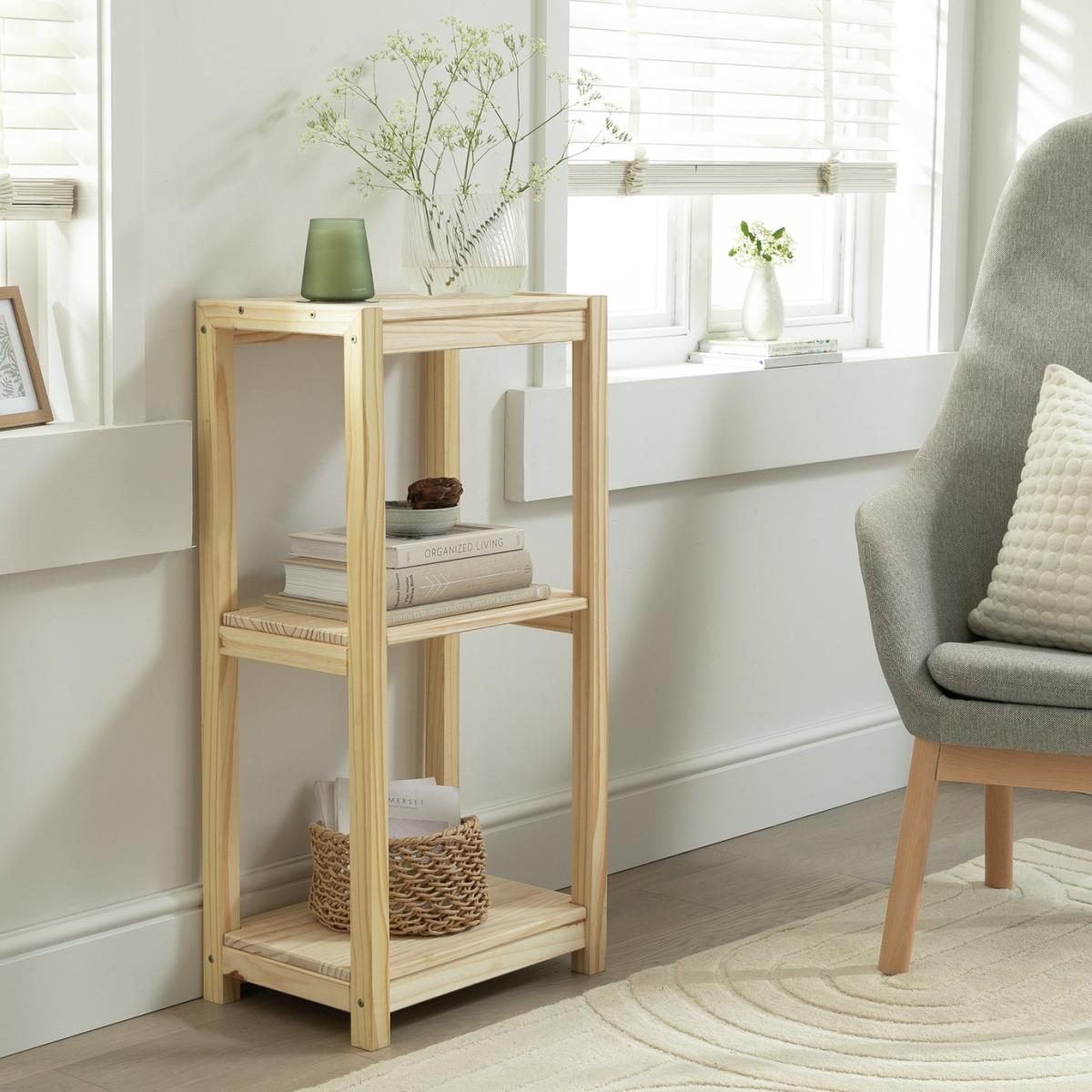 Max out your floorspace with clutter free Karee. The 2 tiers of solid natural pine shelving give you an extra boost of storage and display space. Box files, books and beautiful blooms. Stain it, paint it, dress it, fill it, enjoy it. Part of the Habitat collection. Made from solid wood. 2 Fixed shelves. Packed flat - 1 person recommended. If this product is over 60cm high it must be securely attached to the wall to prevent overturning (fixings included). Dimensions: Size: H90, W45, D30cm. Weight: 8kg. , ideal for any cube storage boxes up to H34, W38, D23cm. Package Dimensions: Package 1 dimensions: H12.6, W95.6, D34.6cm. Package 1 weight: 8.27kg. FSC certified meaning the materials used for this product are responsibly sourced.