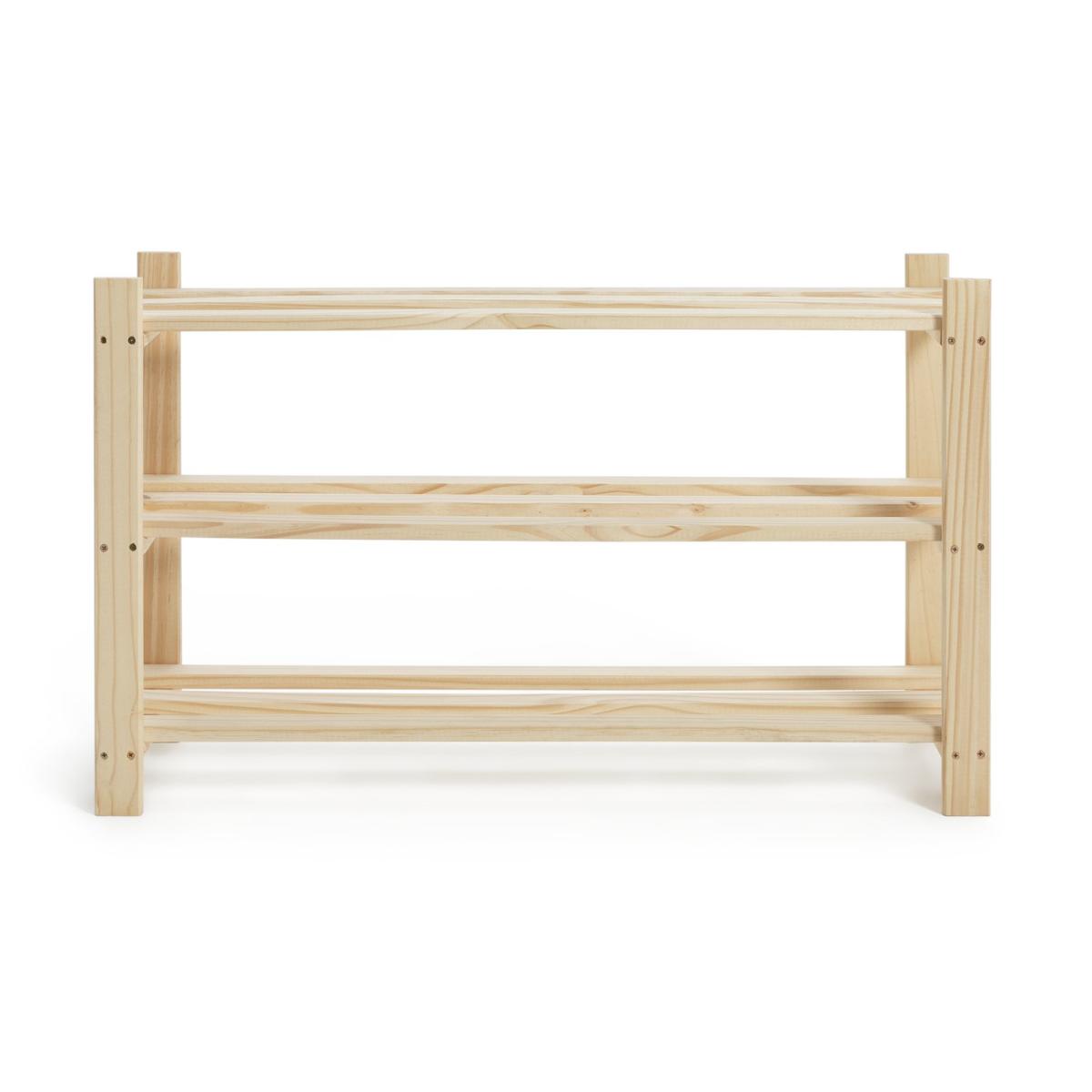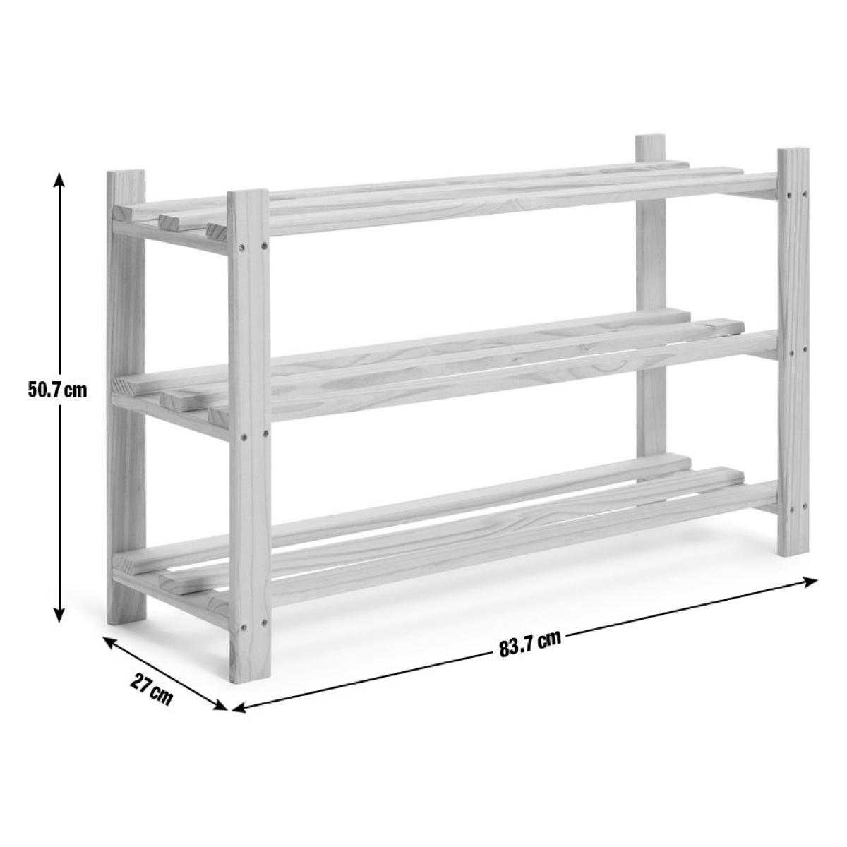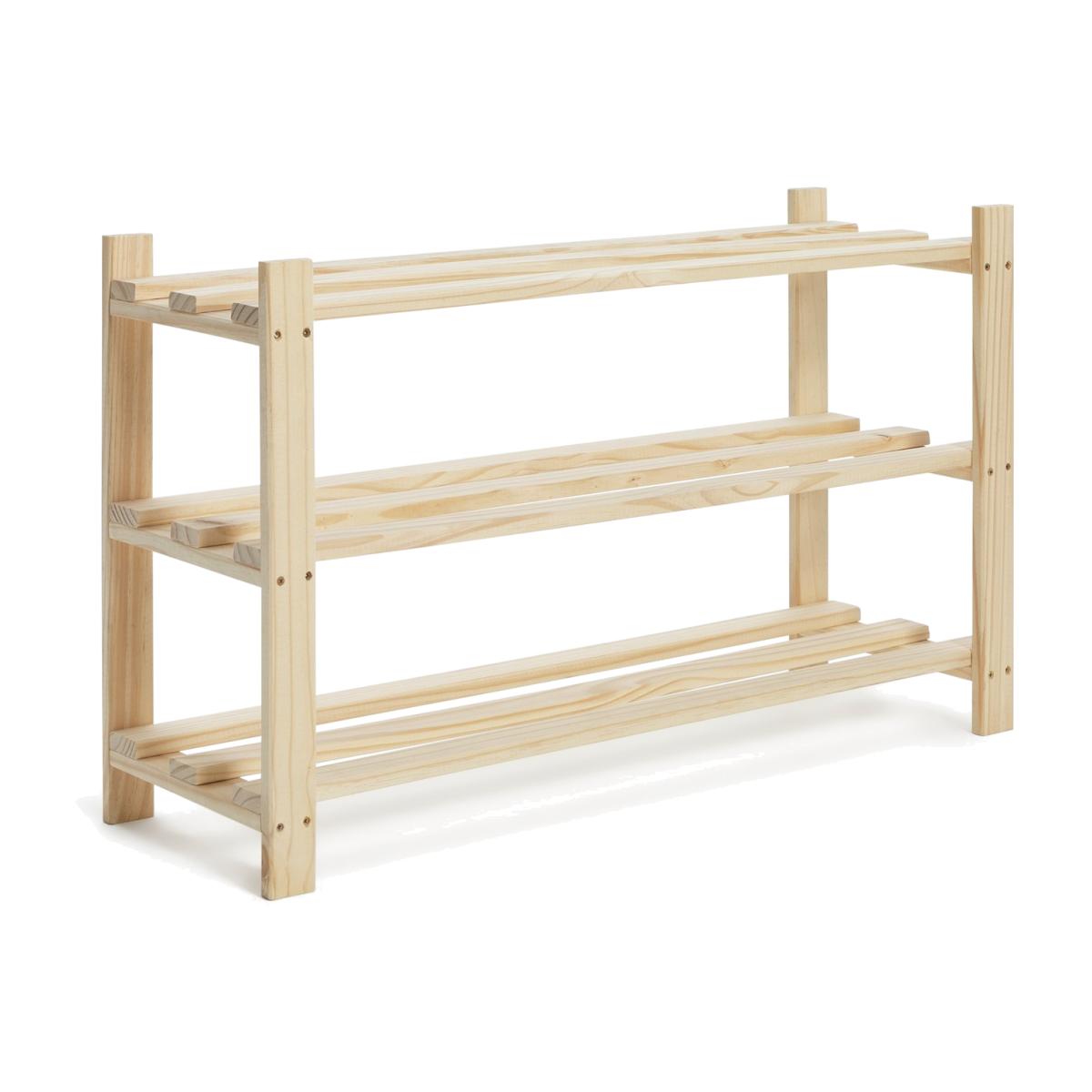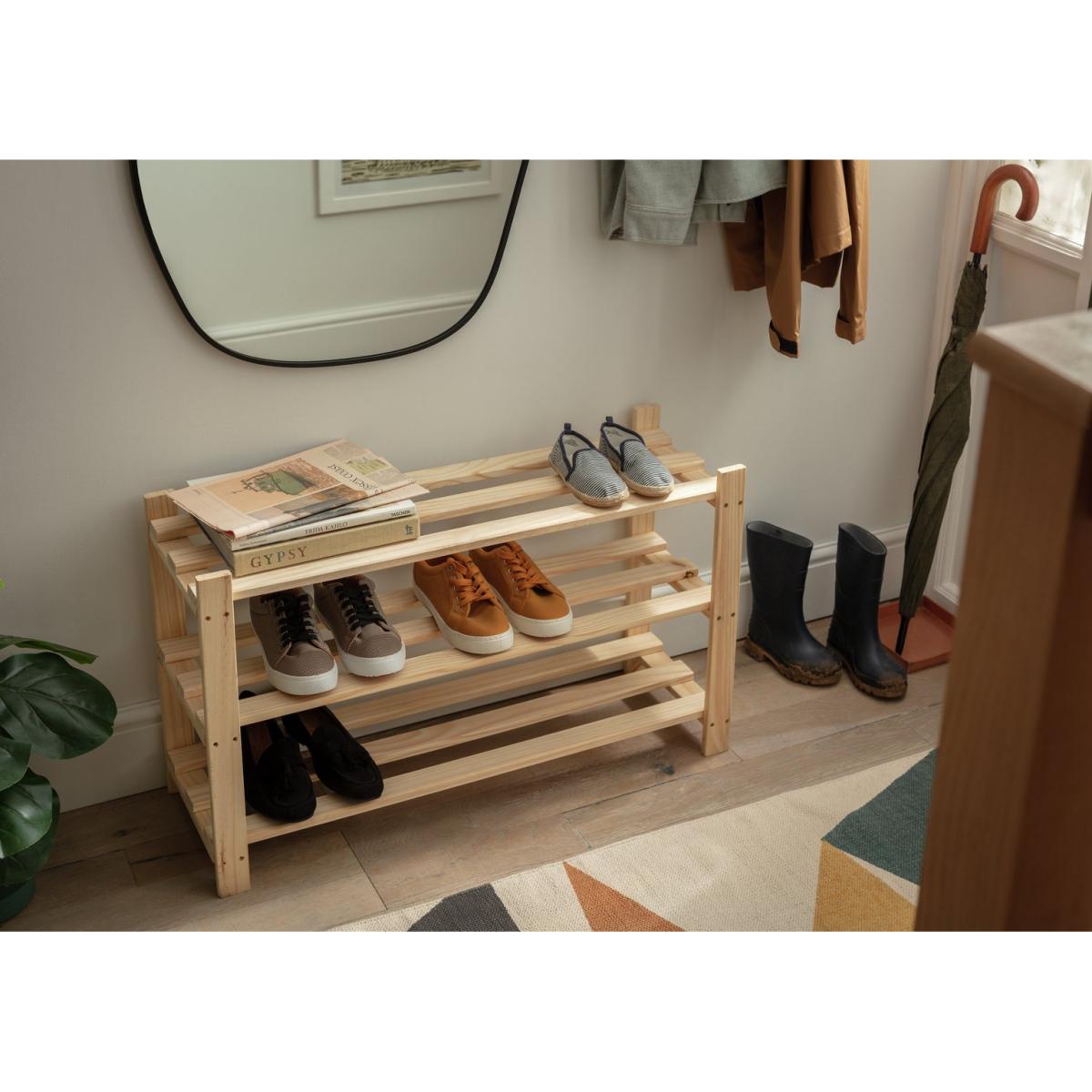 It's shoe time! Put your best foot forward with this 3-tier pine wood shoe rack. There's plenty of room to get at least 9 pairs neatly organised. On show and ready to go. Saves hunting in the bottom of the wardrobes, or under the bed for your favourite footwear. In natural pine our Karee slips into any decor. Rack it up. Part of the Habitat collection. Made from pine with a solid wood finish. Stores an average of 9 pairs of shoes. Up to maximum shoe size 10. 3 fixed shelves. Size H50.7, W83.7, D27cm. Weight 3kg. Packed flat. Package Dimensions: Package 1 dimensions: H8, W25.5, D90cm. Package 1 weight: 3.2kg. FSC certified meaning the materials used for this product are responsibly sourced. General information: We are excited to be welcoming some of our favourite HOME products into the Habitat range. Your product may arrive in Habitat or HOME packaging.