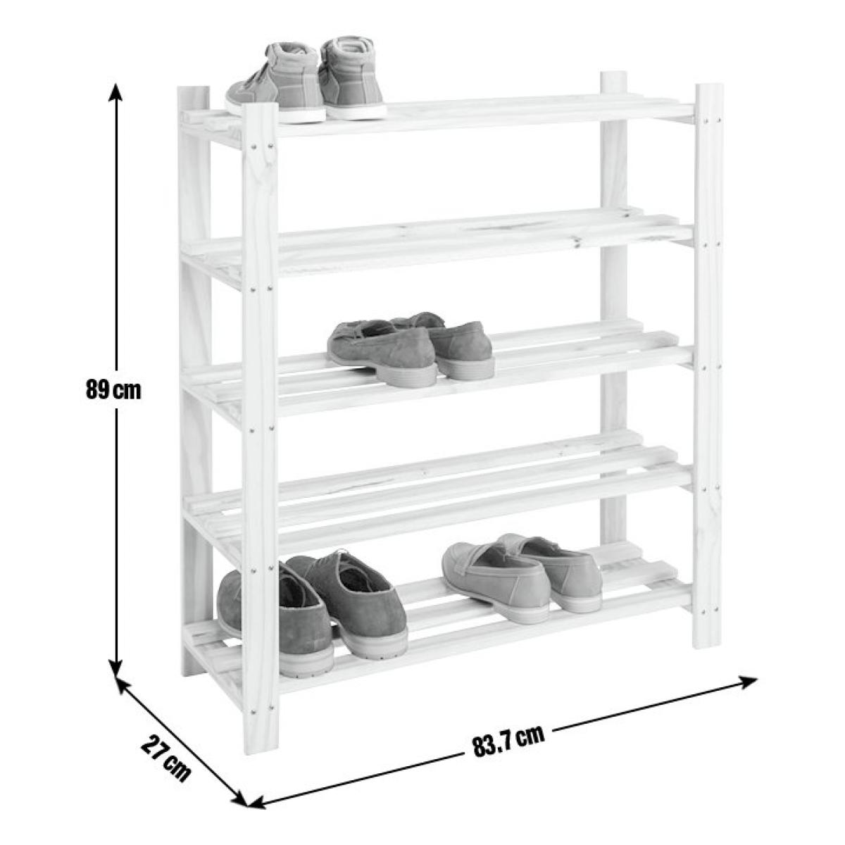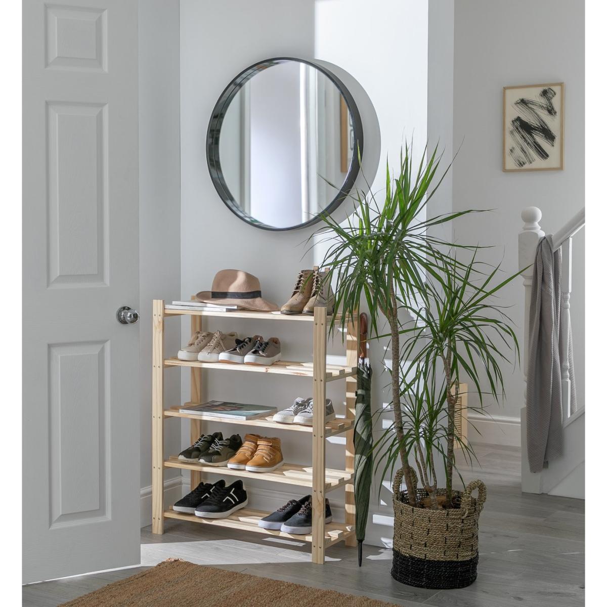 It's shoe time! Put your best foot forward with this 5-tier pine wood shoe rack. There's plenty of room to get at least 15 pairs neatly organised. No more hunting for footwear in the bottom of wardrobes or under the bed. All your favourites are on show and ready to go. Part of the Habitat collection. Made from pine with a solid wood finish. Up to maximum shoe size 10. 5 fixed shelves. Size H89, W83.7, D27cm. Weight 5kg. Packed flat. Package Dimensions: Package 1 dimensions: H12, W25.5, D90cm. Package 1 weight: 5.6kg. FSC certified meaning the materials used for this product are responsibly sourced. General information: We are excited to be welcoming some of our favourite HOME products into the Habitat range. Your product may arrive in Habitat or HOME packaging.