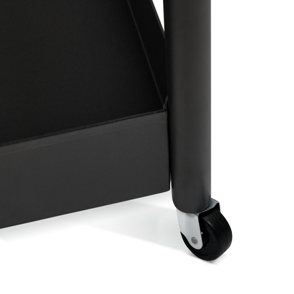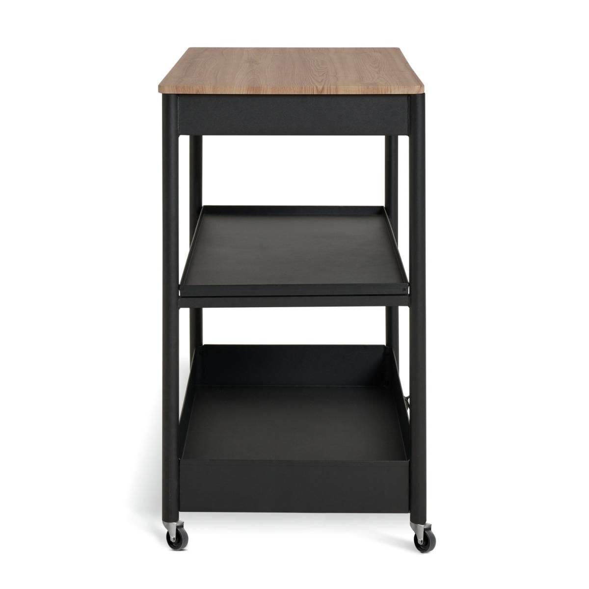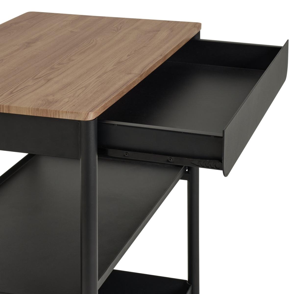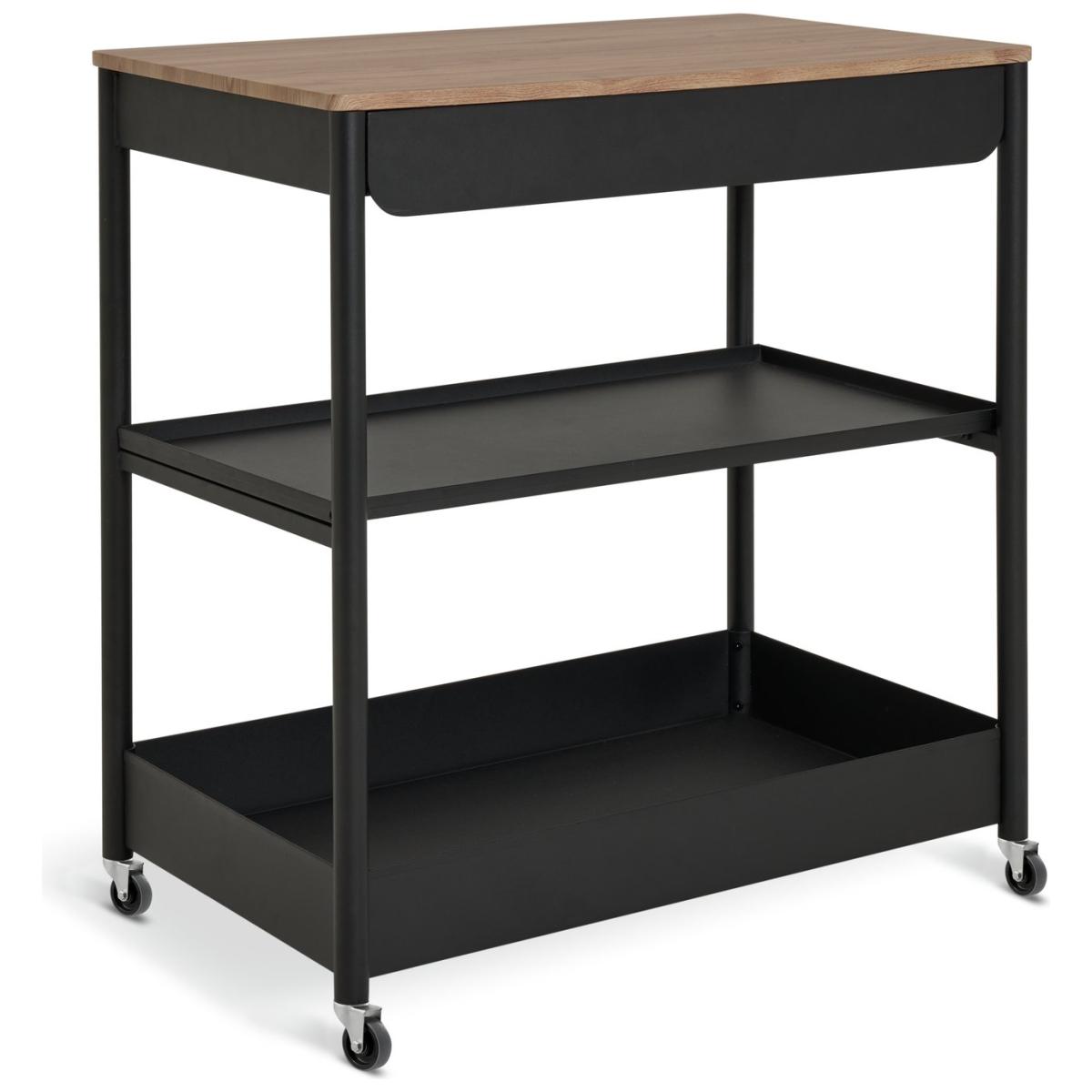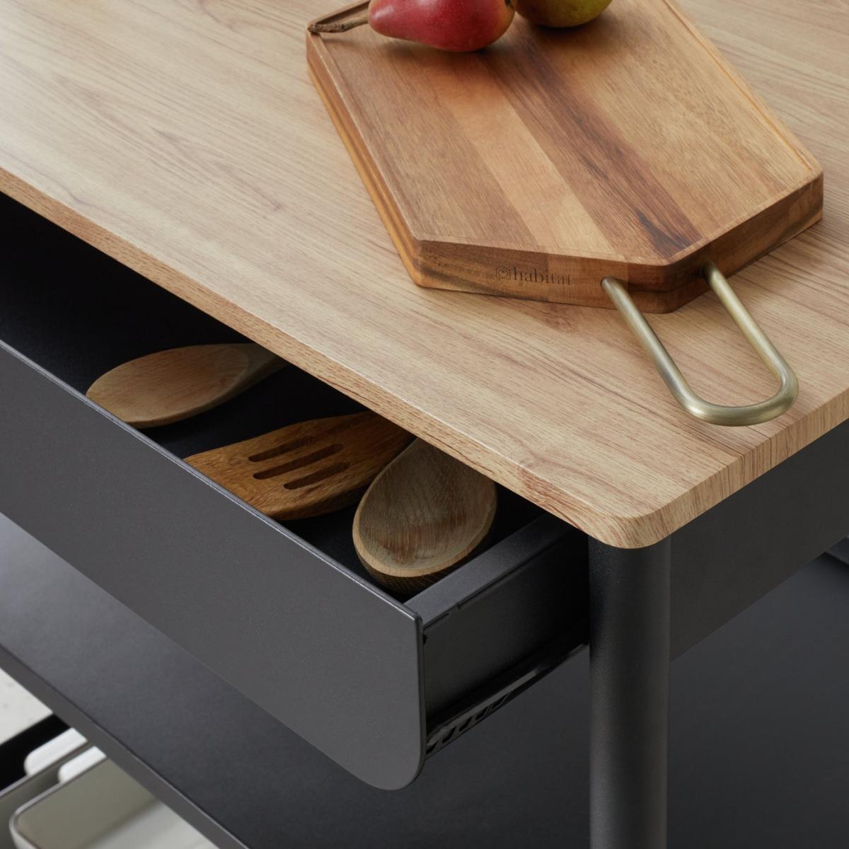 The Kaylo kitchen trolley provides plenty of extra space. Easy to wheel from one place to another in lightweight steel, with a wheel lock to keep it secure. With a high-sided base for bottles and a hidden drawer beneath the wood effect surface, Kaylo is totally versatile. Extra storage for utensils, appliances or somewhere to keep oils and vinegars? Maybe spirits, mixers and cocktail shakers? You choose. Part of the Kaylo collection. Made from metal and MDF. Wood effect top. 2 shelves. 1 drawer. Metal. (knives not included). Metal handle. Mounted on castors for easy maneuverability. General information: Self-assembly. Size H88, W83.5, D50.5cm. Shelf size H2.5, W81.5, D43cm. Drawer size H7, W70.5, D35cm. Basket size H10.5, W80, D47cm. Manufacturer's 1 year guarantee.