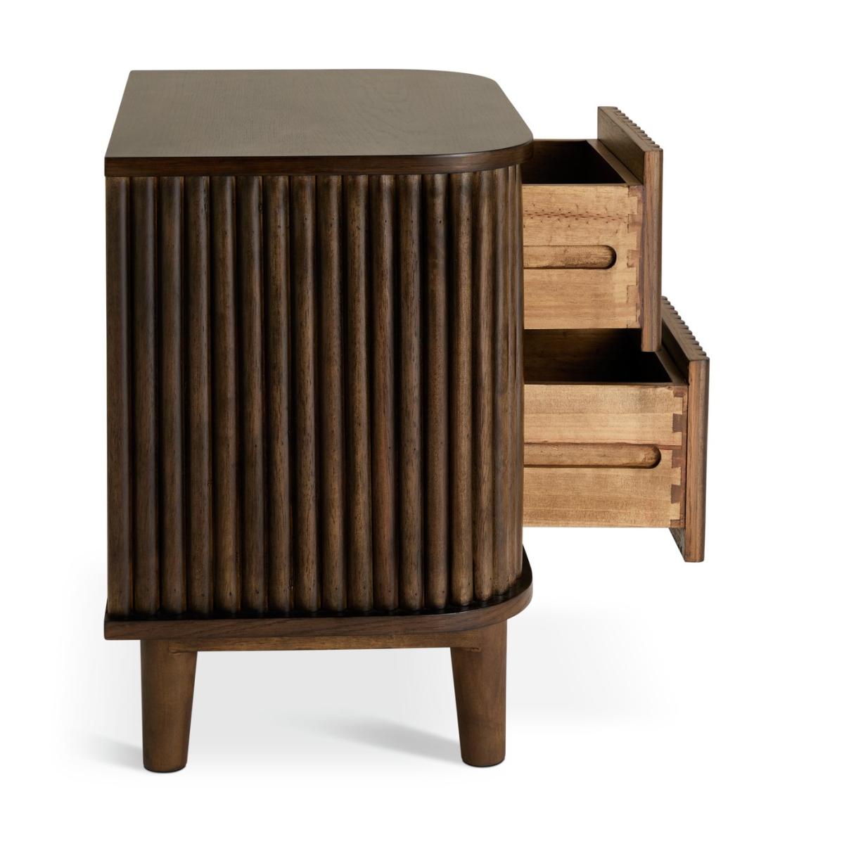 For lovers of mid-century modern style, our Kendi side table is a real temptation. A fluted finish looks spectacular and comes in a rich and warm walnut stain. While 2 drawers provide space for everyday essentials. The entire piece is about sweeping soft, wooden curves. This multifunctional, agnostic furniture can be used sofa side or bedside. We love Kendi. Part of the Kendi collection. Size H 50, W 50, D 35cm. Made from solid wood and MDF. 2 drawers with wooden runners. Weight 24kg. Self-assembly - 1 person recommended. Maximum load weight 30kg. Package Dimensions: Package 1 dimensions: H58, W58, D43cm. General information: Manufacturer's 2 year guarantee. FSC certified meaning the materials used for this product are responsibly sourced.