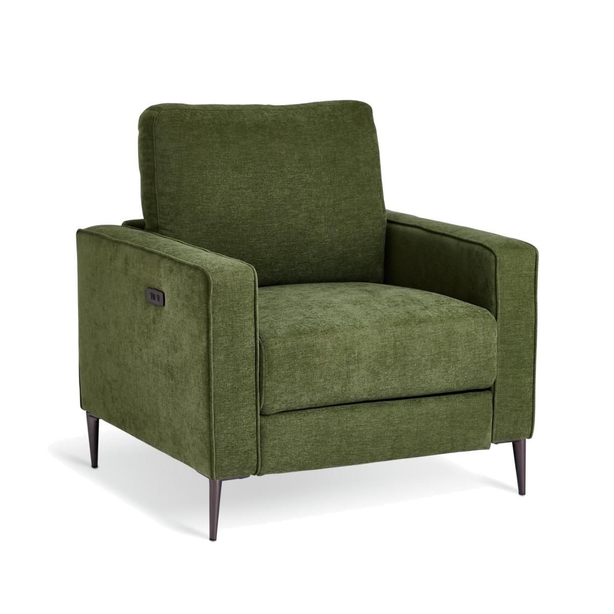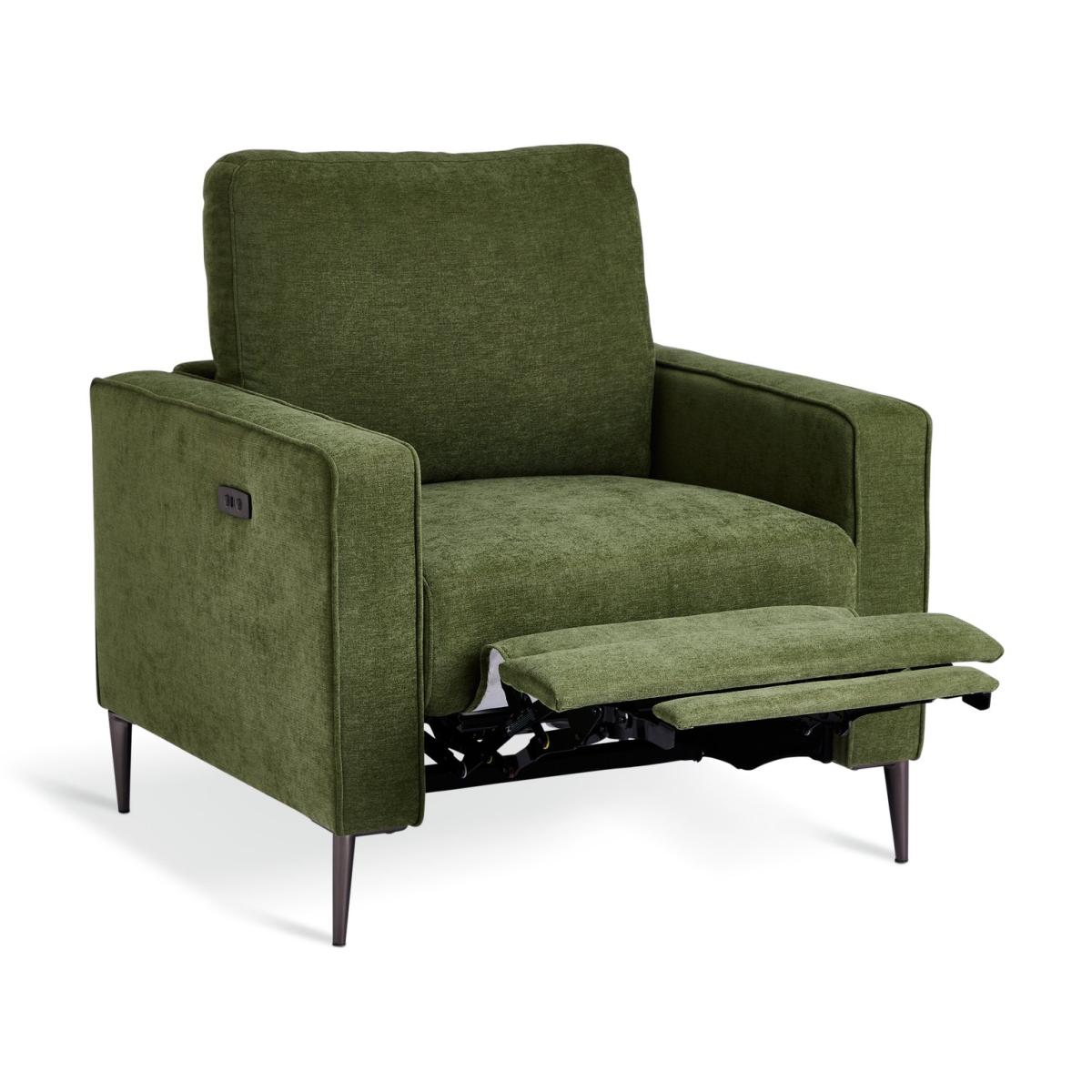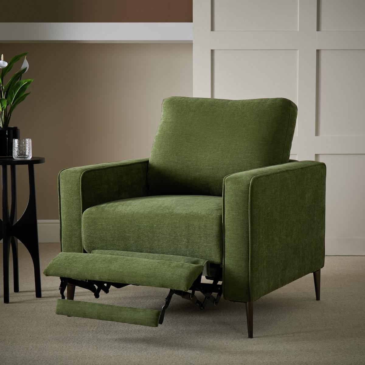Merging mid-century looks with modern convenience. Relax, this armchair knows a thing or two about style and comfort. First the style. The rich green chenille fabric whispers softness, while the slim metal legs add a touch of contemporary flair. Now the comfort. Simply press a button and this power recliner goes into action. The footrest automatically comes out so you can lay back and just be. Part of the Kendric collection. Power recliner. Material: Made from 100% polyester. Metal feet. Fixed seat with pocket sprung foam filling. Free fabric swatch available on this line. Dimensions: Size H92, W89, D82cm. D126cm. Floor to seat height: 50.5cm. Depth of seat: 50.5cm. Height of seat back: 44cm. Width of seating area between arms: 61cm. Height of arm rest: 63cm. Weight: 37.25kg. Packaged dimensions: Package size H56, W92, D84cm. General information: FSC certified meaning the materials used for this product are responsibly sourced. Professional clean only. Self-assembly. Maximum individual user weight 110kg. Mains operated. Manufacturer's 2 year guarantee.