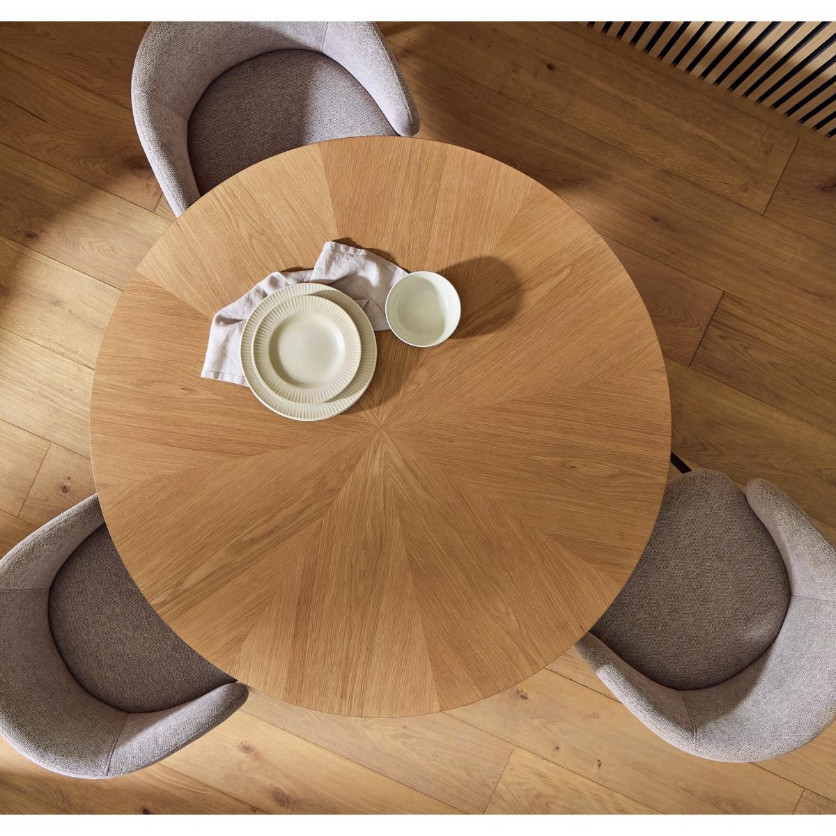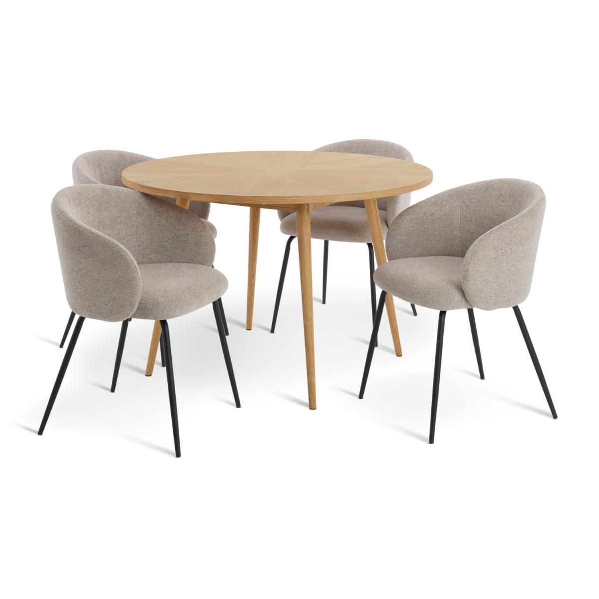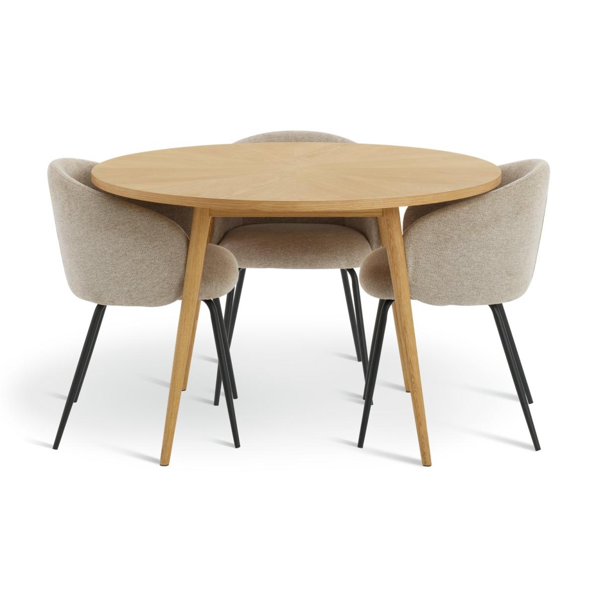Clean lines meet cosy mealtimes. The natural oak veneer of our Kenha round dining table creates a warm, welcoming feel. Soft bucket seats are upholstered in a natural fabric. Set on slim black metal legs, the 4 chairs add an airy, effortless vibe. Just the right touch of comfort for lazy breakfasts and extended dinnertime chats. Everyday dining the Scandi way. Part of the Kenha collection. Table: Table size H75, D120cm. Oak veneer table with oak veneer legs. Oak table top finish. Self-assembly - 2 people recommended. Chair: Includes 4 chairs. Size of each chair H79, W55.5, D55cm. Seat height 49.5cm. Metal frame with metal legs. Fabric seat pad. Maximum user weight per chair 110kg. Individual chair weight 16.1kg. Package Dimensions: Table package 1 size H11.5, W128.5, D128.5cm. Individual chair package size H58.5, W57, D67cm. General information: Manufacturer's 1 year guarantee. Dust or wipe with a damp cloth only. By choosing FSC certified products, you are supporting responsible management of the world's forests.