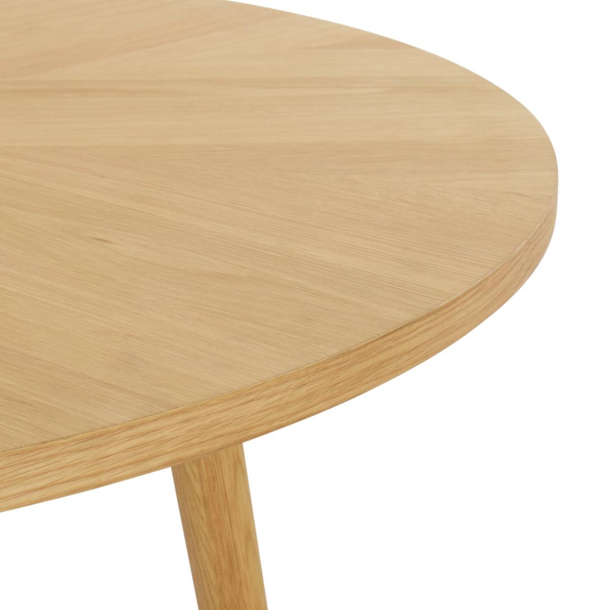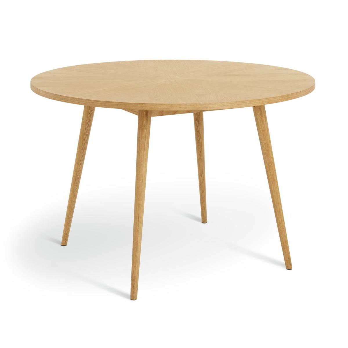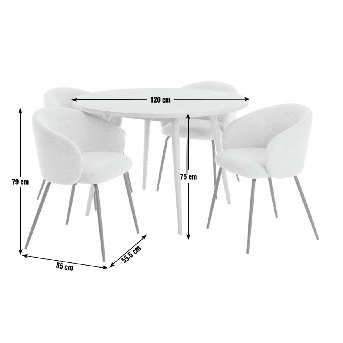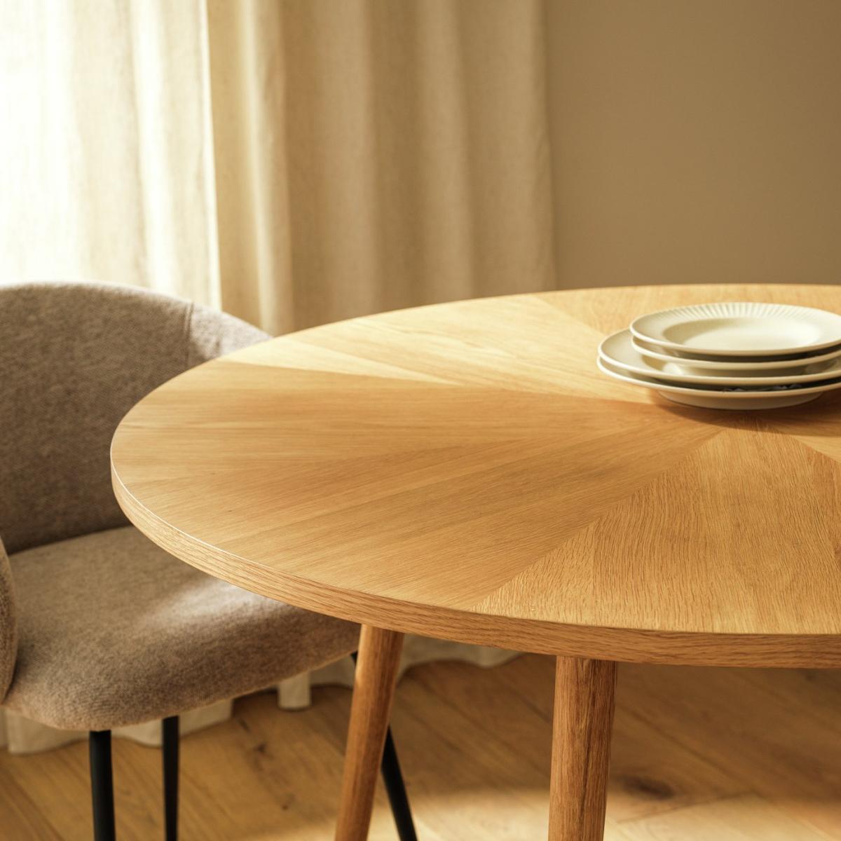 Clean lines meet cosy mealtimes. The natural oak veneer of our Kenha round dining table creates a warm, welcoming feel. Soft bucket seats are upholstered in a natural fabric. Set on slim black metal legs, the 4 chairs add an airy, effortless vibe. Just the right touch of comfort for lazy breakfasts and extended dinnertime chats. Everyday dining the Scandi way. Part of the Kenha collection. Table: Table size H75, D120cm. Oak veneer table with oak veneer legs. Oak table top finish. Self-assembly - 2 people recommended. Chair: Includes 4 chairs. Size of each chair H79, W55.5, D55cm. Seat height 49.5cm. Metal frame with metal legs. Fabric seat pad. Maximum user weight per chair 110kg. Individual chair weight 16.1kg. Package Dimensions: Table package 1 size H11.5, W128.5, D128.5cm. Individual chair package size H58.5, W57, D67cm. General information: Manufacturer's 1 year guarantee. Dust or wipe with a damp cloth only. By choosing FSC certified products, you are supporting responsible management of the world's forests.