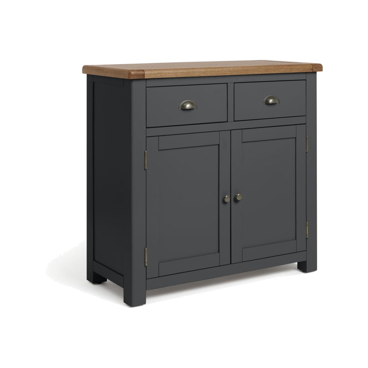 Inspired by country living. The Habitat Kent collection comes fully assembled, so you can put your feet up as soon as it arrives. Its chunky look with rounded edges make this a sturdy sideboard, ideal for a busy household. The surface shows off the natural grains and knots of the wood and the contrasting dark grey tone is warm and inviting. Perfect for cosying up a lounge. With 2 drawers and 2 cupboards, there's plenty of room to store anything from your finest crockery and glasses to files, books and stationery. The metal cup handles are a fabulous finishing touch for the Kent's classic look. Part of the Kent collection. Made from oak and oak veneer. Size H 85, W 89.6, D40cm. Antique bronze effect handles. 2 drawers with wooden runners. 2 doors. 1 fixed shelf. Weight 23kg. Fully assembled. If this product is over 60cm high it must be securely attached to the wall to prevent overturning. General information:We are excited to be welcoming some of our favourite HOME products into the Habitat range. Your product may arrive in Habitat or HOME packaging.