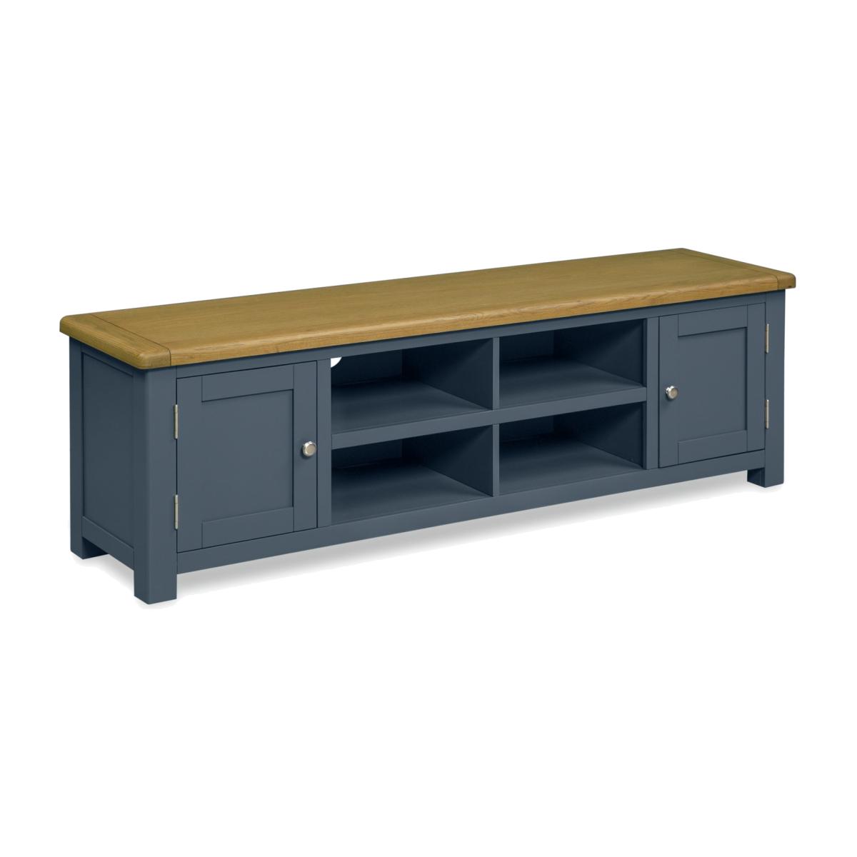 View your screen not your cables. Our wonderfully wide, Kent TV cabinet keeps wires and clutter hidden. Leaving you with a high tech screen, on a fine, classic dark grey-styled unit. It's all you need to house the home cinema and game centre. That's entertainment. 8 handy compartments, 2 behind doors are ideal for supplementary tech and video game controllers. Nice one. Part of the Kent collection. Made from oak and oak veneer. Size H 50, W 160, D 40cm. Weight 33kg. 8 shelves. 2 doors. 4 media storage sections. Largest height of media equipment sections 15.9cm. Easy cable access. Fully assembled - 2 people recommended. Package Dimensions:Package 1 dimensions: H56.5, W165.5, D45.5cm. Package 1 weight: 34kg. General information:We are excited to be welcoming some of our favourite HOME products into the Habitat range. Your product may arrive in Habitat or HOME packaging.